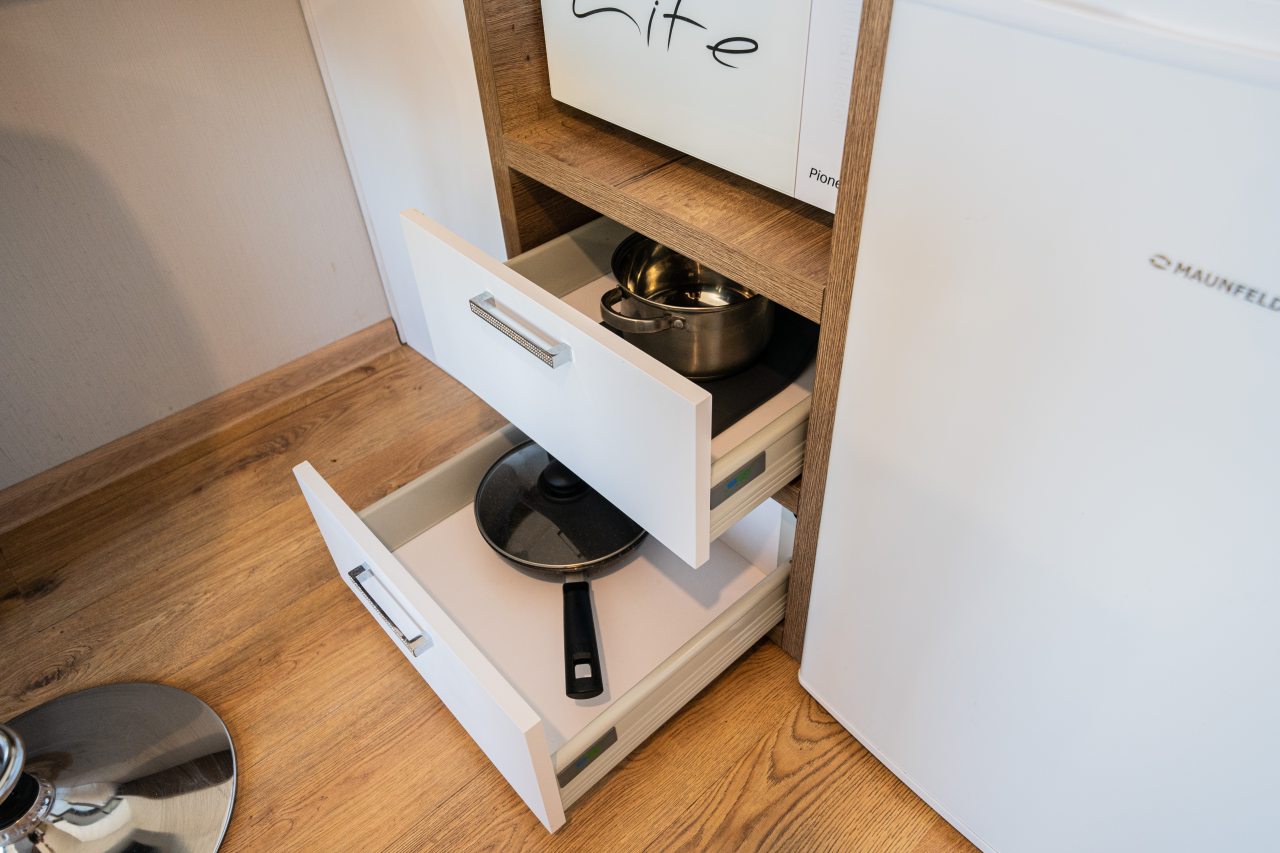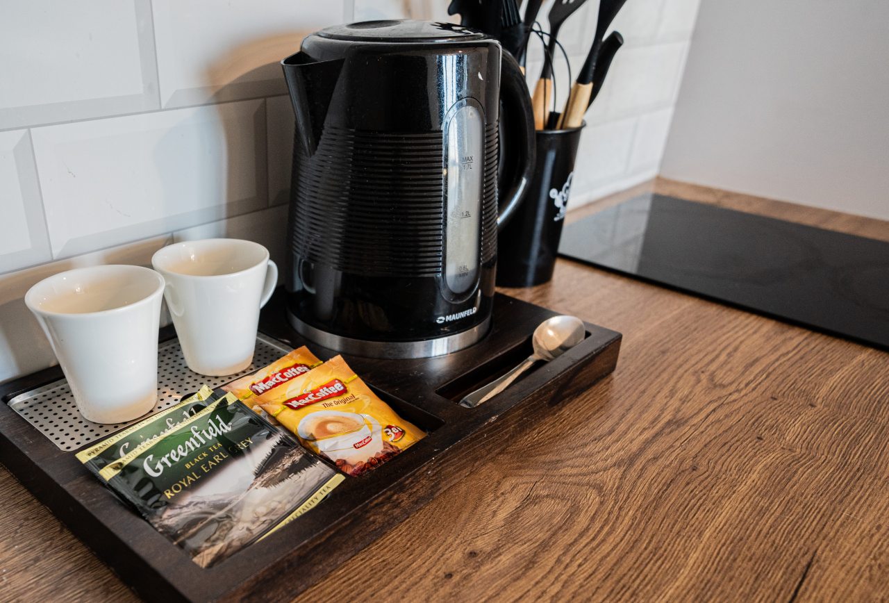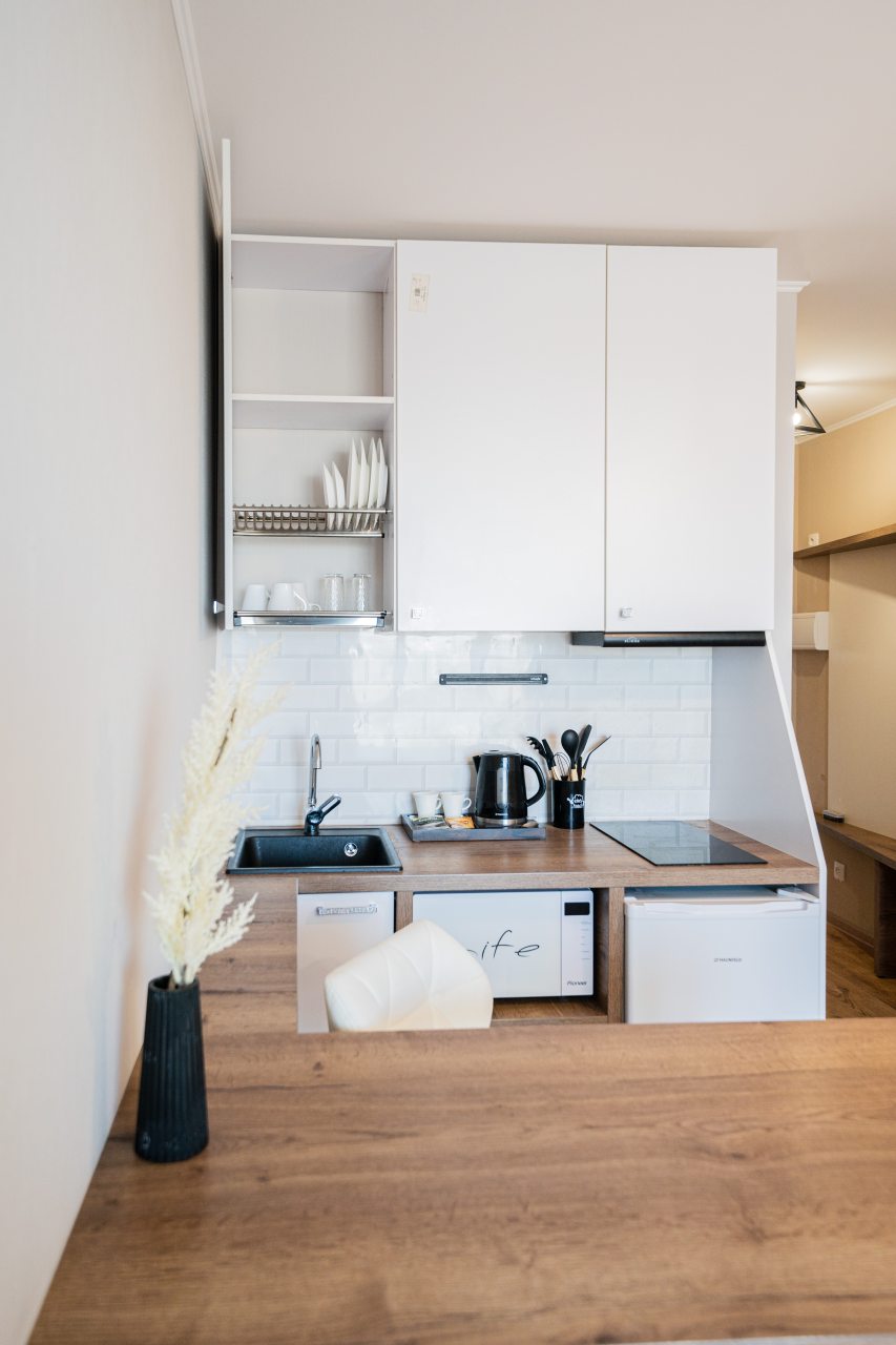 Кухонная зона оборудована микроволновой печью, электроплитой и чайником. Тем, кто не хочет готовить самостоятельно, можно дойти до кафе, которые находятся поблизости.