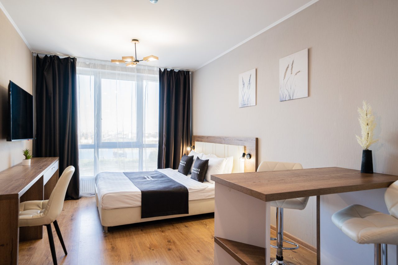 Отличные условия за достаточно низкую цену, если честно, были под впечатлением. Апартаменты современные и абсолютное новые, очень удобная кровать с белоснежным постельным бельем, кухня компактная и сделана органично, в ванной тоже без замечаний, есть и полотенца, и фен. Наши рекомендации.