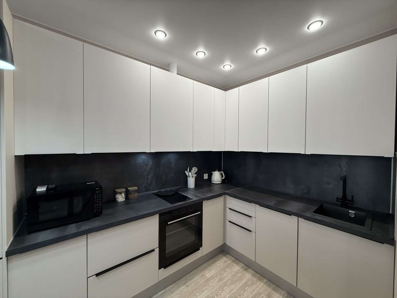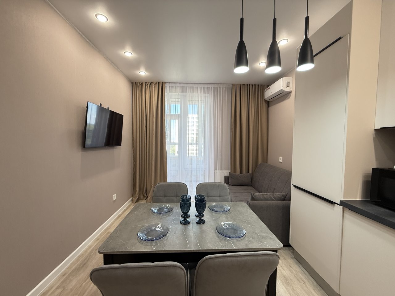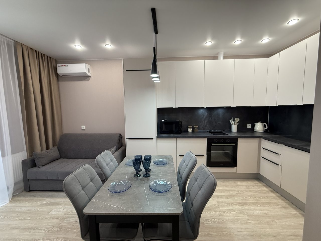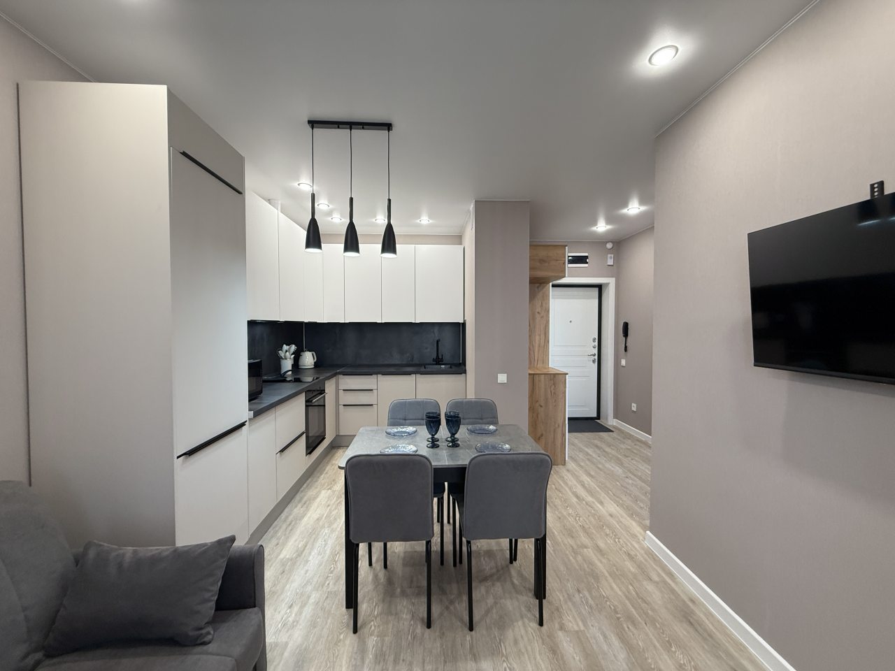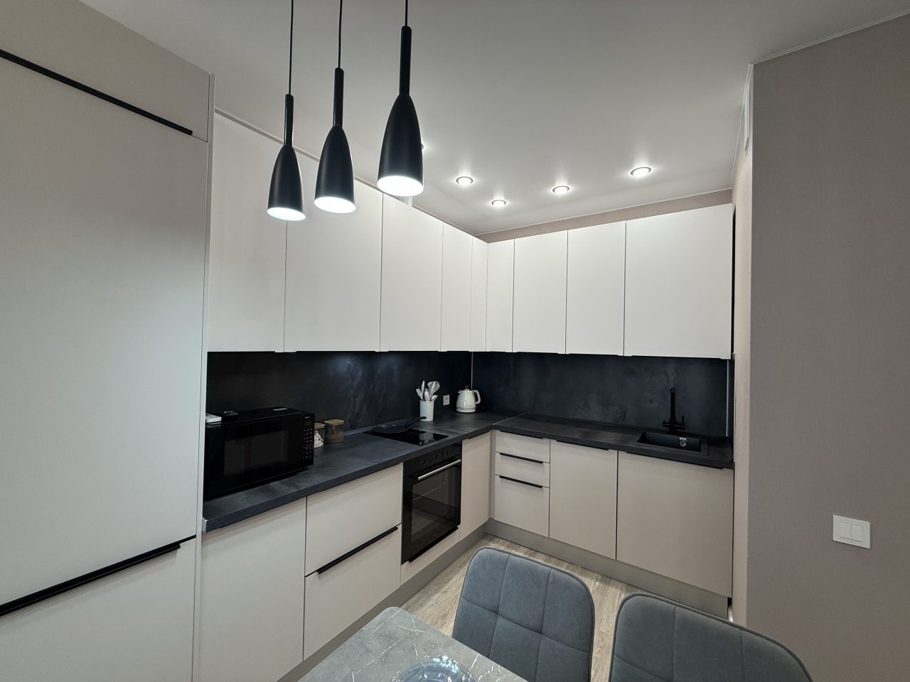 На кухонной зоне есть обеденный стол на четыре персоны и бытовые приборы для организации питания: варочная панель, микроволновая печь, холодильник. Поблизости работает продуктовый магазин «Магнит».