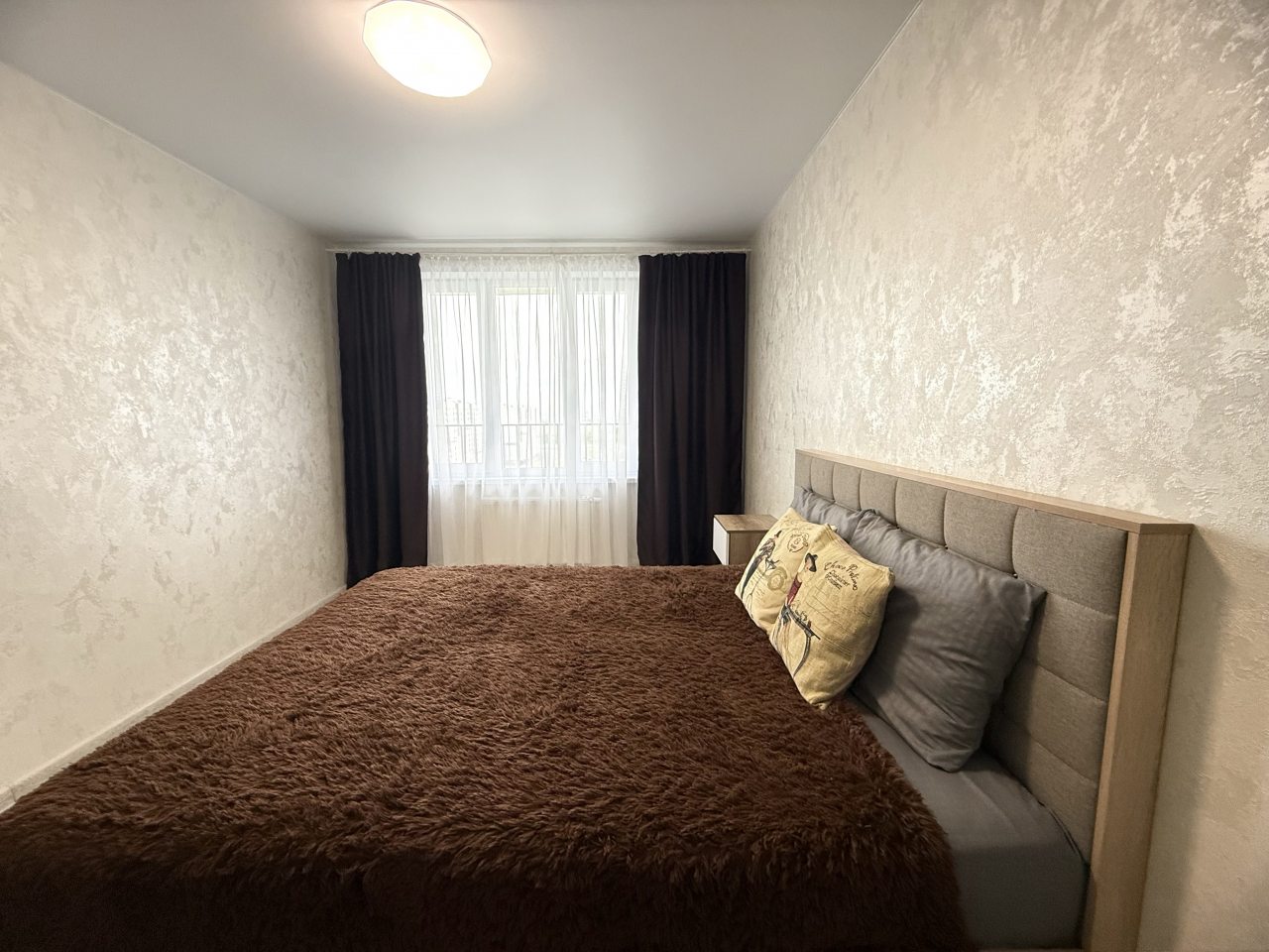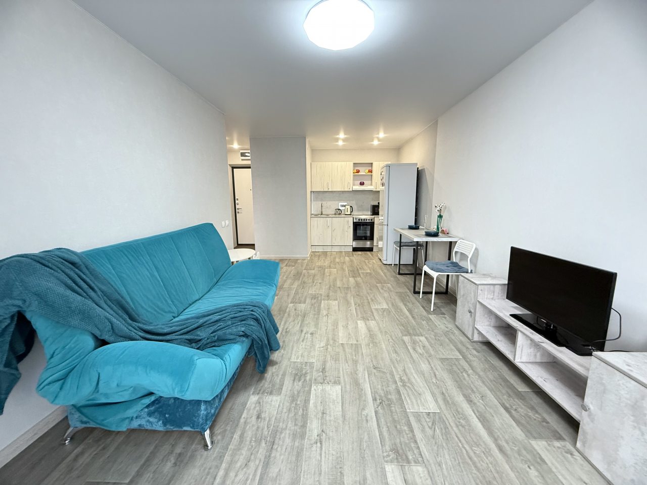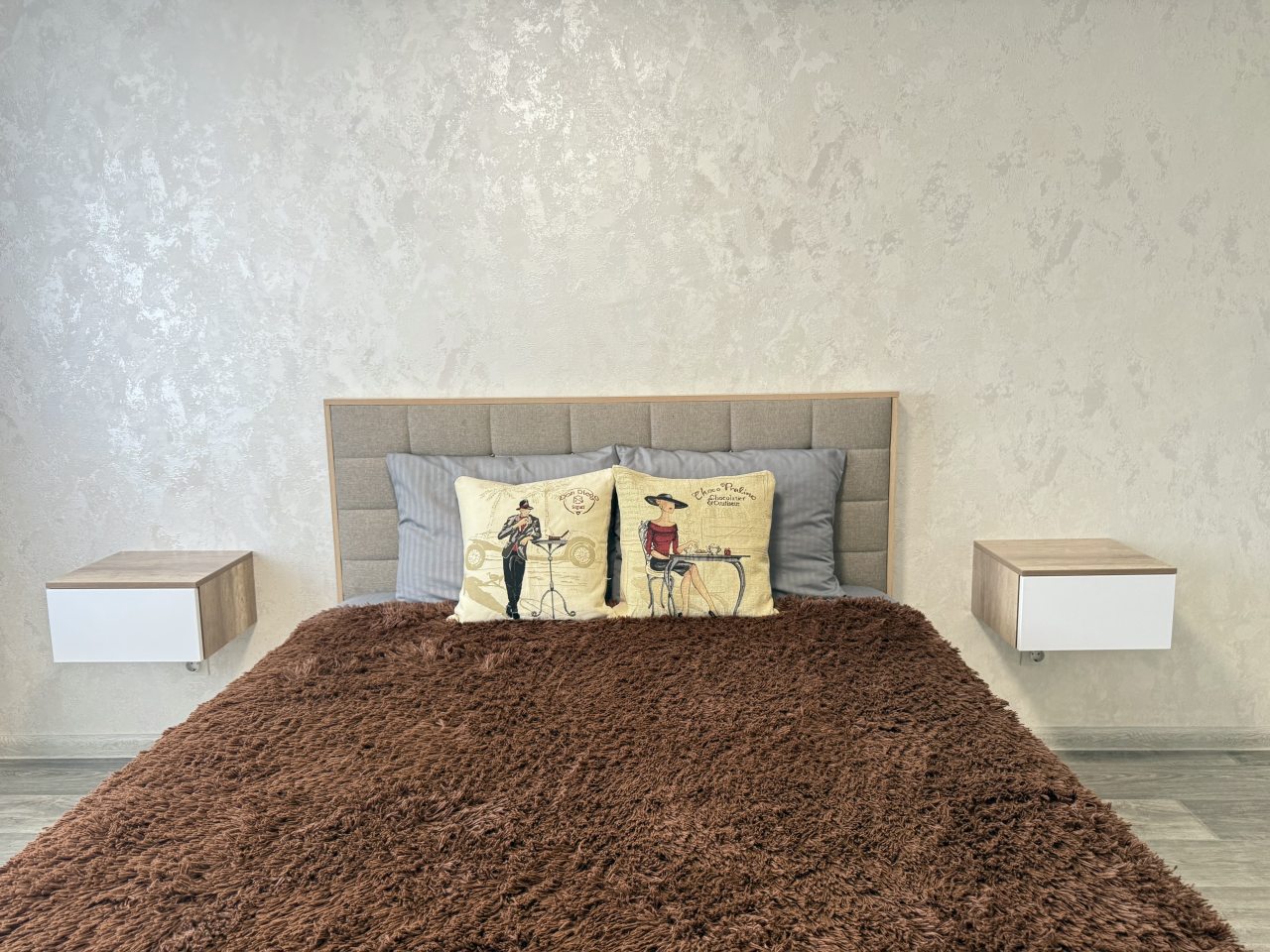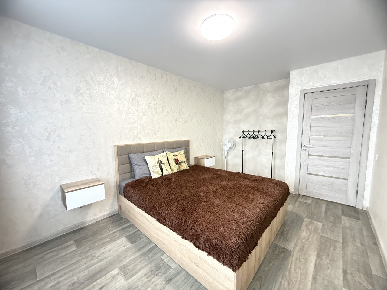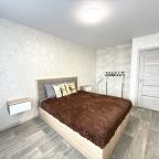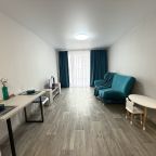 К размещению представлены апартаменты в современном стиле, укомплектованные: мягким диваном, телевизором, двуспальной кроватью, прикроватными тумбочками. В санузле установлена стиральная машинка, есть набор полотенец.