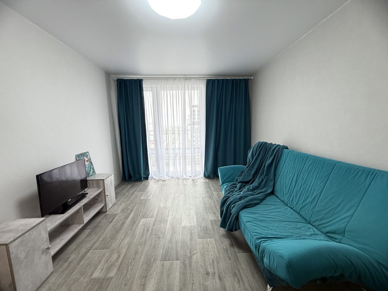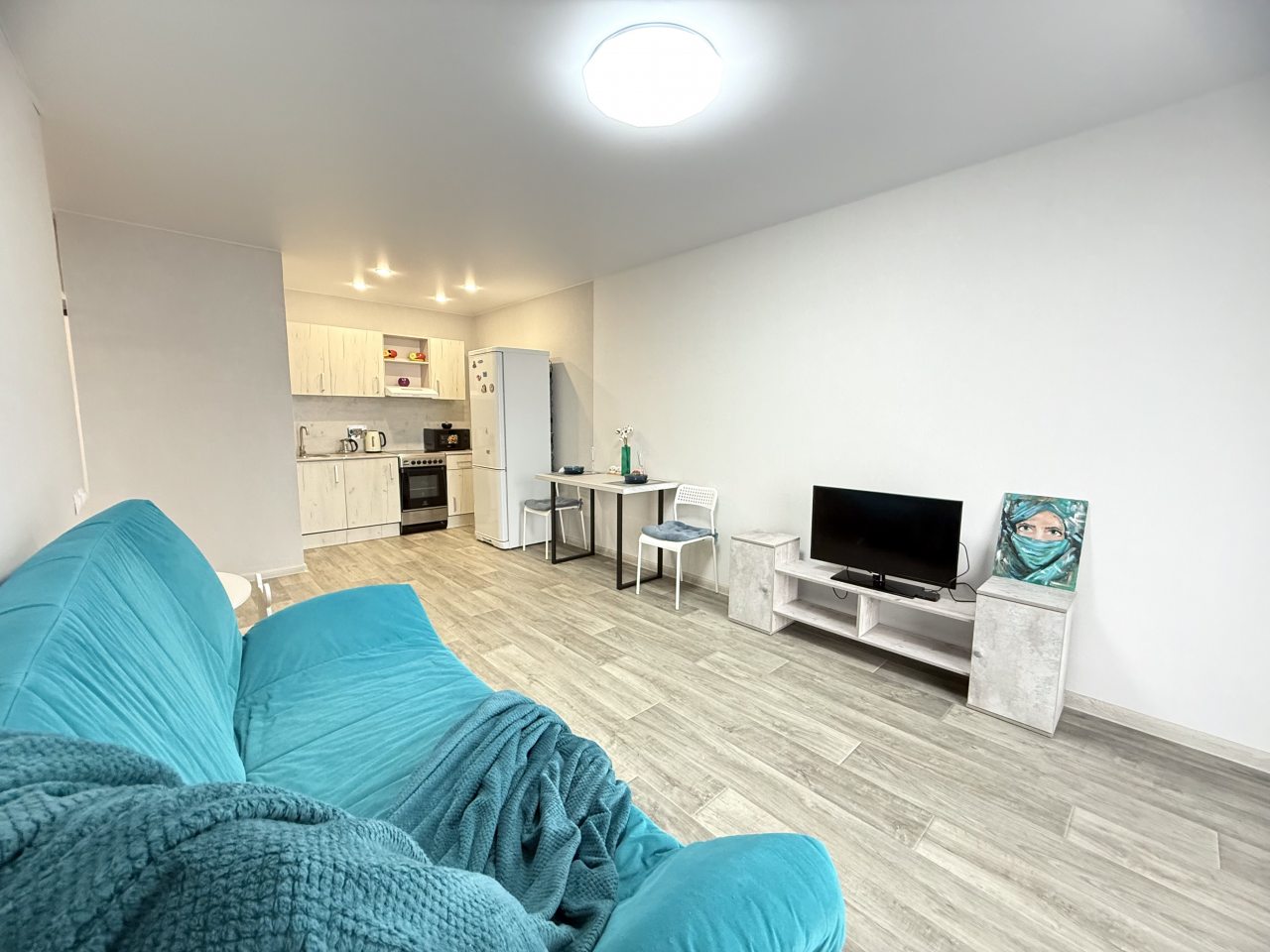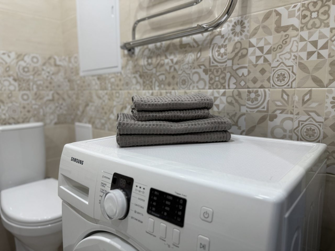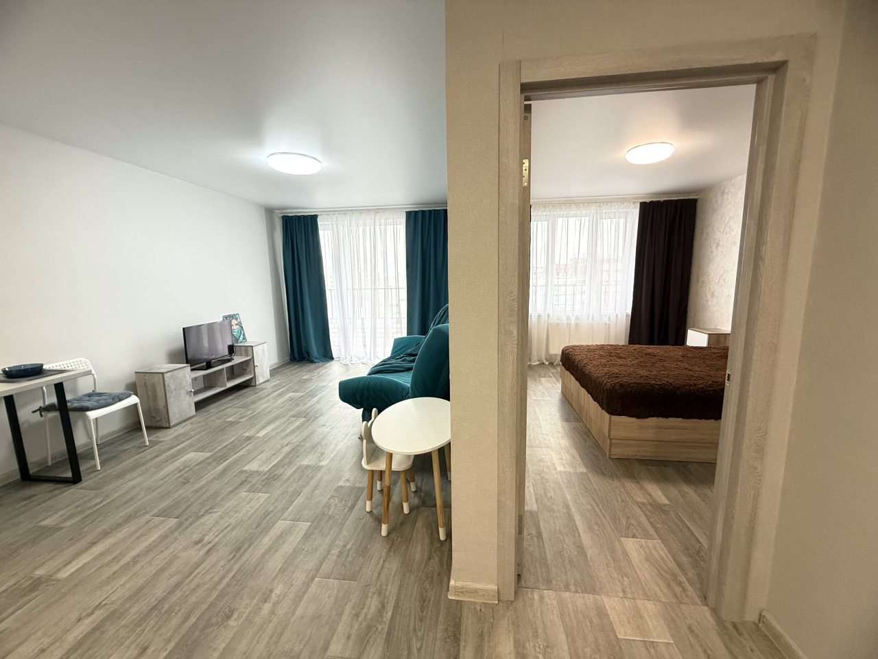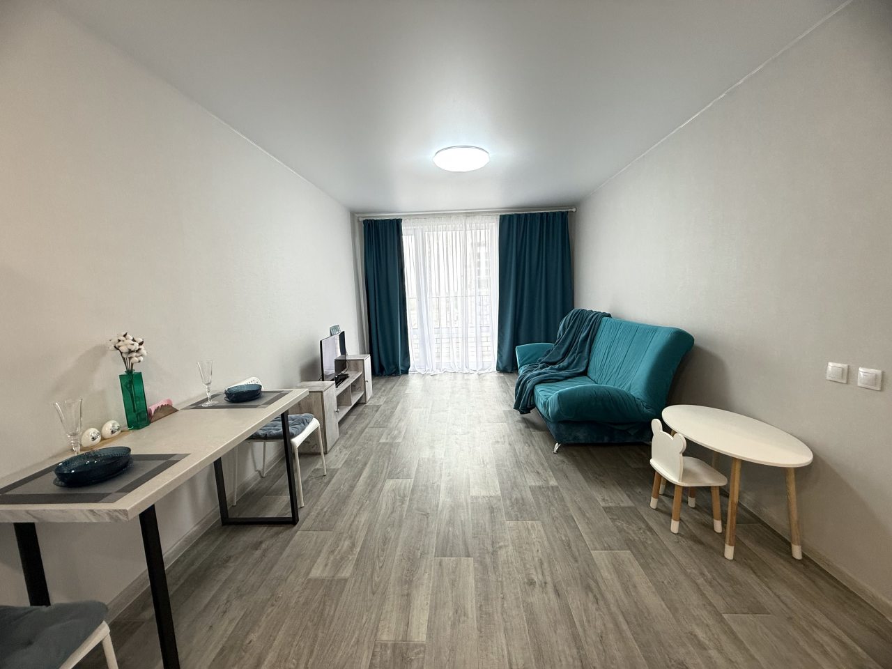 К размещению представлены апартаменты в современном стиле, укомплектованные: мягким диваном, телевизором, двуспальной кроватью, прикроватными тумбочками. В санузле установлена стиральная машинка, есть набор полотенец.