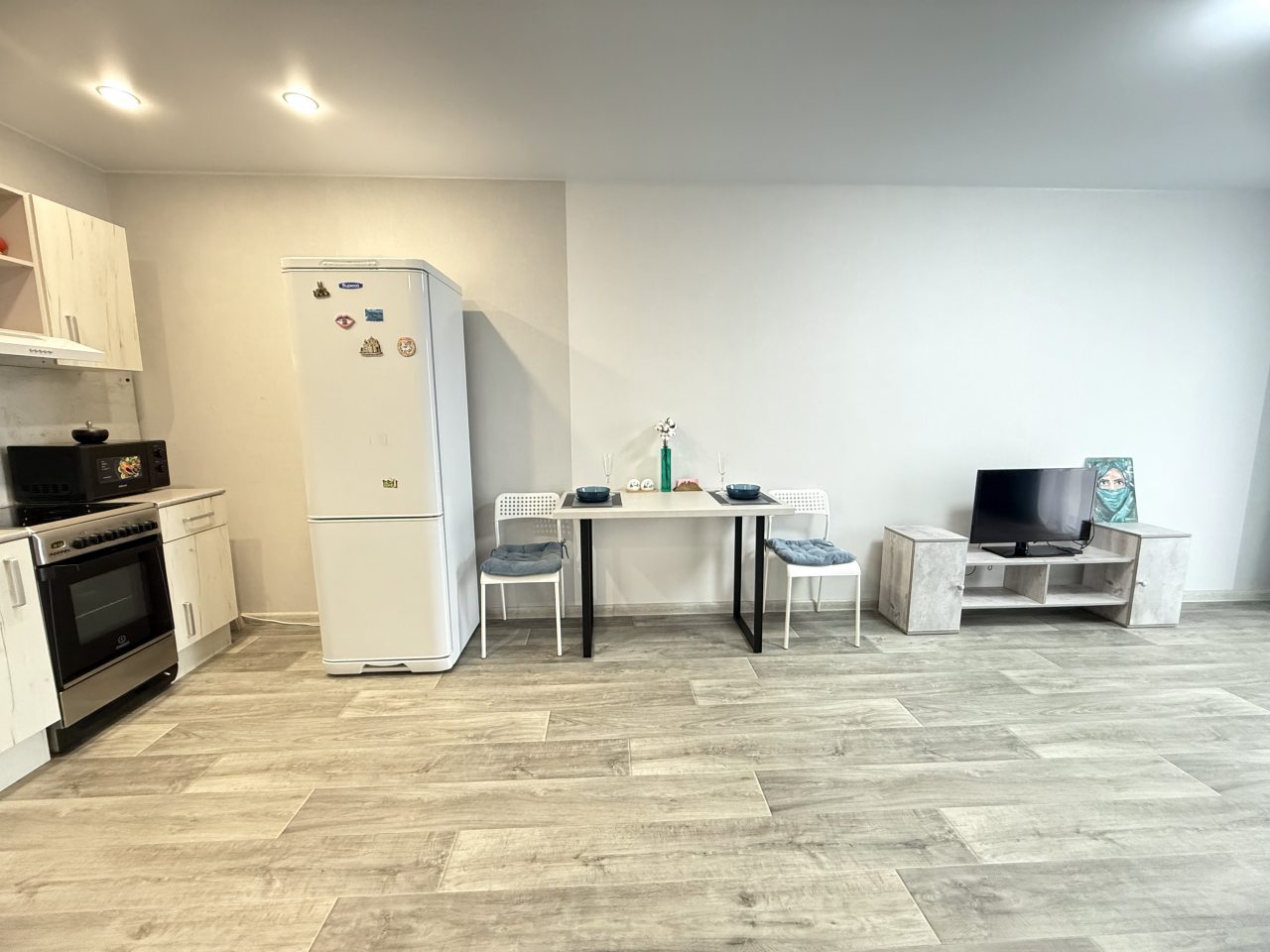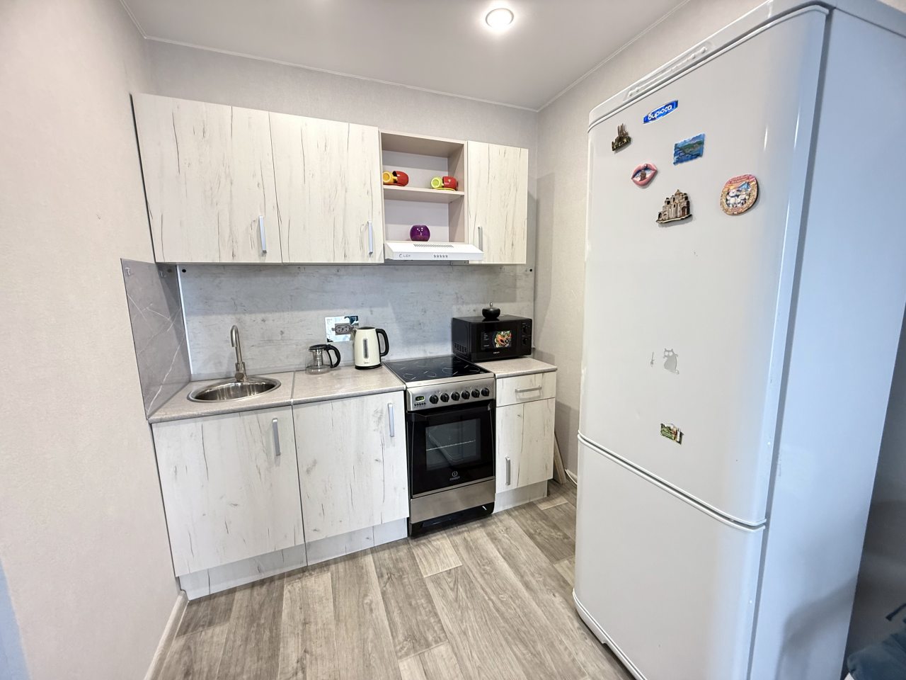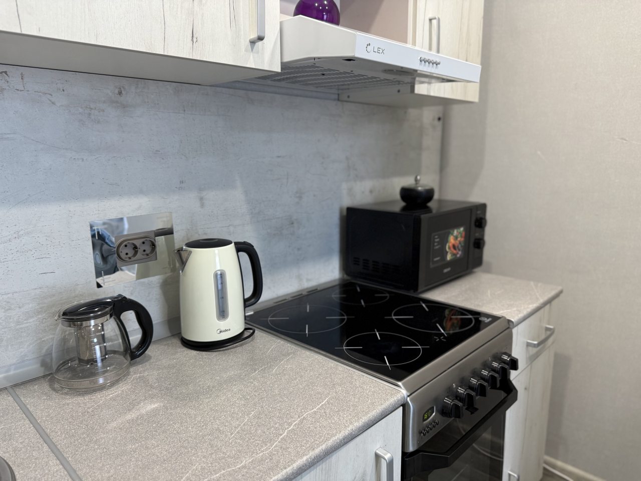 На кухне имеется бытовая техника для организации питания: чайник, варочная панель, духовой шкаф, микроволновая печь. Для покупки продуктов отлично подойдет ближайший магазин «Магнит».