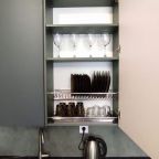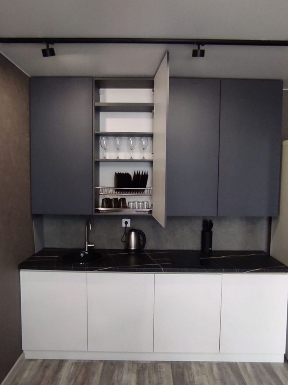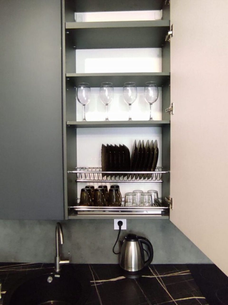 Зона кухни включает в себя варочную панель, холодильник, чайник, посуду, обеденный стол и стулья. Таким образом, вы всегда сможете порадовать себя приготовлением домашней еды и напитков.