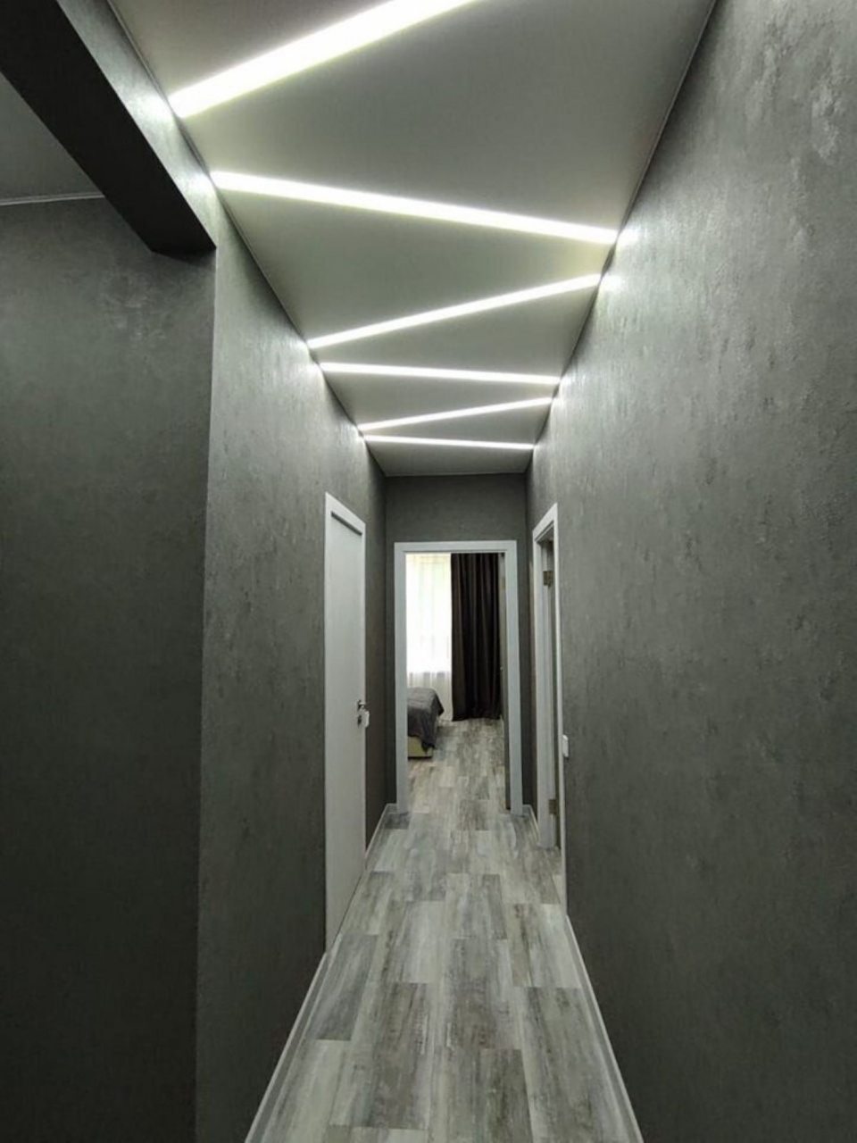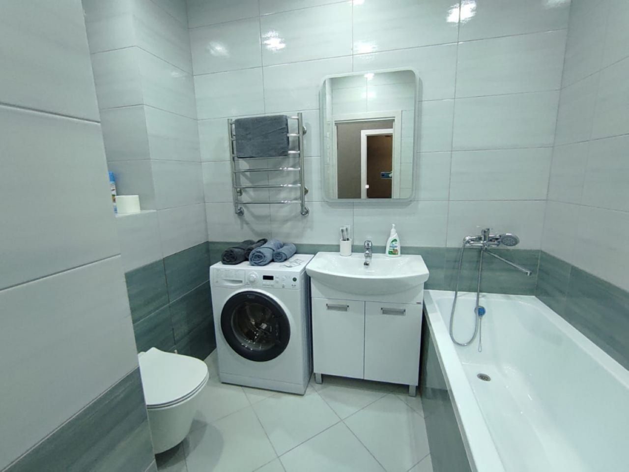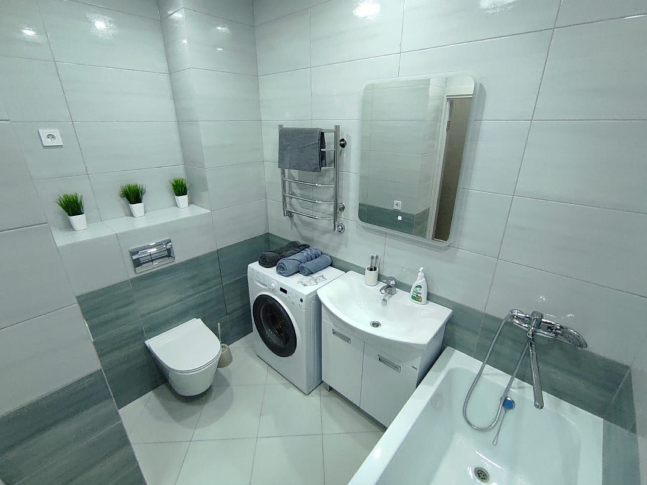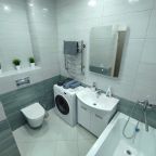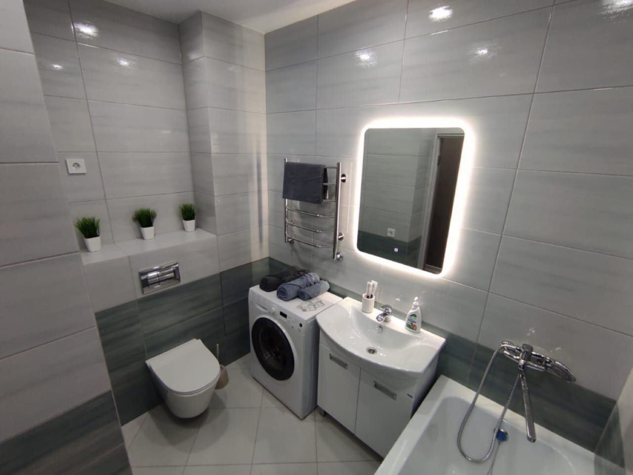 В спальне — кровать с качественным матрасом и шкаф с зеркалом; в гостиной — мягкий диван и телевизор; в санузле — полноценная ванна, стиральная машина, туалет, раковина. Везде предусмотрены различные сценарии освещения.