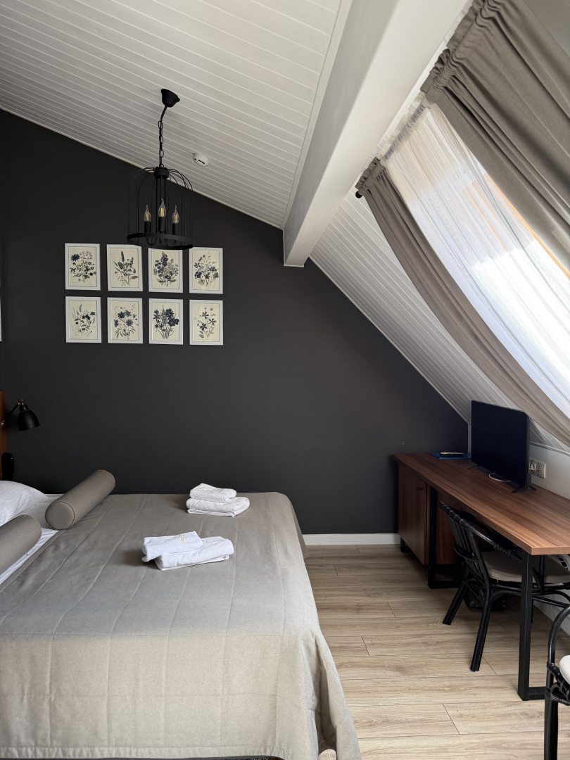 Замечательный камерный отель с приветливым персоналом. Понравилось абсолютно всё. Номер в мансарде, небольшой, с мансардным окном, очень уютный. Кровать широкая высокая с удобным матрасом. Дополнительную подушку принесли через 5 минут после просьбы. Халаты, полотенца белоснежные. Сантехника в ванной комнате новая, все устроено функционально. Душ. Вода в кулере на этаже, холоднаягорячая. Очень понравился ресторан, там же и завтракали. Просторный зал со стильным интерьером. Завтраки по меню двух видов- русский и бельгийский. В первом каша и блины, во втором омлет с сыром и помидорами, слойка сладкая. Невероятно вкусный чай! Рекомендую! Ужинали тоже в отеле. Из напитков только пиво, но можно принести свое вино. Бутылочный сбор 200 руб. Нас это вполне устроило! Еда вся очень вкусная, обслуживание идеальное. Парковка перед отелем и сбоку достаточная, чтобы всем разместиться. К тому же можно припарковаться на заднем дворе соседнего отеля. В отеле есть сауны и джакузи, скоро откроется бассейн. До Красной площади, исторического центра Переславля, 10 мин.пешком. Звукоизоляция в номерах отменная. При открытом окне слышно дорогу. Не критично. Очень тепло в номере. Вода из крана не жёлтая, ничем не пахнет, всё хорошо. Спасибо огромное персоналу за отлично проведённое время!