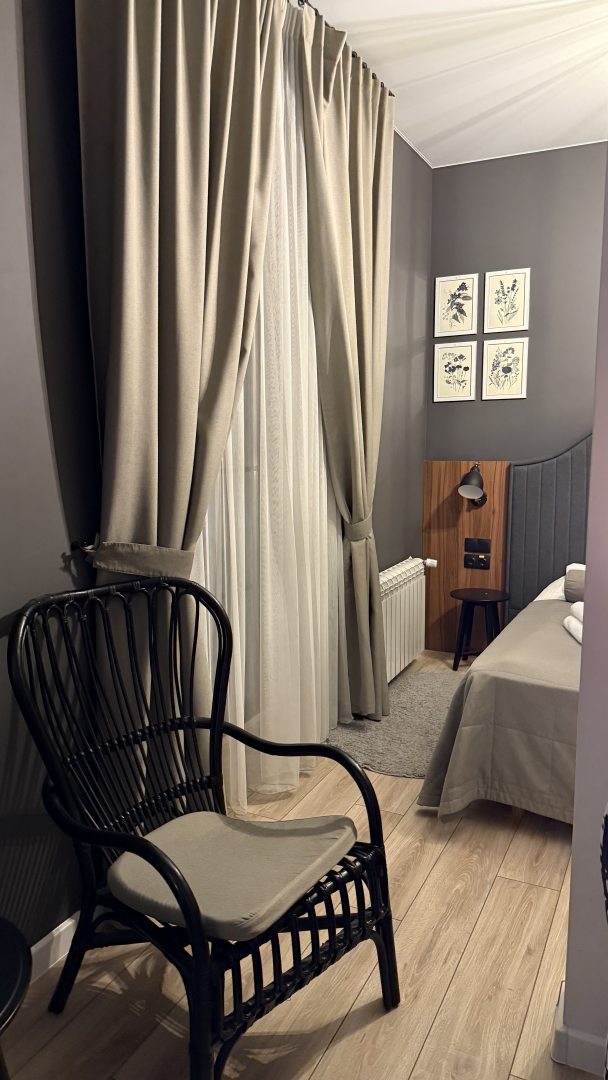 В номерах выполнен современный ремонт в светлых оттенках. Помещения полностью меблированы, имеется сейф, телевизор, Wi-Fi, собственная ванная с феном.