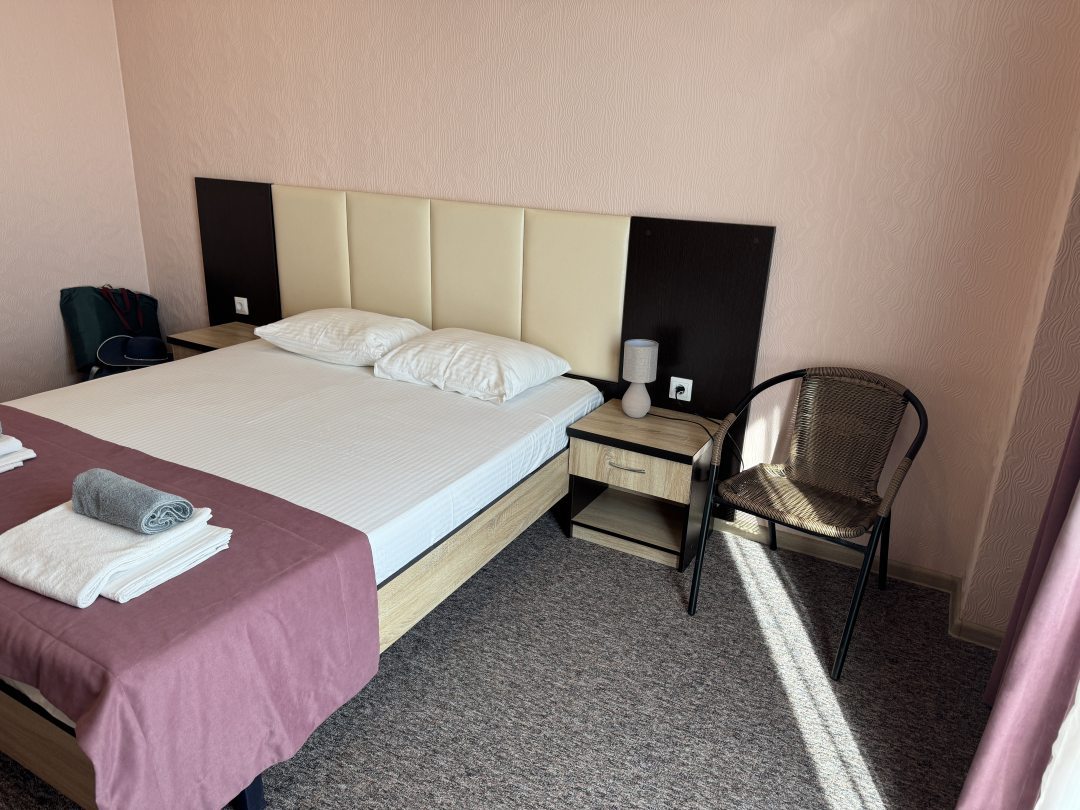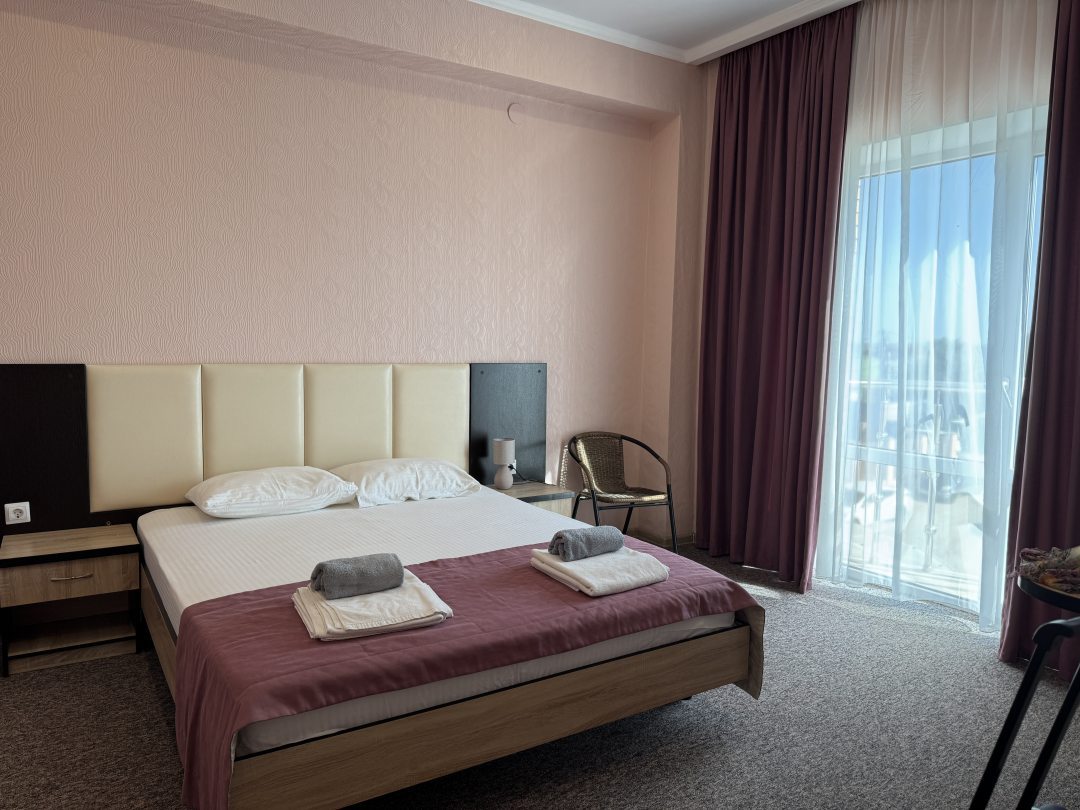 Номера очень просторные, чистые и современные. Один минус - в номере нет чайника, а чайник есть на этаже на стойке, где он наполняется и тут же греется. Питание - достойное, по системе "шведский стол". Можно кроме завтрака так же заказать и обед (по 500р за чел) и ужин. Но, есть и Кафе от отеля - терраса на пляже (кормят хорошо!). На территории есть небольшой бассейн для детей (и взрослые тоже купались). Близ отеля есть стоянка для авто. Пляж песочный. Вход в воду нормальный (не нужно идти 100 метров, когда станет по колено воды). Очень красивый закат! Работники - приветливые, обходительные и исполнительные. А еще был сюрприз - ехали мы 10 часов по жаре на отдых в Отель..., а при заселении "Комплимент" от Отеля - по бокалу холодного шампанского!!! Спасибо за всё!