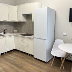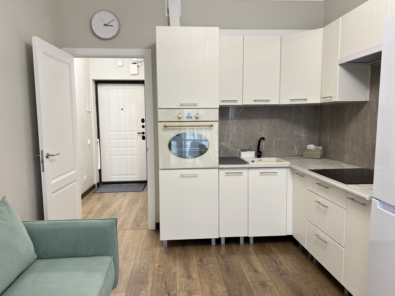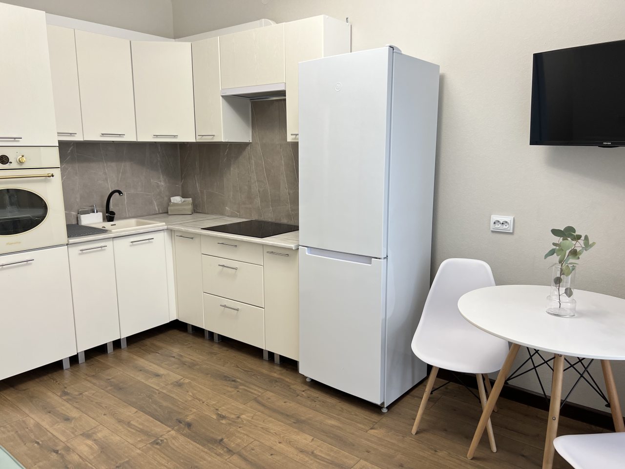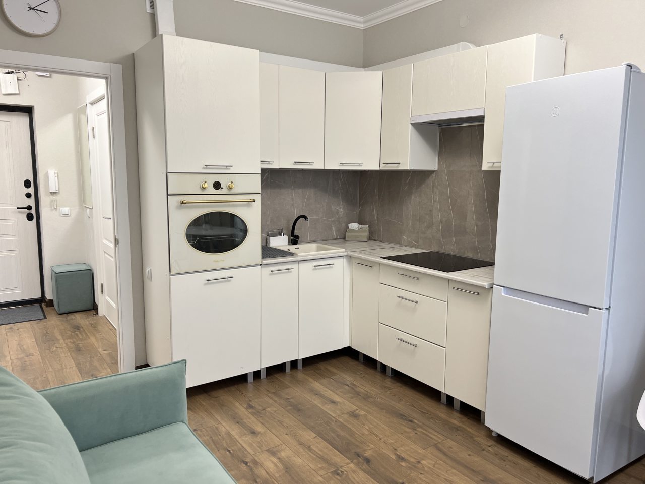 Светлая кухня имеет комплект гарнитура, холодильник, варочную панель, духовой шкаф. В шаговой доступности большое количество заведений на любой вкус.