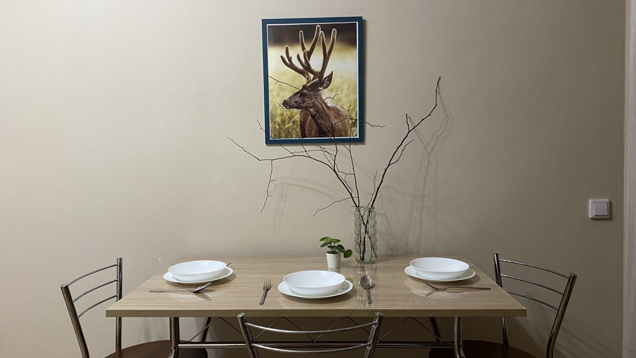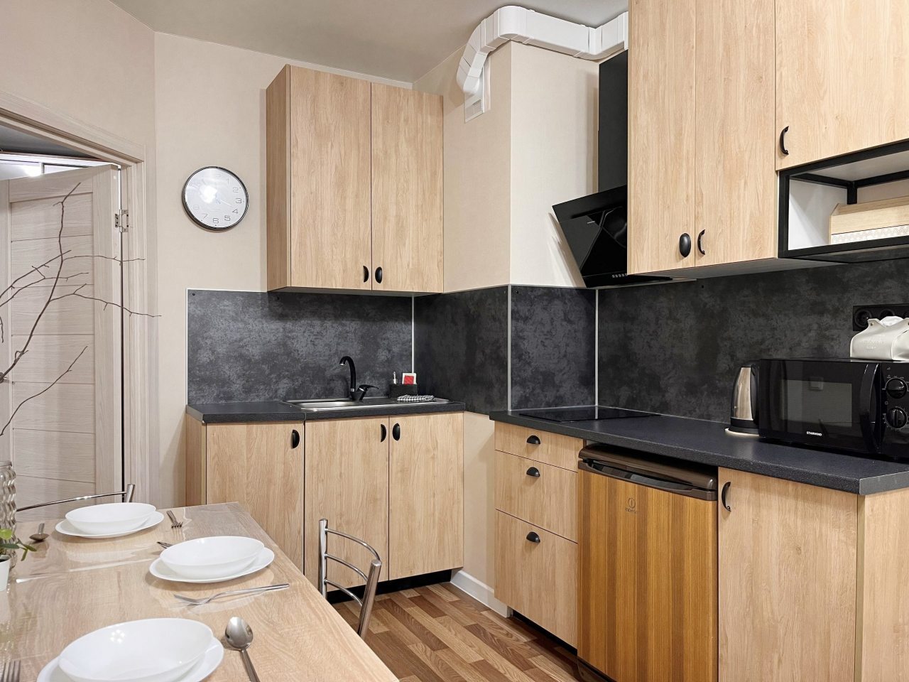 Кухонная зона включает в себя варочную панель с вытяжкой, мини-холодильник, чайник, СВЧ, посуду и обеденный стол со стульями, чтобы вы могли радовать себя любимой едой и напитками.