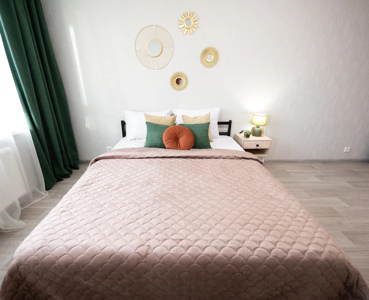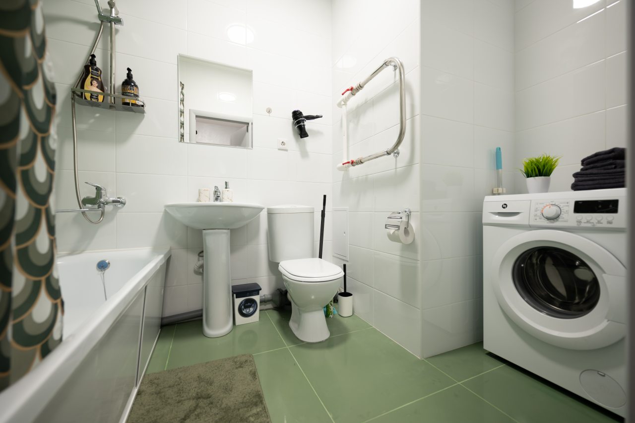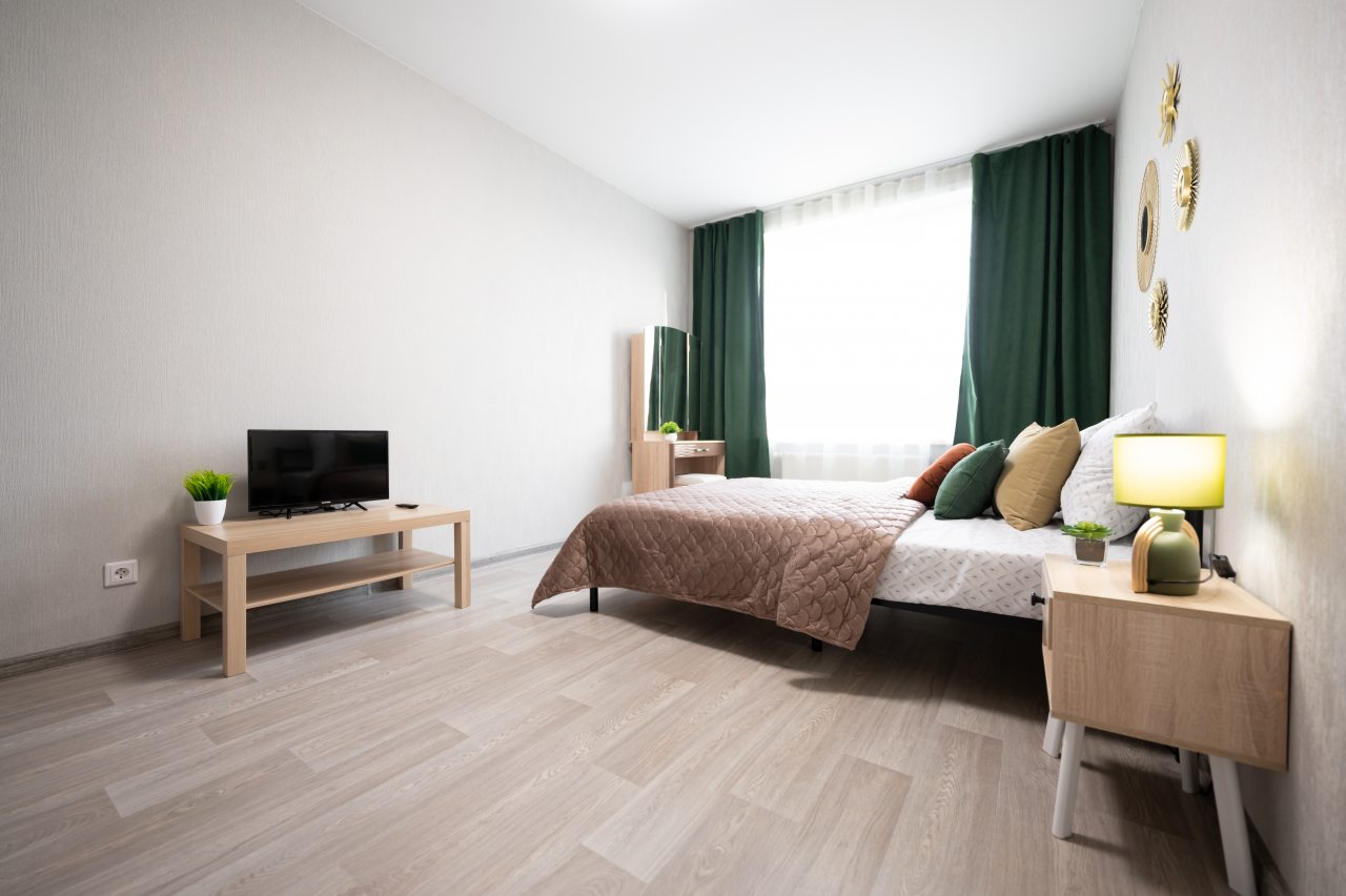 Внутри продумано всё для комфортного проживания, в том числе двуспальная кровать, плотные шторы, туалетный столик с зеркалом, телевизор, шкаф, прикроватная тумба и лампа, полноценная ванна, стиральная машина, фен.
