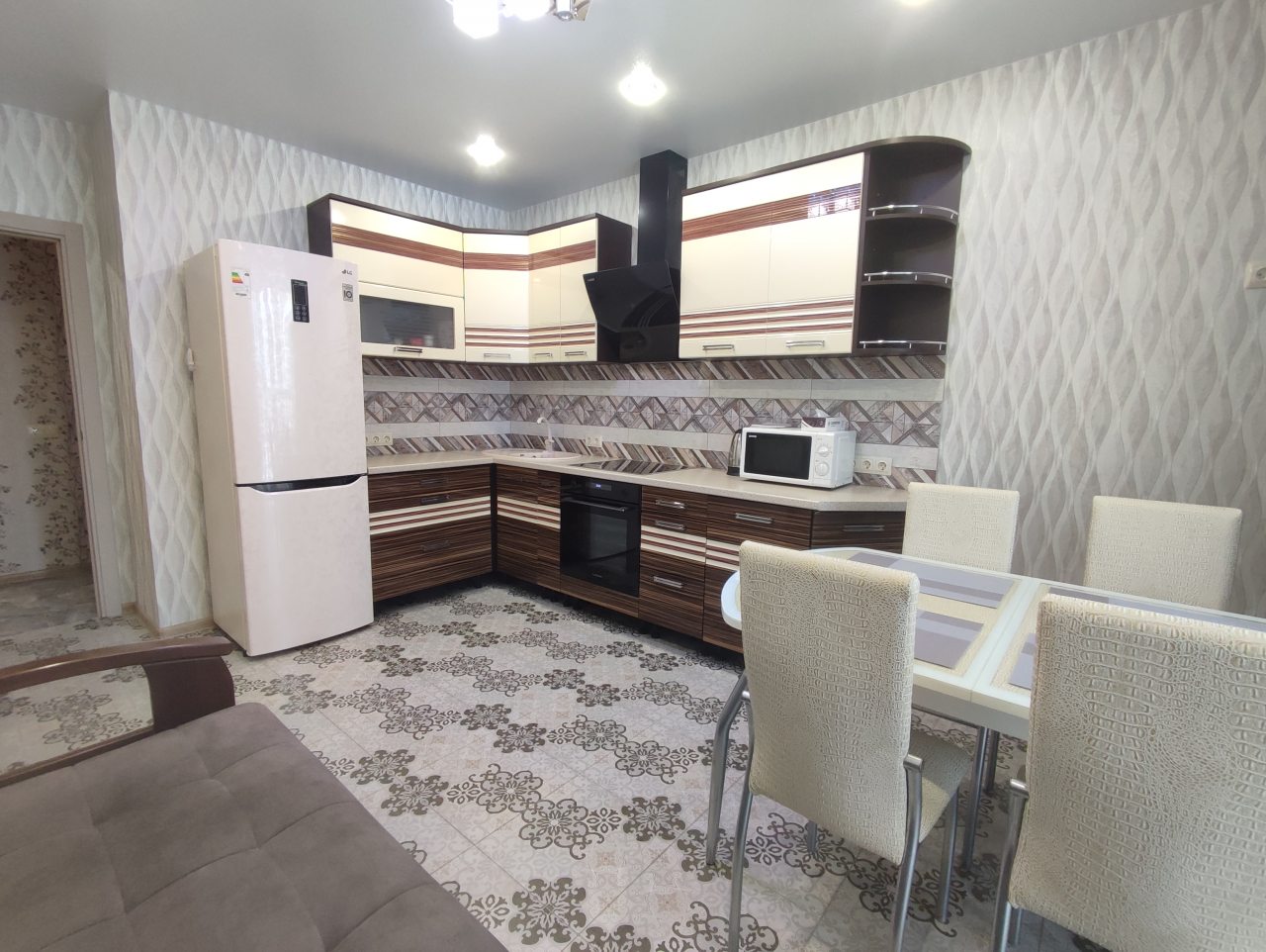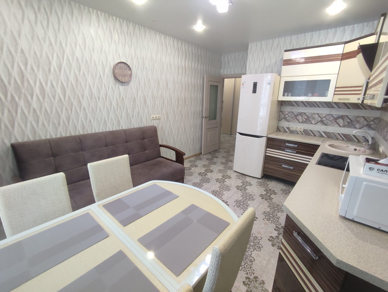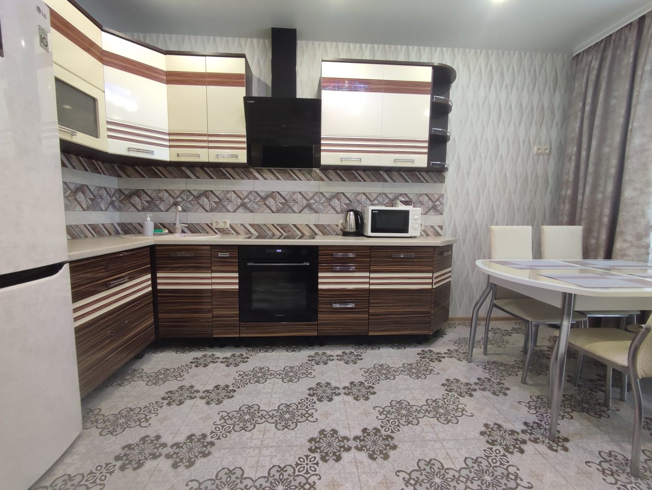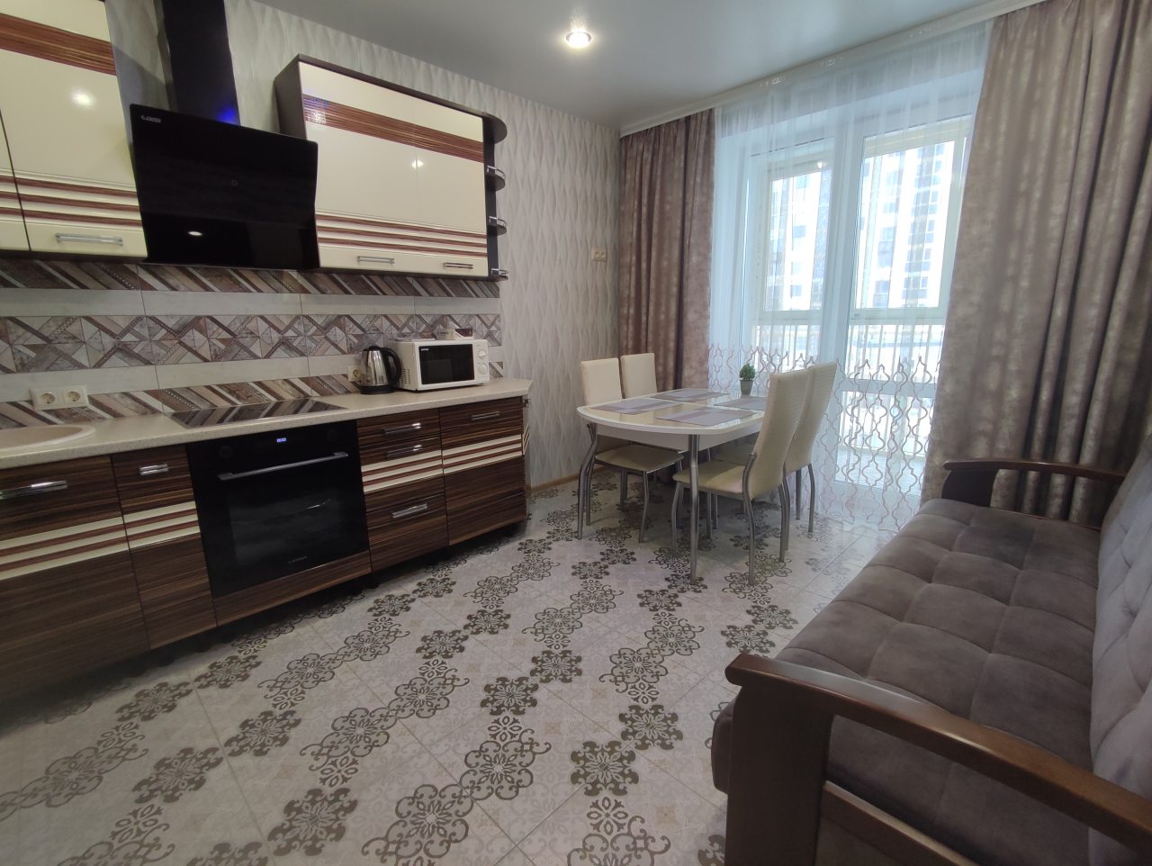 На кухне будет приятно и легко готовить, поскольку в наличии варочная панель с вытяжкой, духовой шкаф, микроволновая печь, чайник, уютная обеденная зона.
