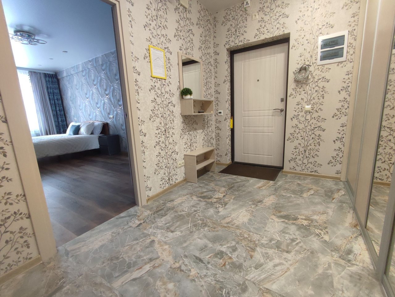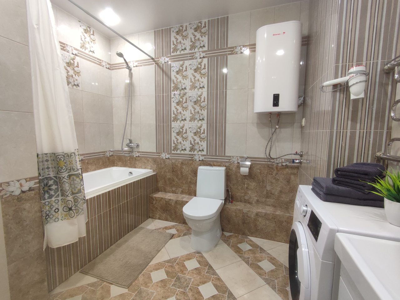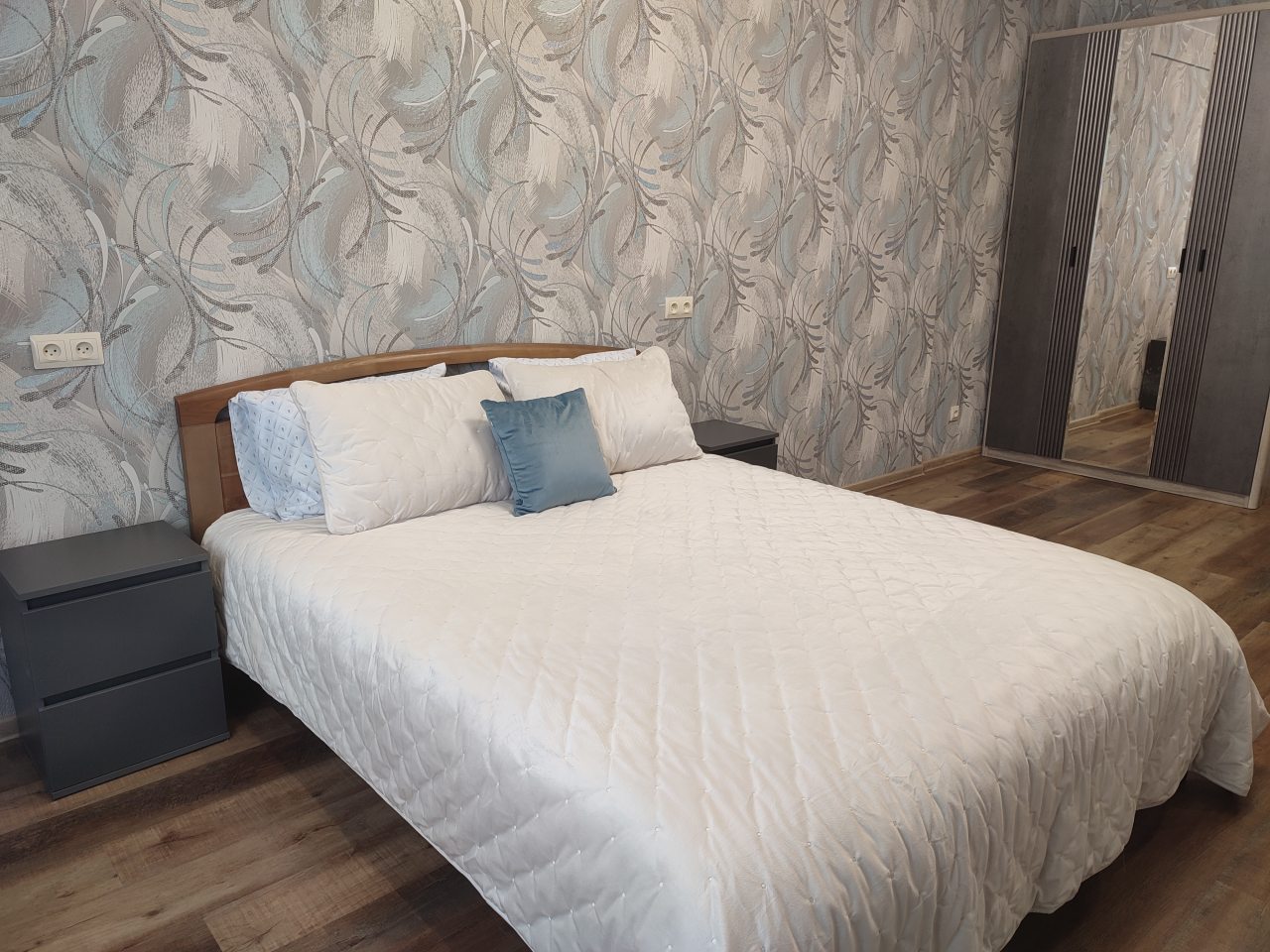 На площади в 52 квадратных метра имеется всё для удобства, в том числе двуспальная кровать, шкаф с зеркалом, диван, телевидение, ванная комната со стиральной машиной и феном, лоджия.