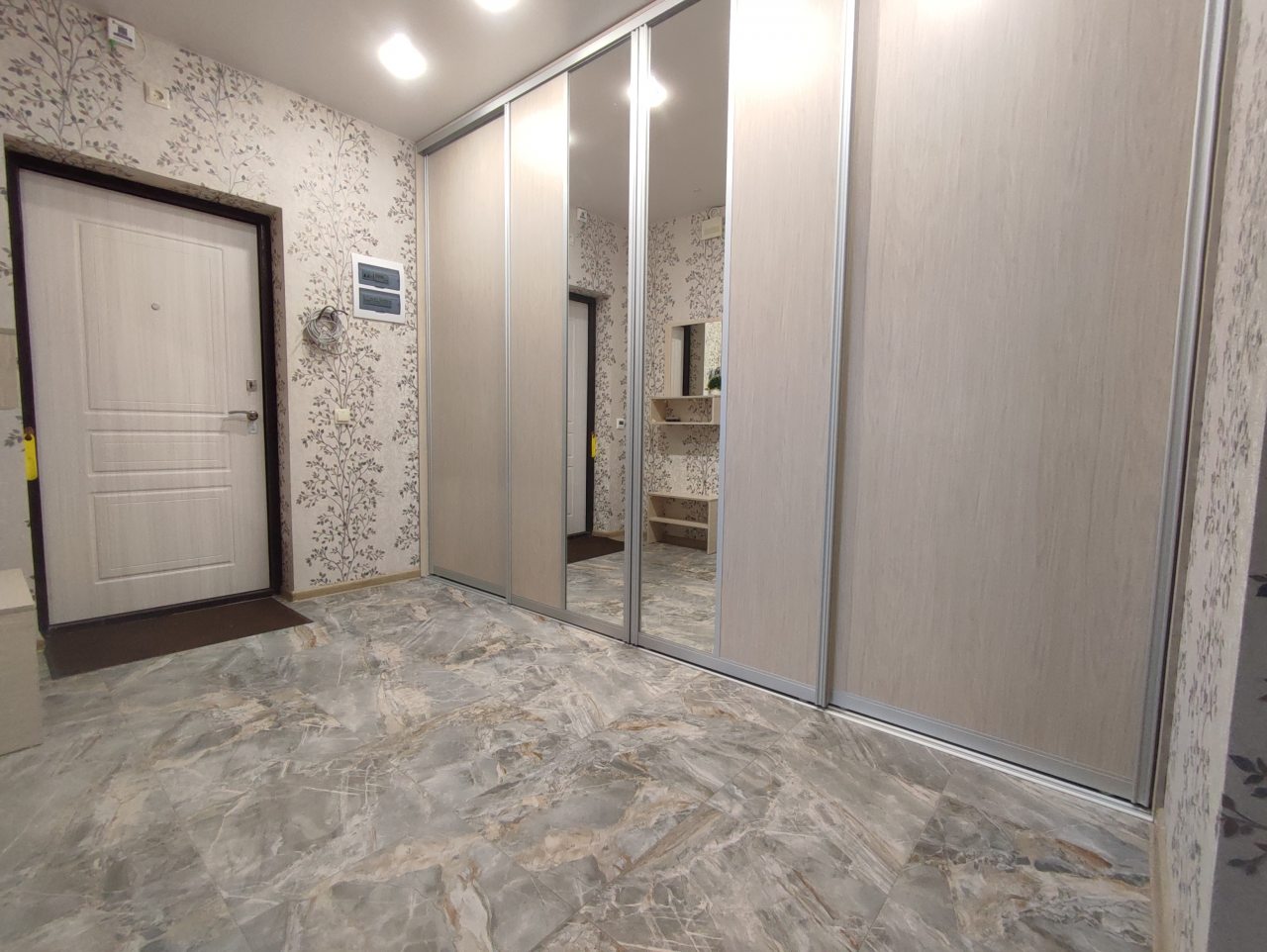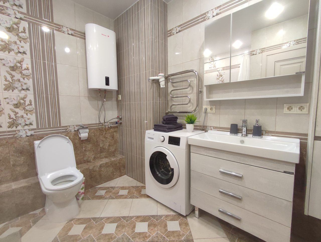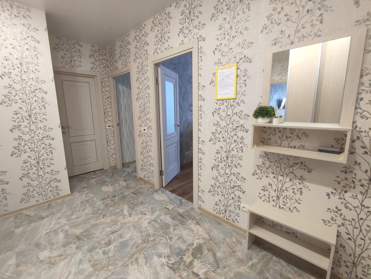 На площади в 52 квадратных метра имеется всё для удобства, в том числе двуспальная кровать, шкаф с зеркалом, диван, телевидение, ванная комната со стиральной машиной и феном, лоджия.