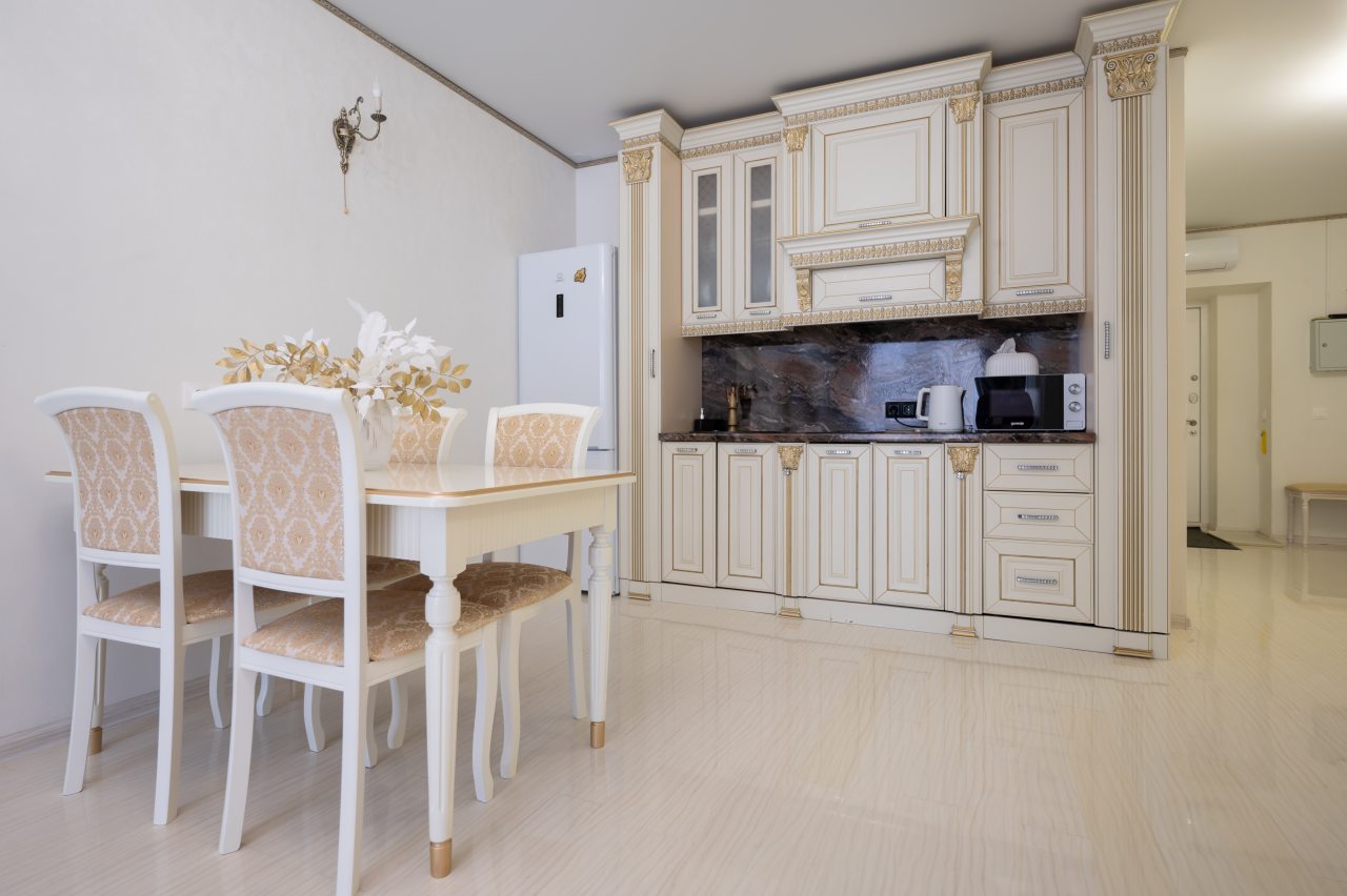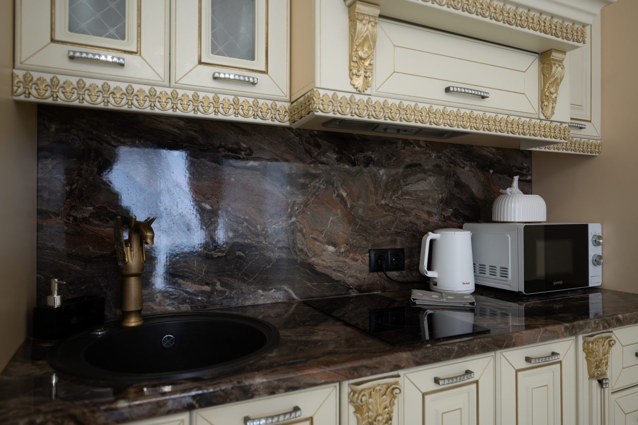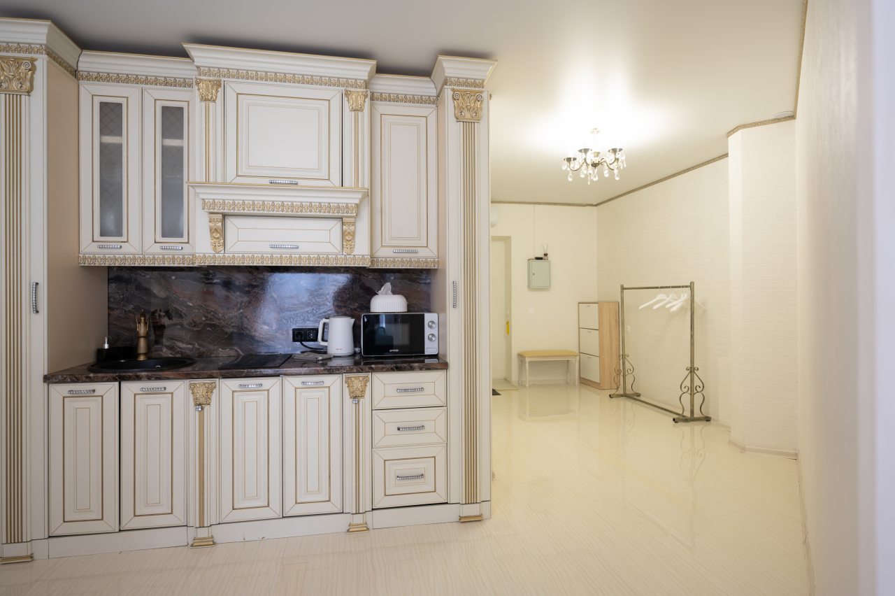 Кухонная зона укомплектована гарнитуром, холодильником, микроволновой печью, электрочайником, варочной панелью и др. В доступности продовольственный магазин и кафе.