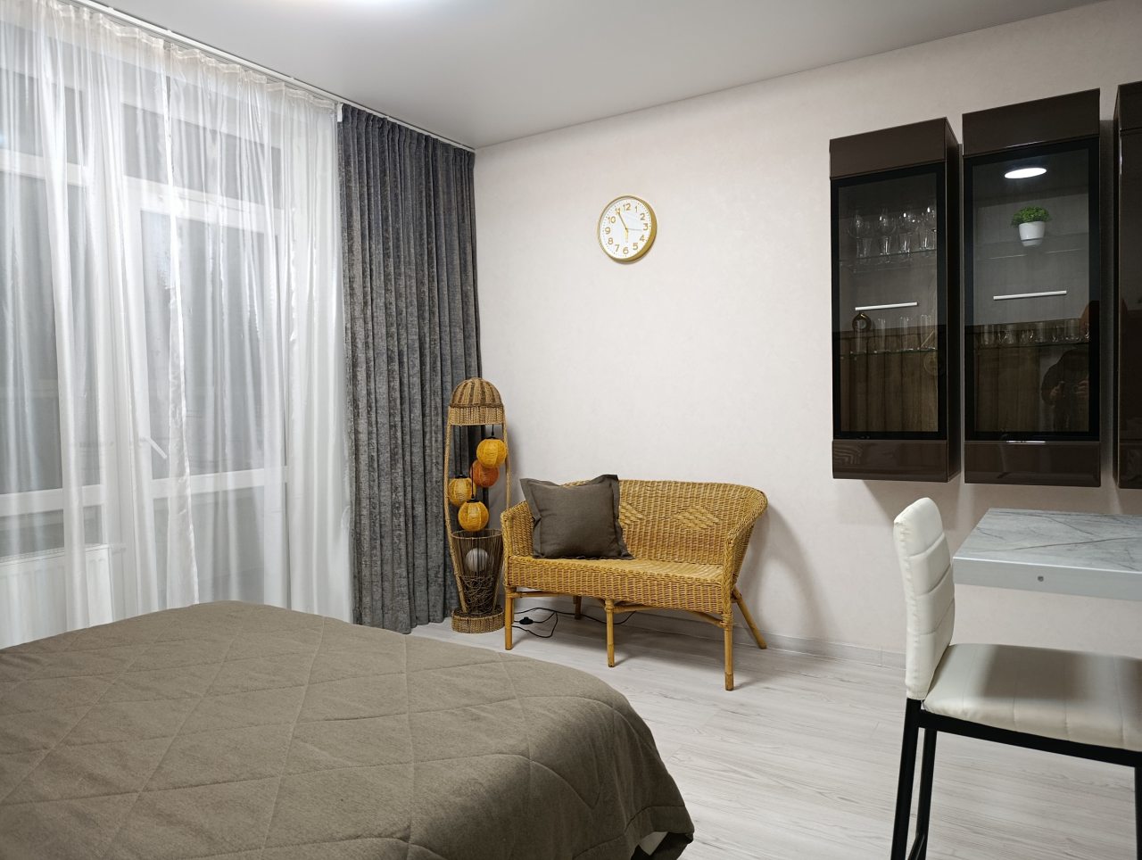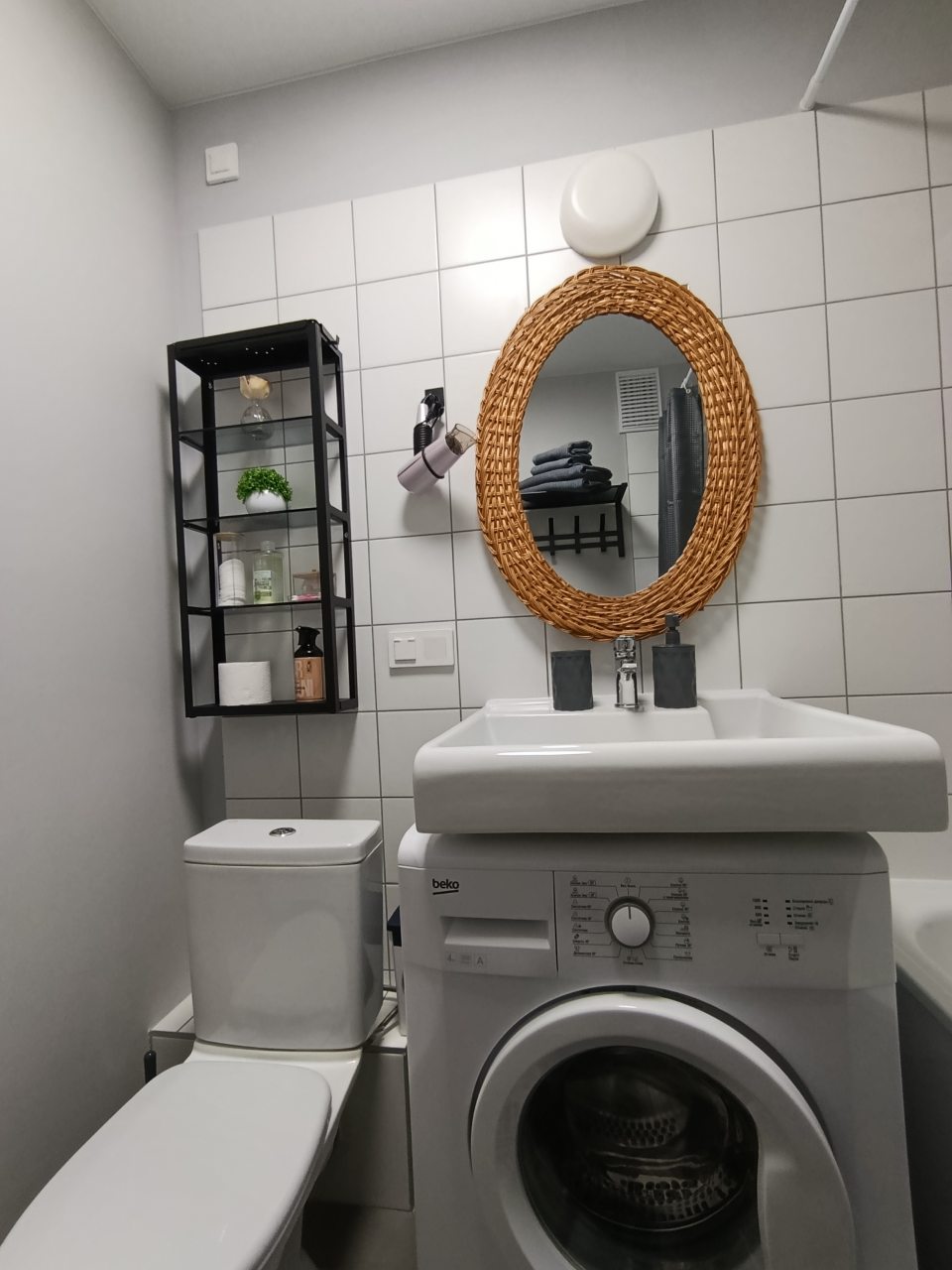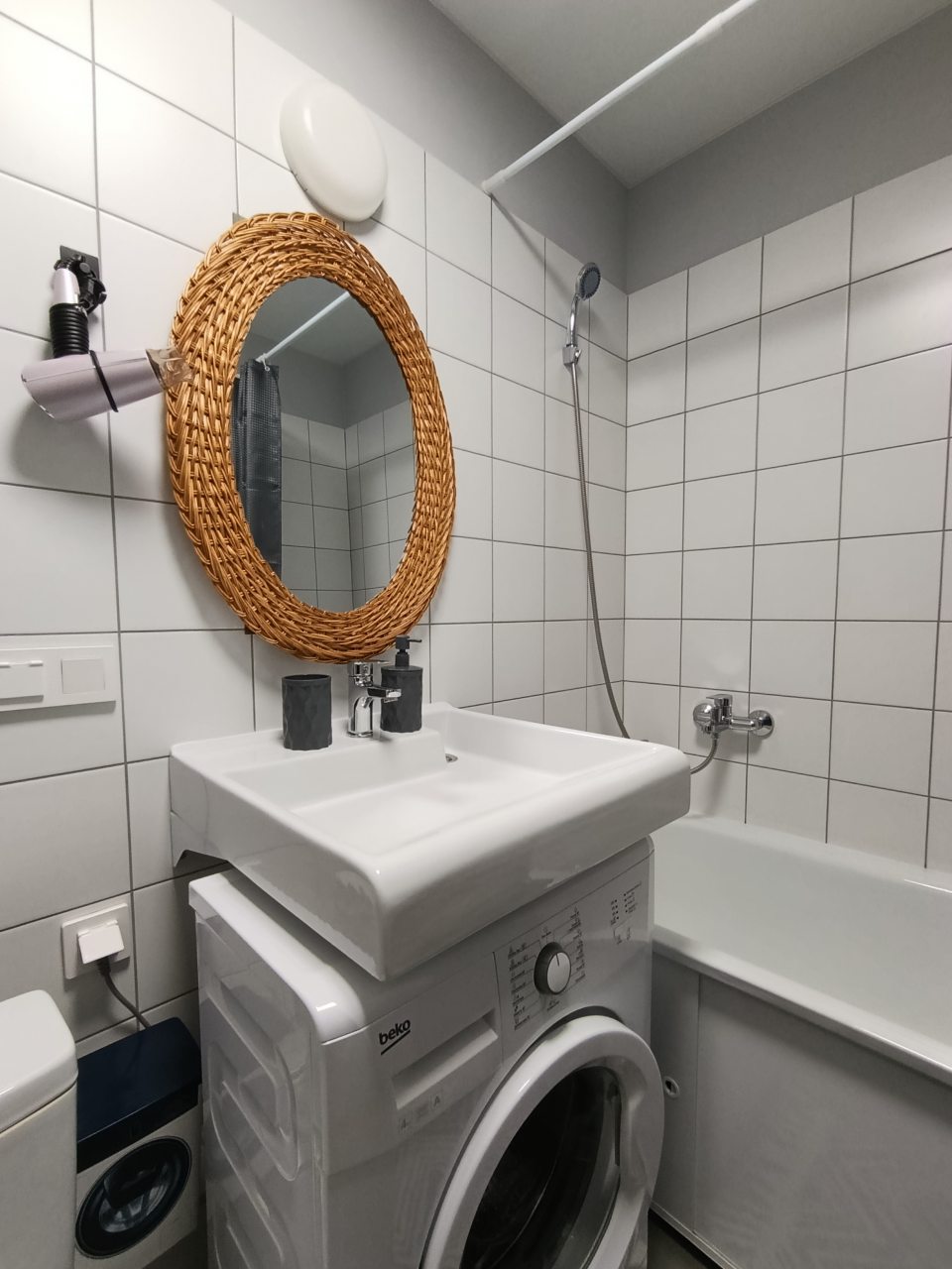 Внутри вас ожидает большая и удобная кровать, прикроватные бра, телевизор, затемненные шторы, плетенный мини-диван, ванная комната со стиральной машиной и стандартным набором сантехники.
