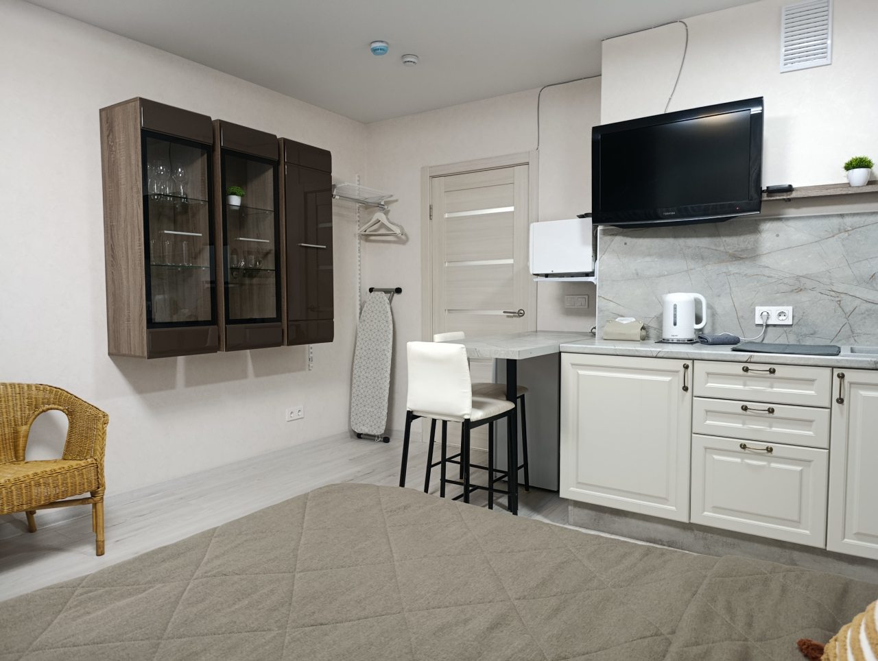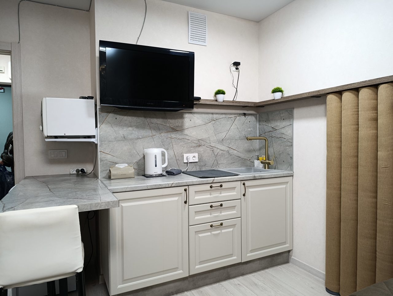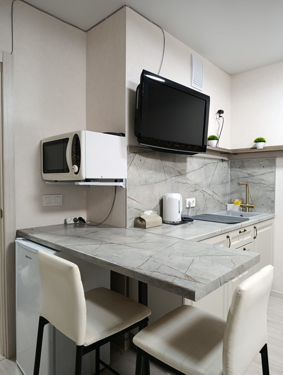 Зона кухни включает в себя чайник, варочную панель, СВЧ, холодильник и обеденную зону, чтобы вы в любой момент могли насладиться любимыми напитками и блюдами.