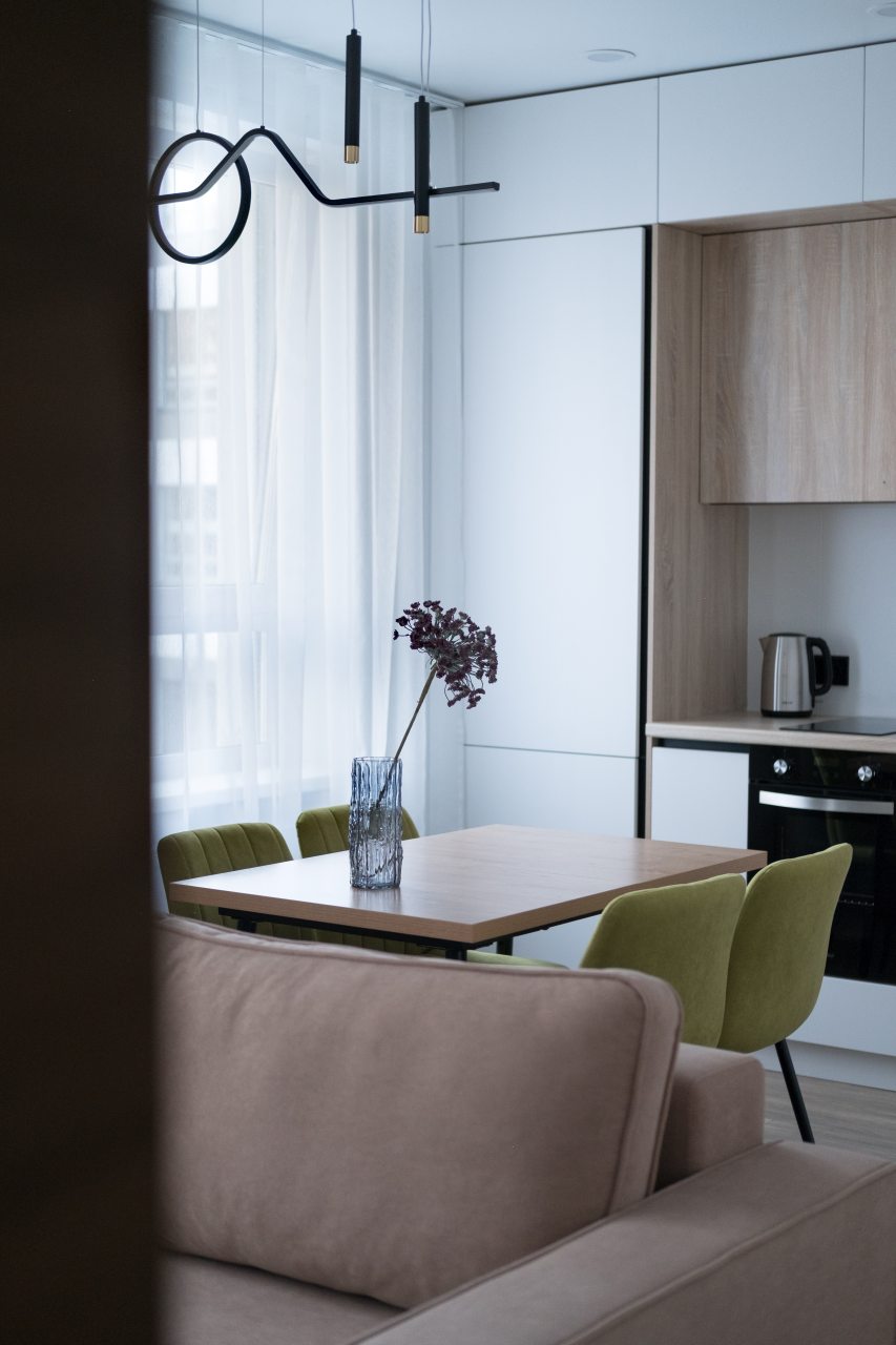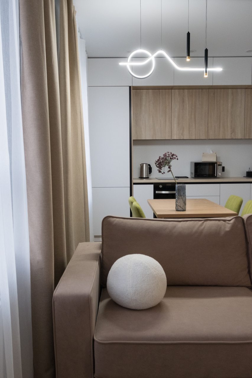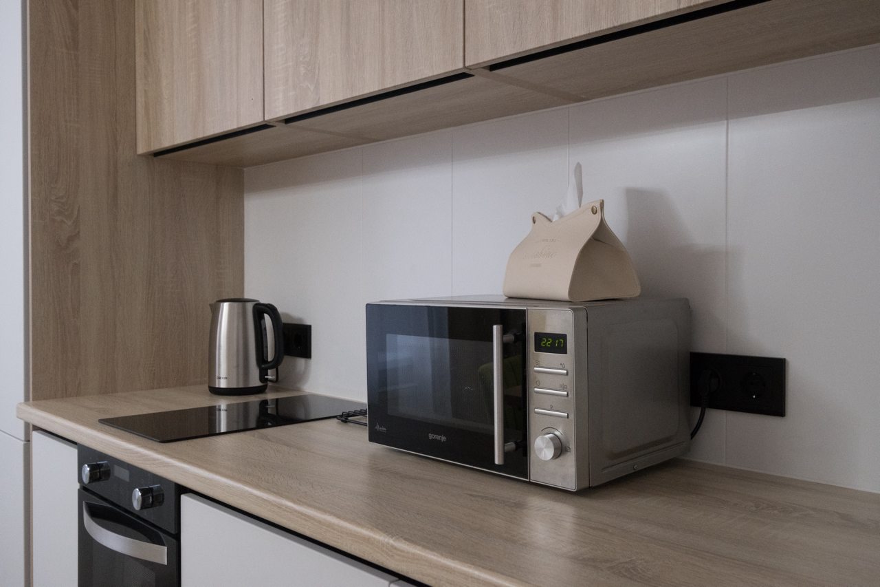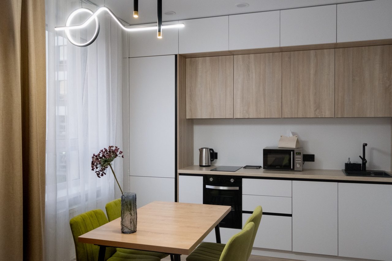 Зона кухни включает в себя духовой шкаф, чайник, варочную панель, СВЧ, холодильник и уютную обеденную зону, чтобы вы в любой момент могли насладиться любимыми напитками и блюдами.