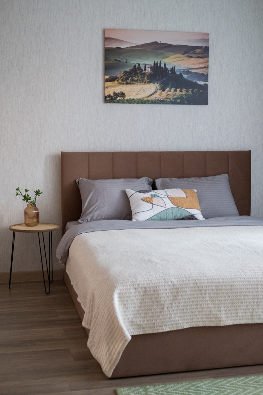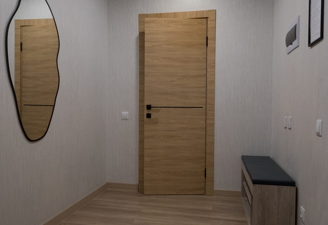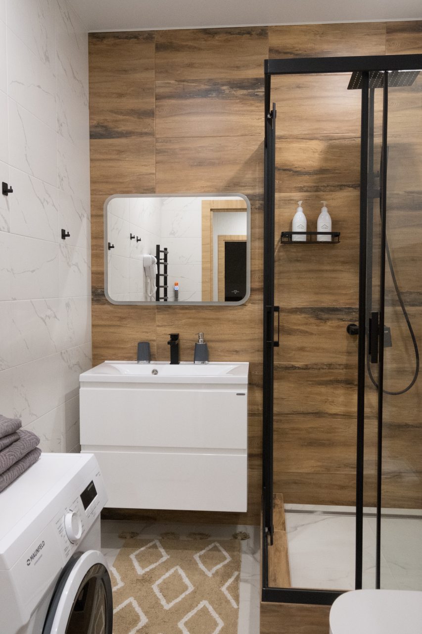 На площади в 56 квадратных метров имеется вся необходимая мебель и техника для комфортного проживания, в том числе удобная двуспальная кровать, мягкий диван с ЖК-телевизором, стильный санузел с душевой, раковиной, туалетом, стиральной машиной.