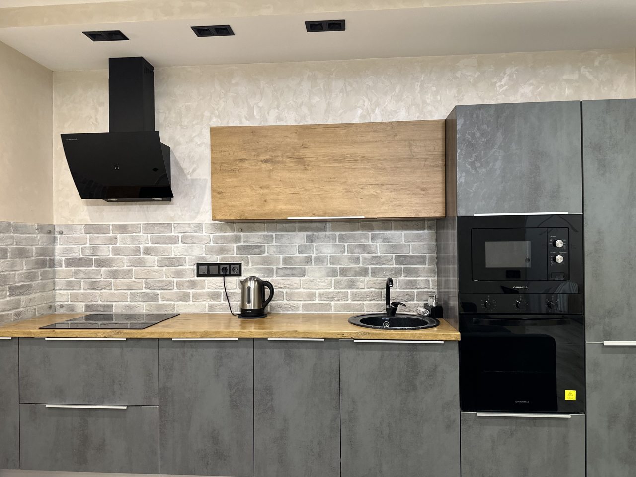 На кухне будет приятно готовить любимые домашние напитки и блюда, поскольку она оснащена духовым шкафом, варочной панелью, чайником, холодильником, СВЧ, красивой обеденной зоной.