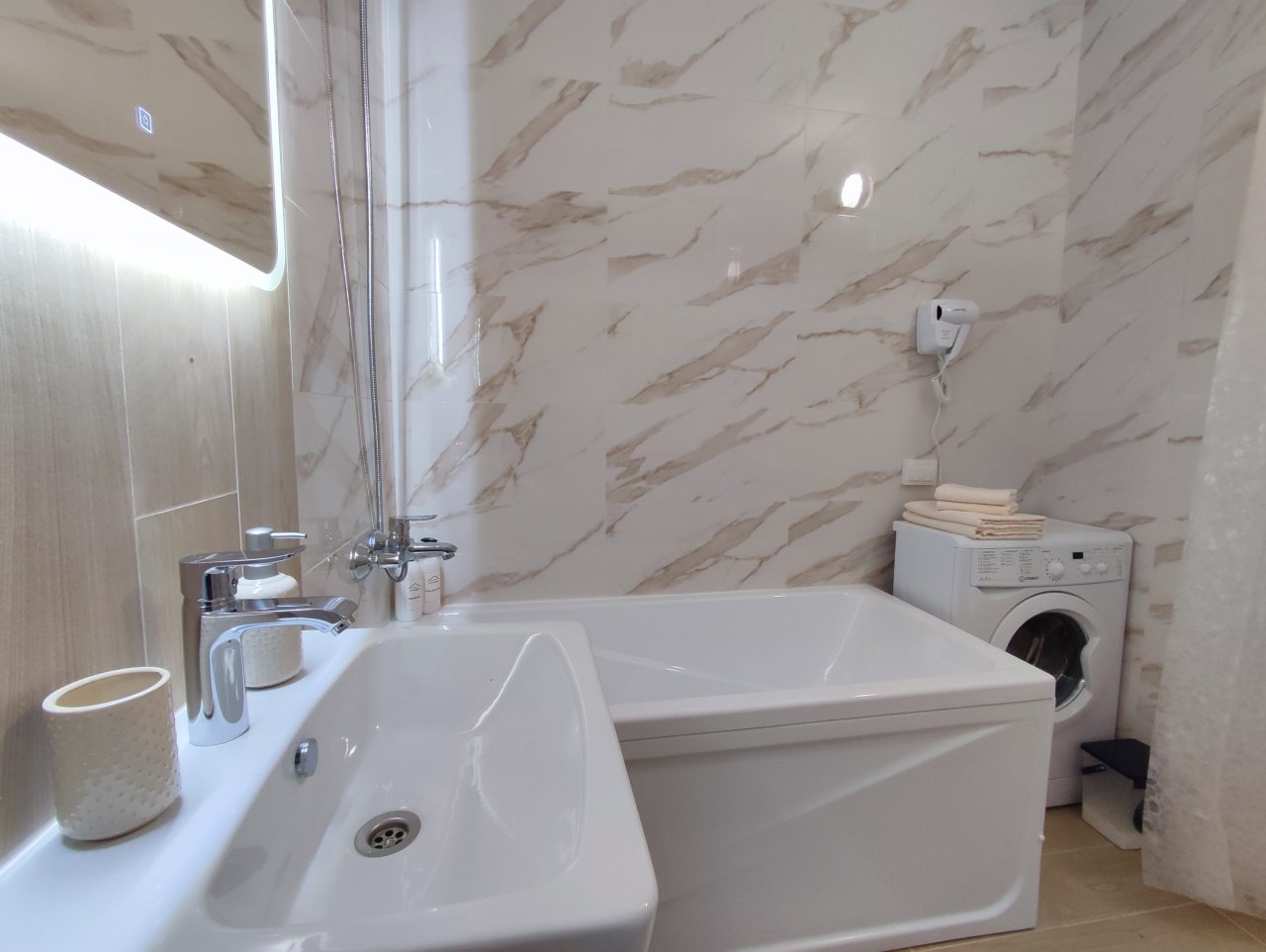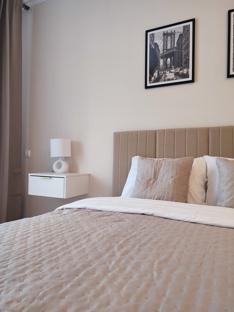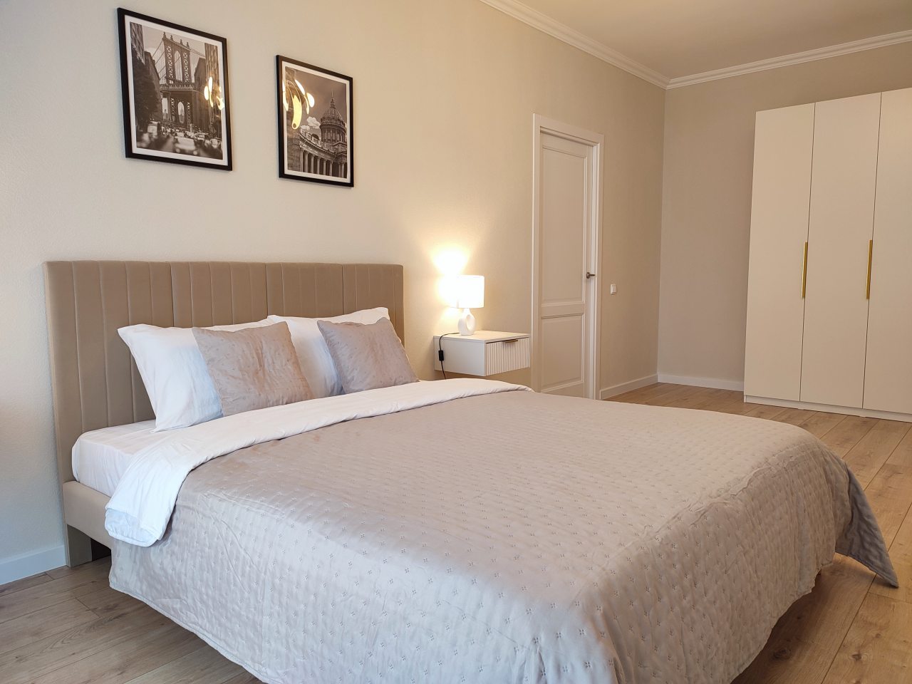 Внутри продумана каждая деталь для комфортного отдыха и проживания. В наличии — большая и удобная двуспальная кровать, прикроватные лампы и тумбы, вместительные шкафы, мягкий диван с телевизором. Ванная комната укомплектована стиральной машиной и феном.