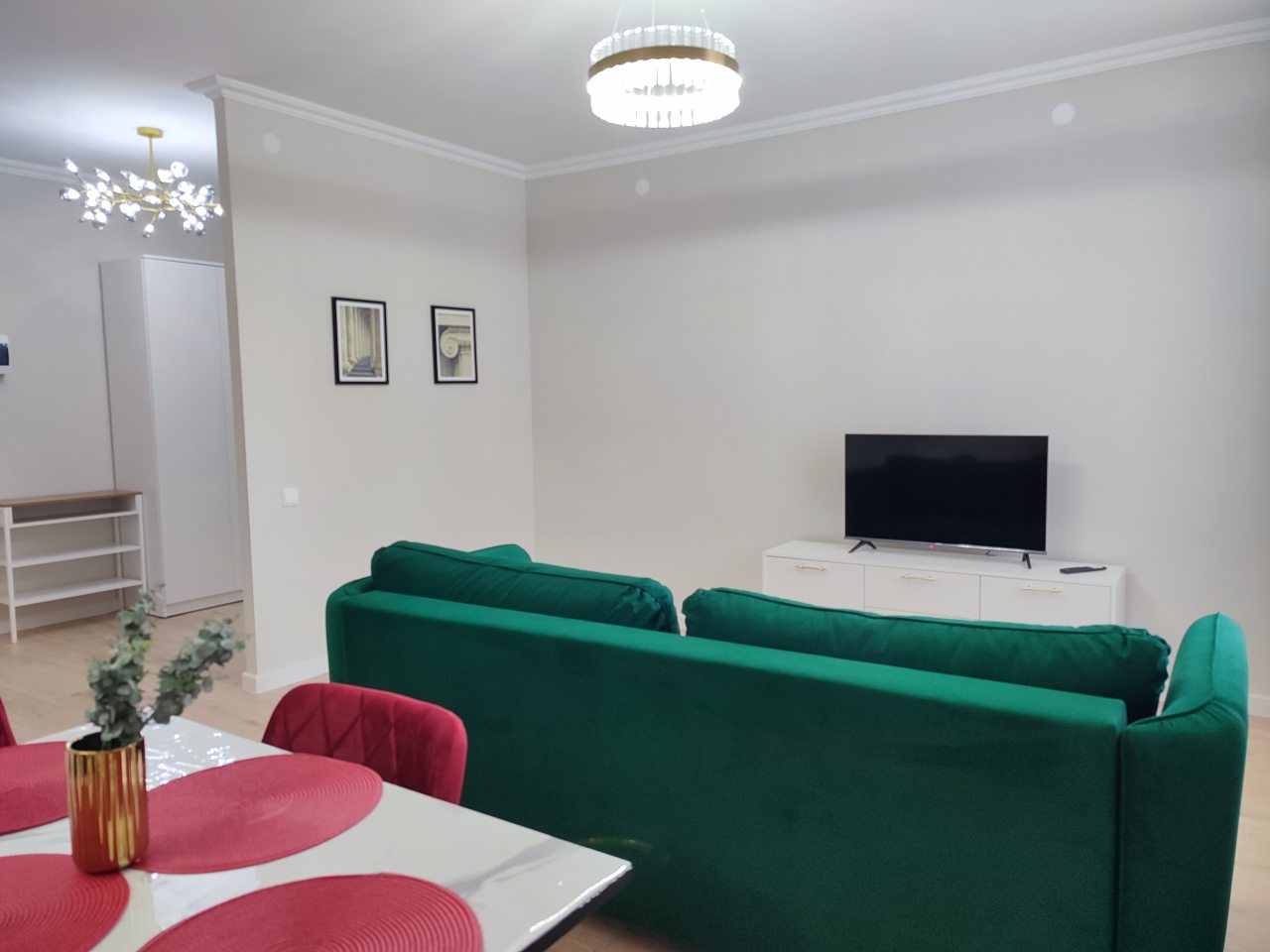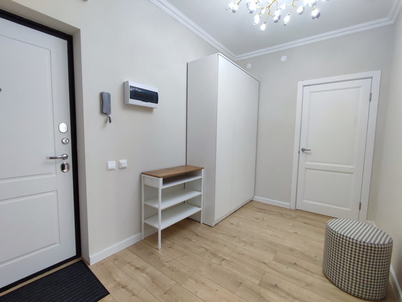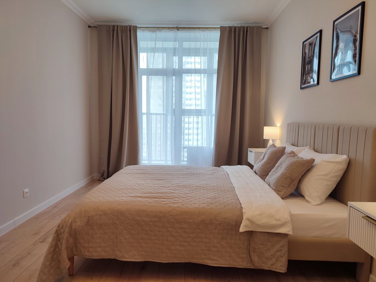 Внутри продумана каждая деталь для комфортного отдыха и проживания. В наличии — большая и удобная двуспальная кровать, прикроватные лампы и тумбы, вместительные шкафы, мягкий диван с телевизором. Ванная комната укомплектована стиральной машиной и феном.