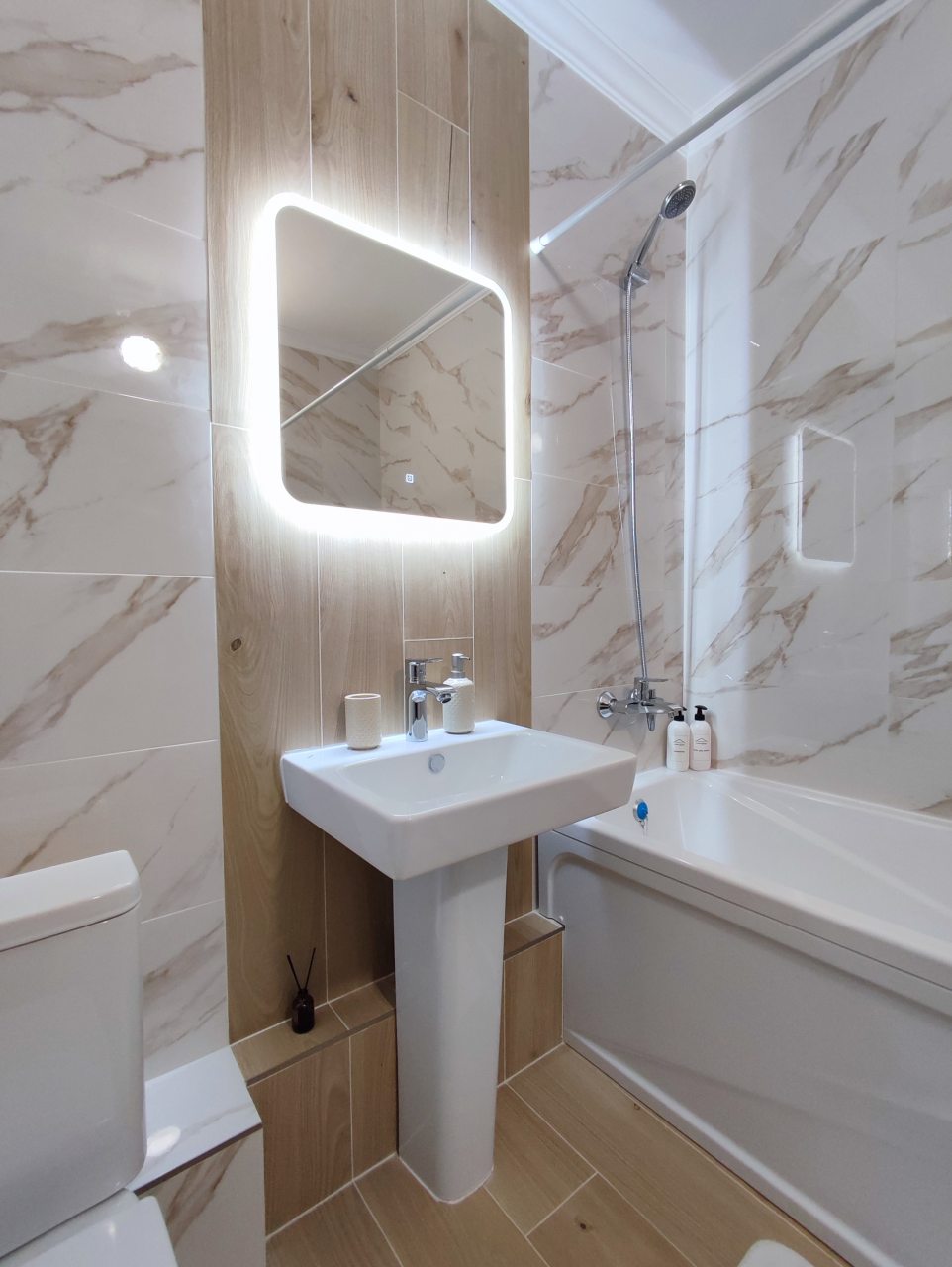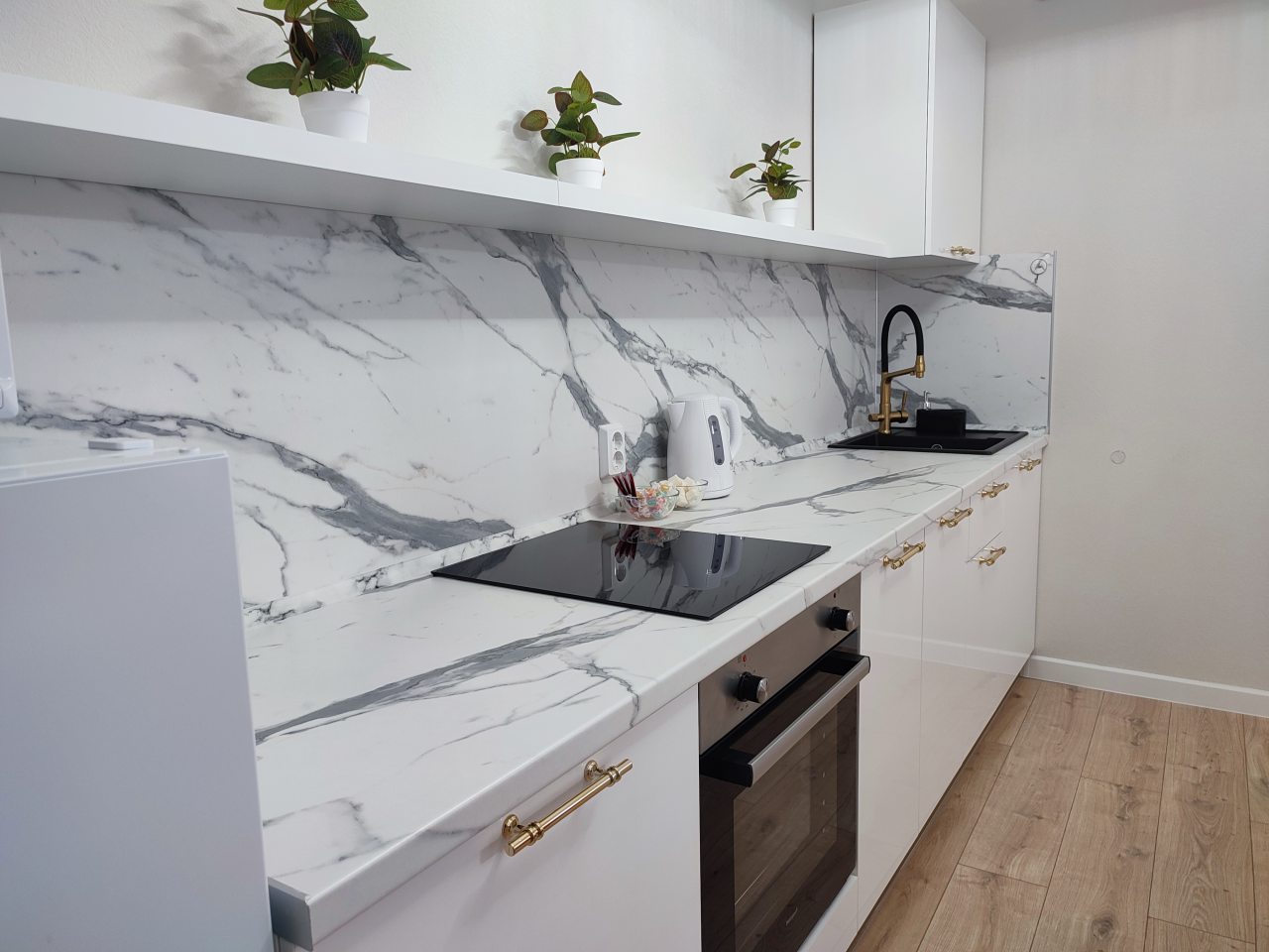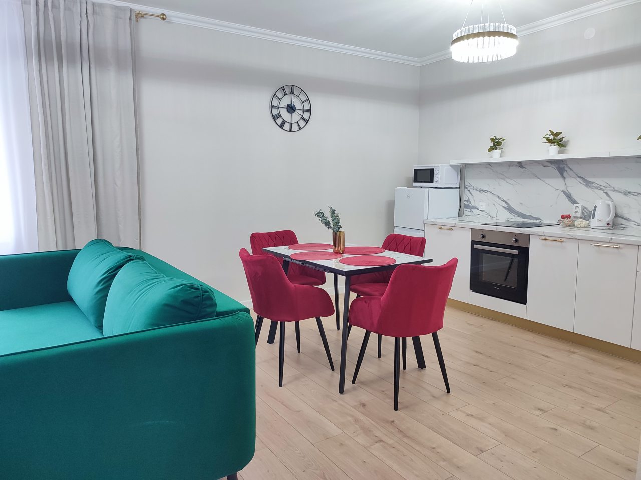 На уютной кухне будет приятно готовить любимые домашние напитки и блюда, поскольку она оснащена духовым шкафом, варочной панелью, чайником, холодильником, СВЧ, красивой обеденной зоной.