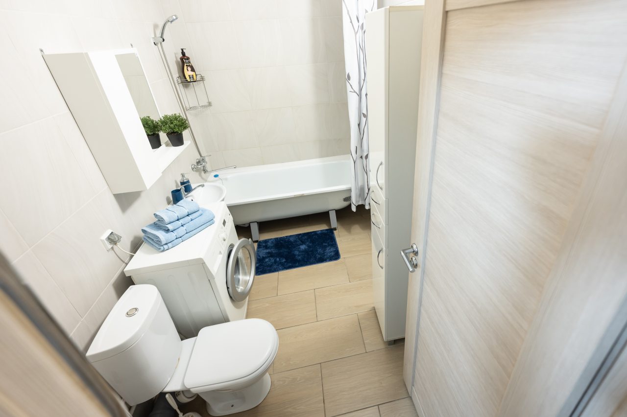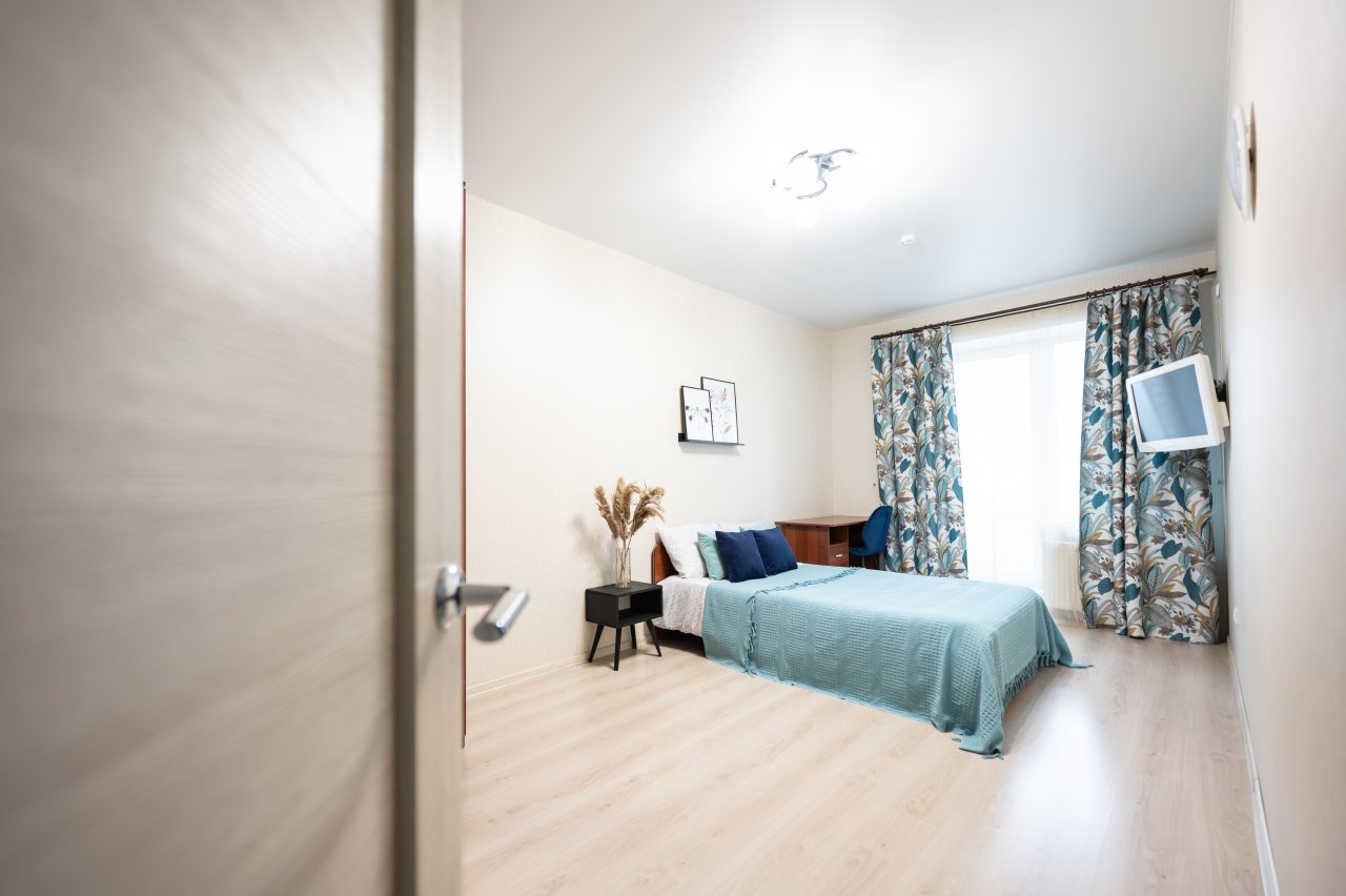 Светлые апартаменты укомплектованы удобной двуспальной кроватью, прикроватной мебелью, телевизором, небольшой рабочей зоной с письменным столом, кухней и балконом с панорамными окнами. Ванная комната оборудована сантехникой, средствами личной гигиены, стиральной машиной.