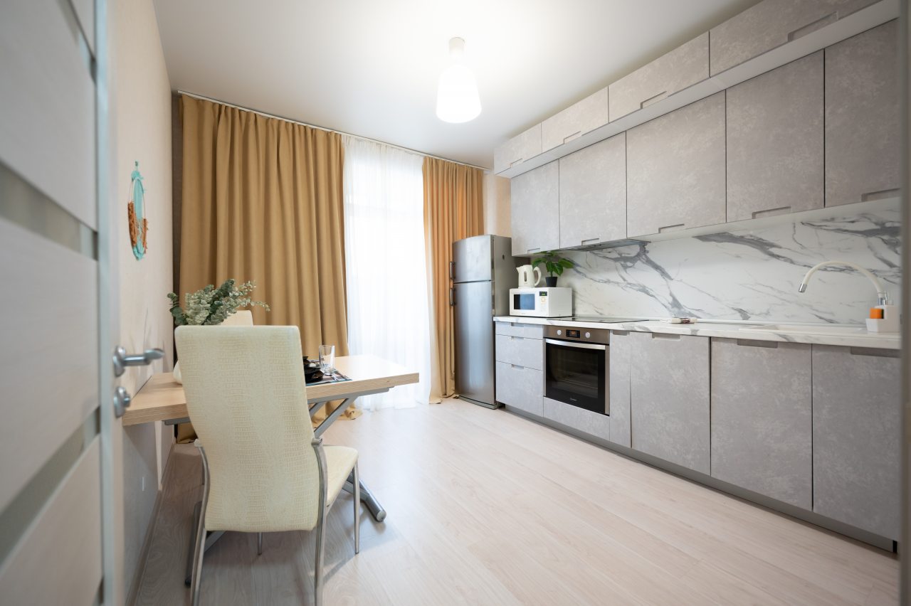 Кухня оснащена стильным гарнитуром, обеденным столом и бытовой техникой, такой как: холодильник, чайник, микроволновая печь и др. В доступности продуктовый магазин и кафе.
