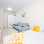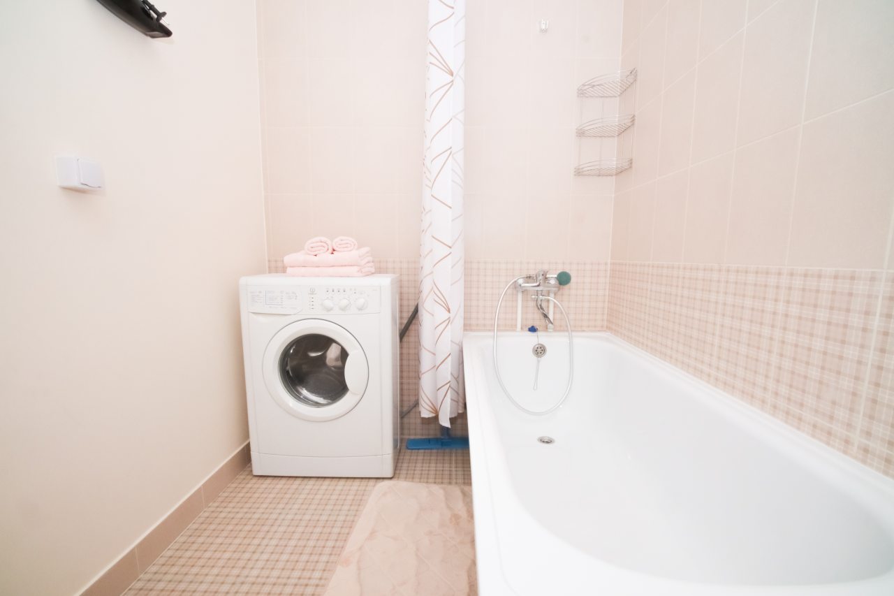 Светлые апартаменты оборудованы удобной двуспальной кроватью с чистым постельным бельем, диваном, шкафами, телевизором, прихожей, ванной комнатой и просторным балконом. Санузел имеет комплект необходимой сантехники, стиральную машину и фен для волос.