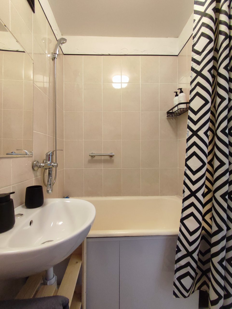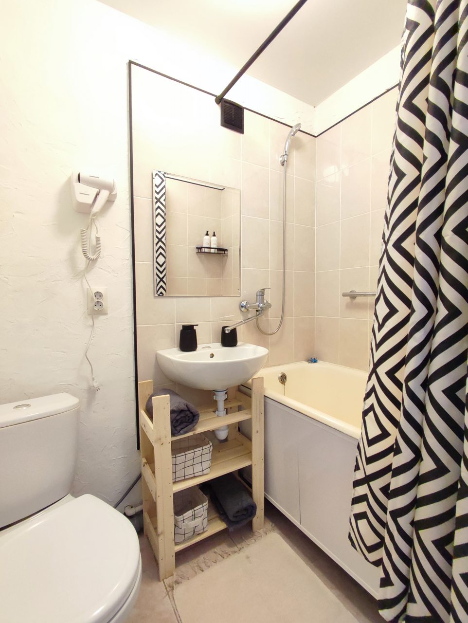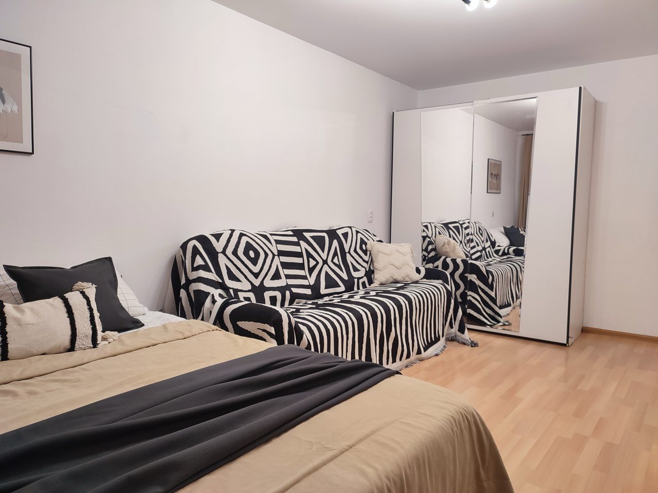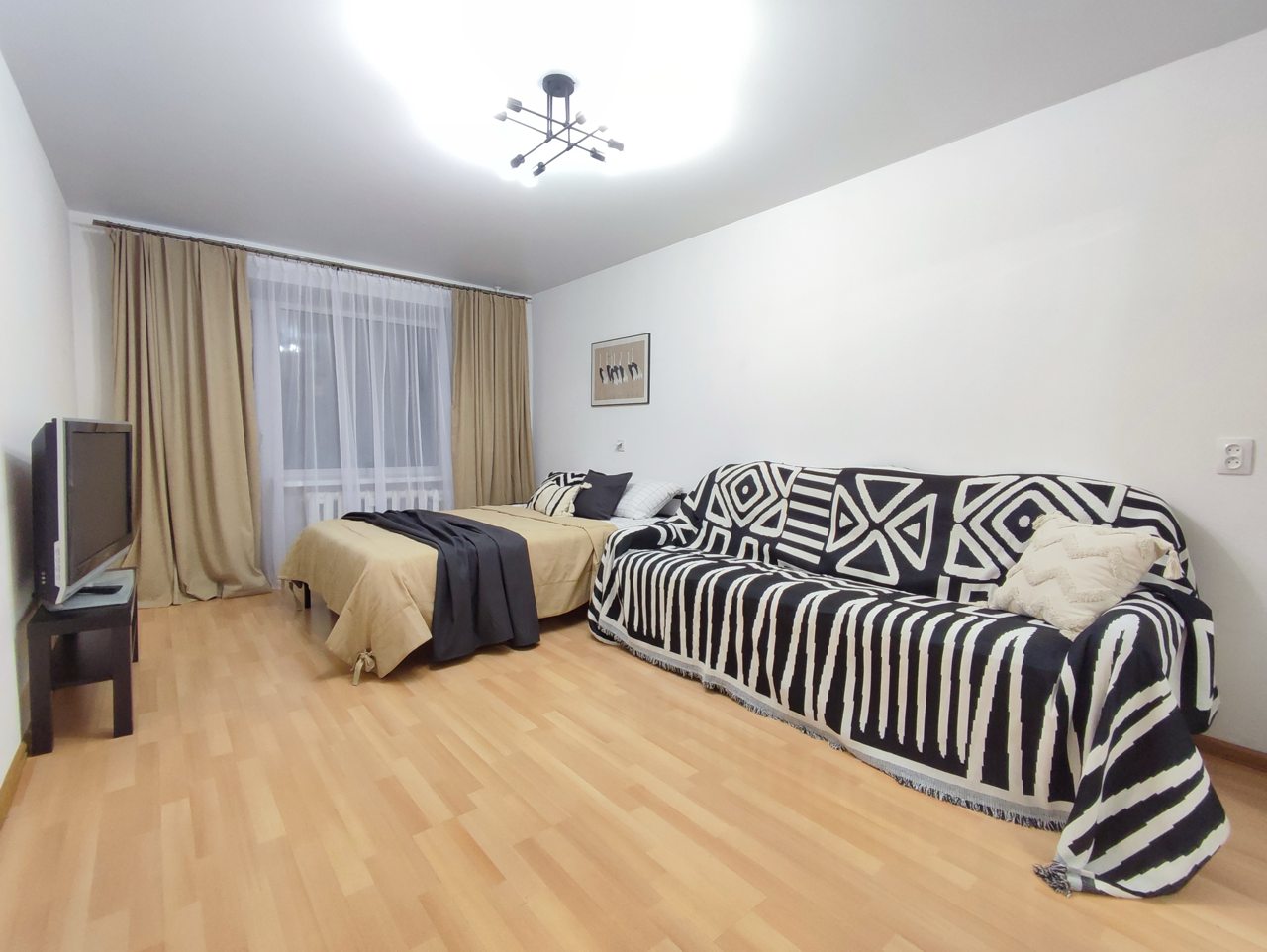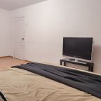Внутри всё продумано для полноценного отдыха и проживания, включая удобную двуспальную кровать, мягкий диван с телевизором, стиральную машину, вместительный шкаф с зеркалом в полный рост, а также полноценную ванну.