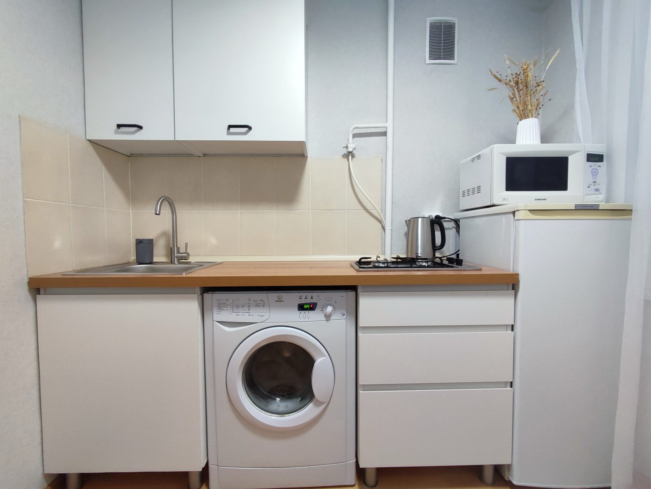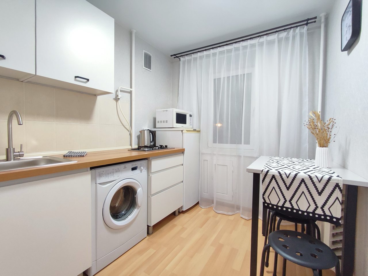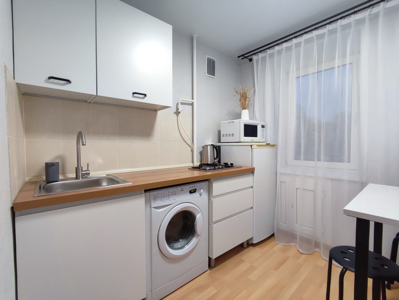 Кухня укомплектована чайником, плитой, СВЧ-печью, холодильником, уютной обеденной зоной, чтобы вы в любой момент могли насладиться любимыми домашними напитками и блюдами.