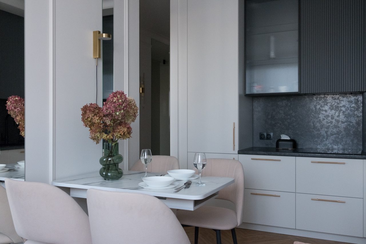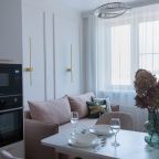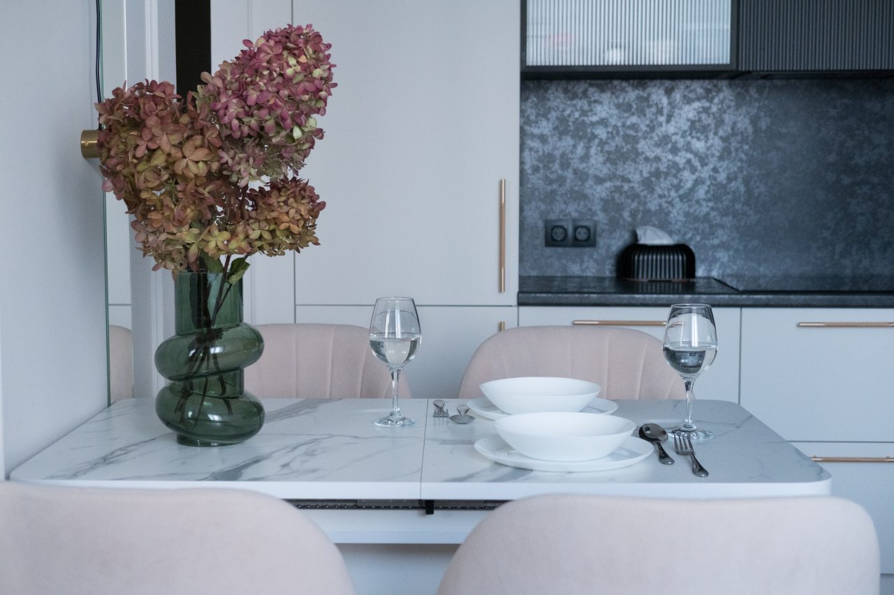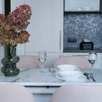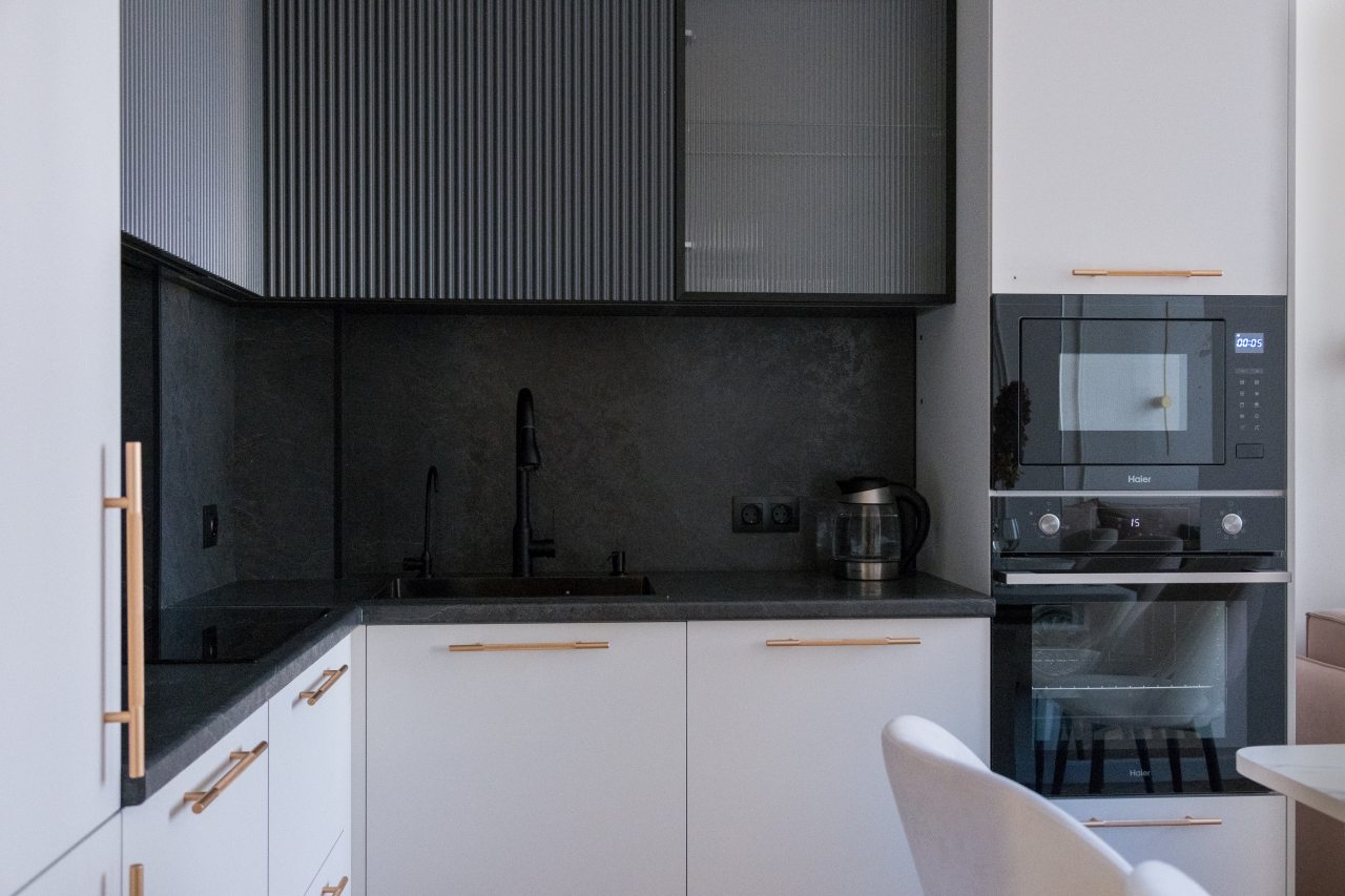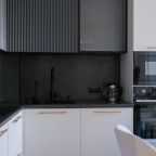На современной кухне будет приятно готовить и трапезничать, так как в наличии варочная панель, СВЧ-печь, духовой шкаф, чайник и обеденная зона.