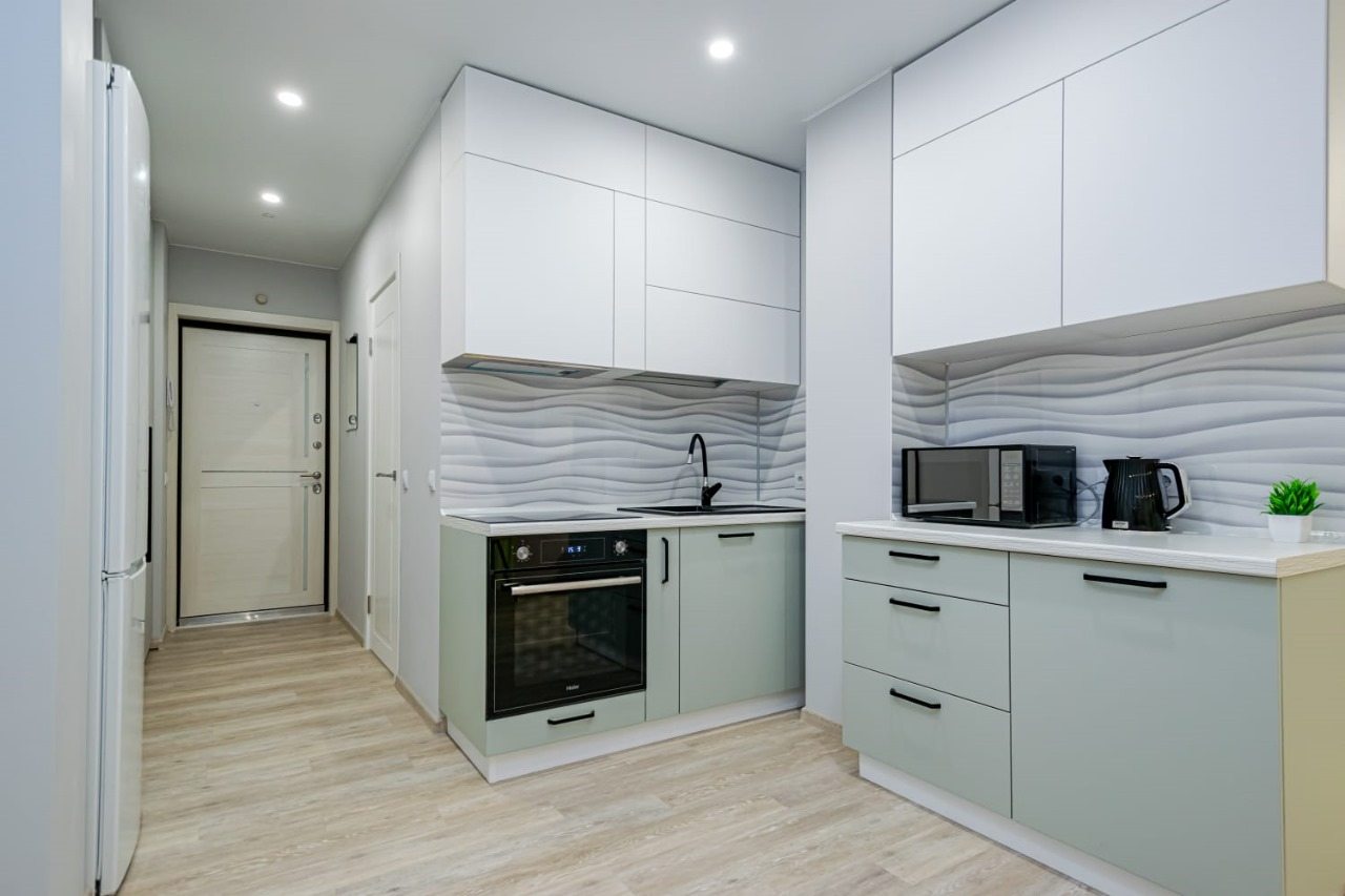 Кухня оборудована гарнитуром, духовым шкафом, варочной панелью, холодильником, микроволновой печью, чайником, вытяжкой и др. В доступности продуктовые магазины.