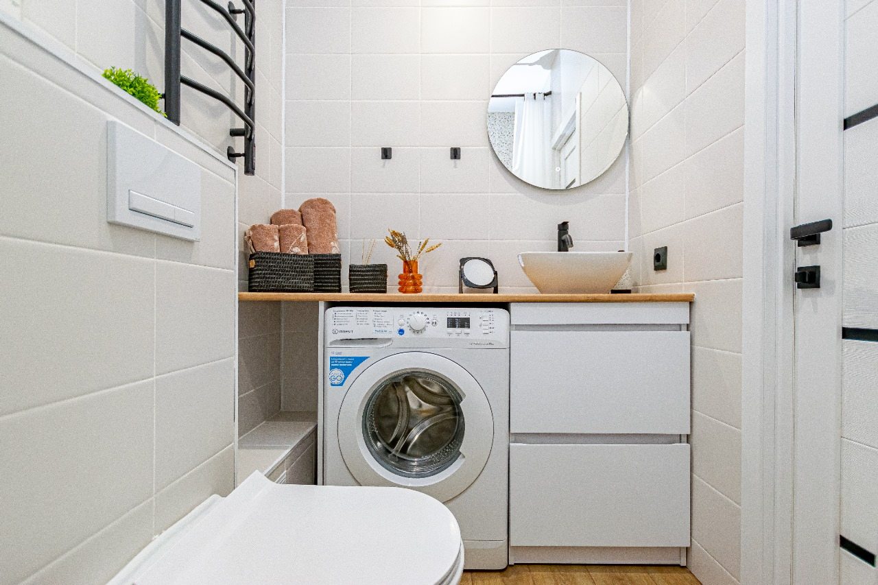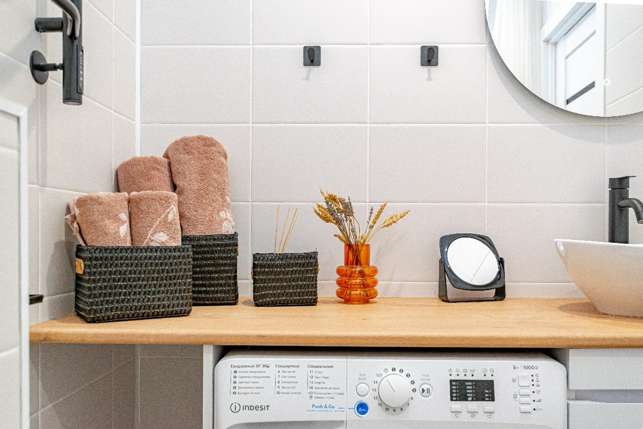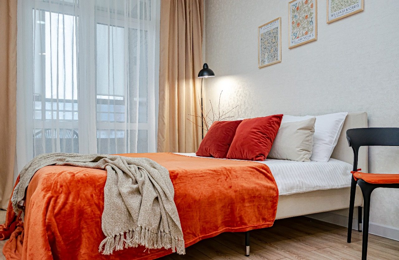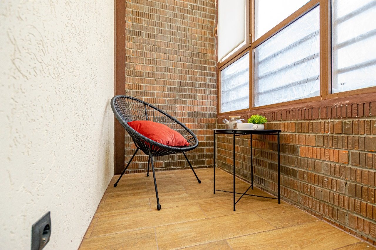 Внутри вас ожидает современный и стильный интерьер: двуспальная кровать с качественным матрасом, прикроватная лампа, телевизор, лоджия с зоной отдыха, санузел с необходимой сантехникой, стиральной машиной и полотенцами.