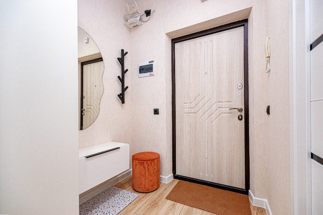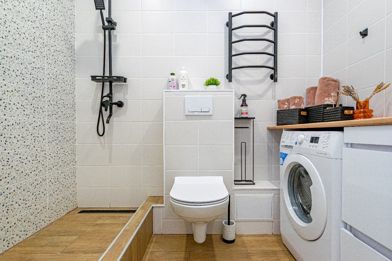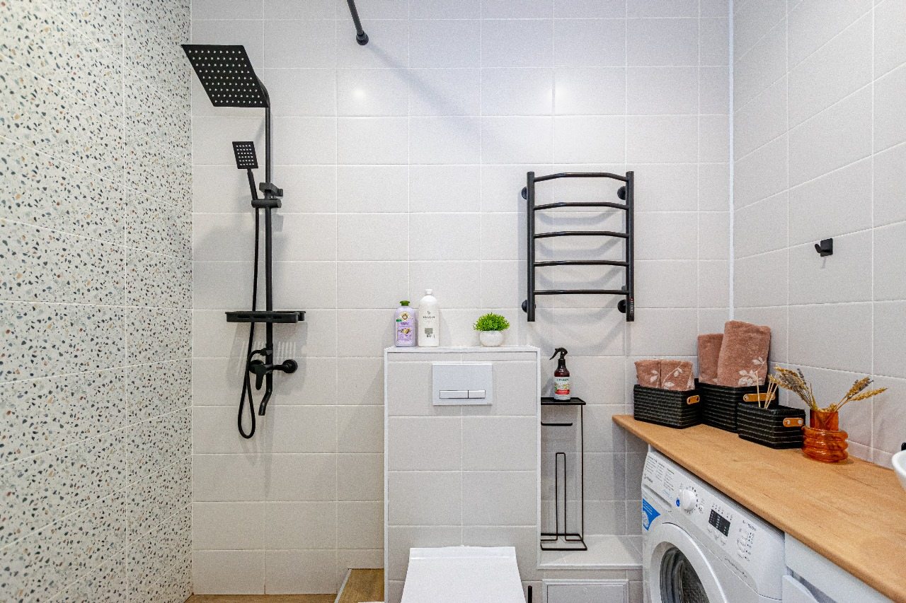 Внутри вас ожидает современный и стильный интерьер: двуспальная кровать с качественным матрасом, прикроватная лампа, телевизор, лоджия с зоной отдыха, санузел с необходимой сантехникой, стиральной машиной и полотенцами.