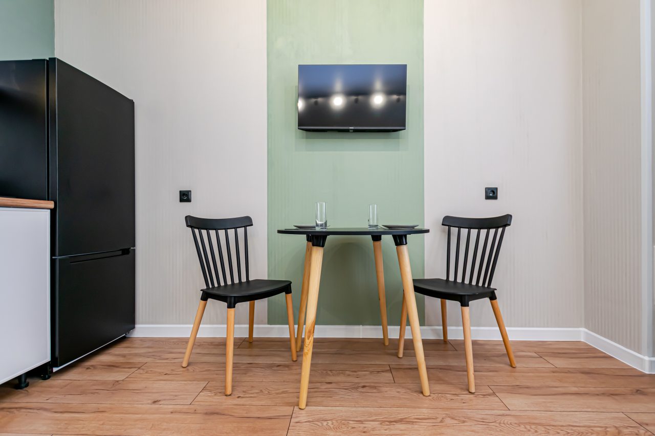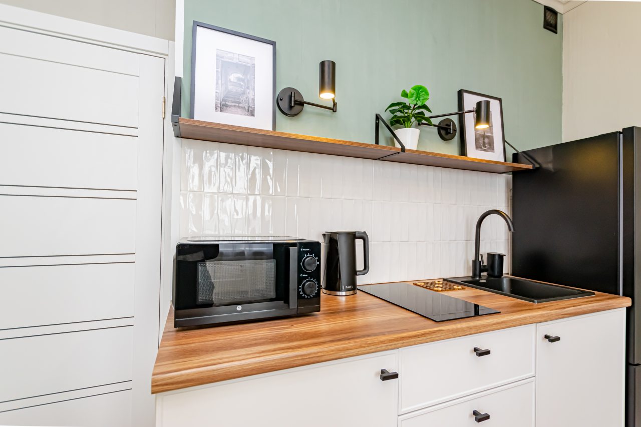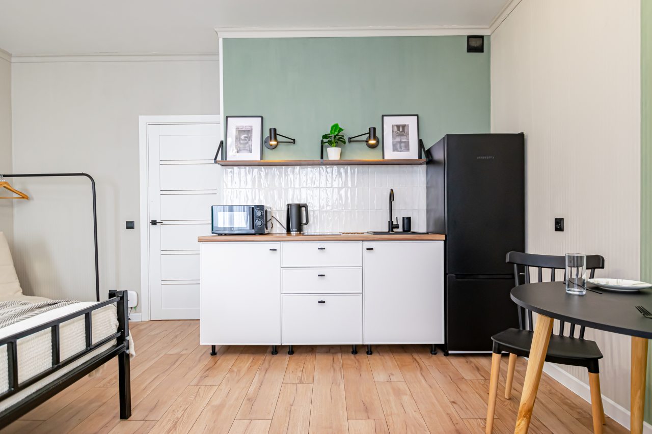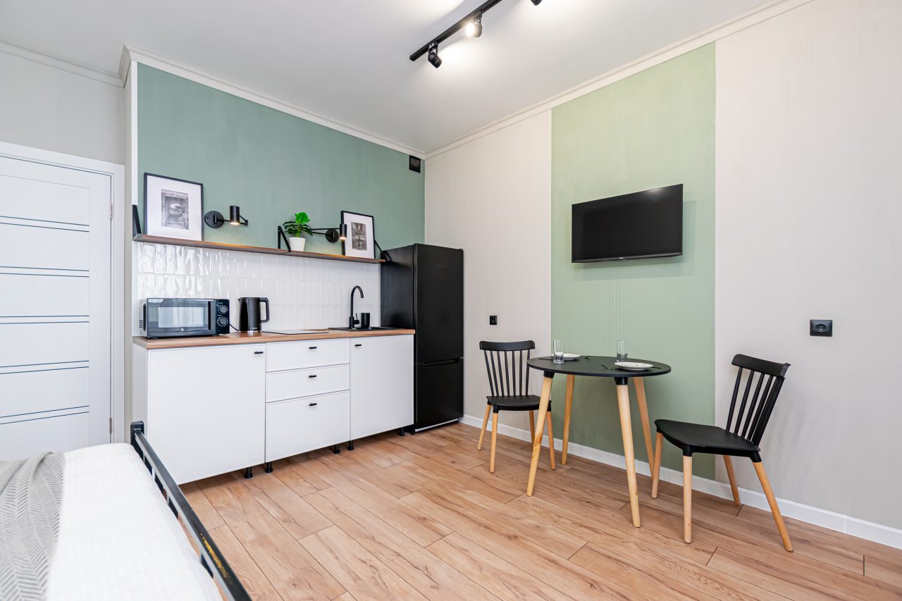 Кухонная зона включает в себя холодильник, чайник, варочную панель, СВЧ, чтобы вы могли в любое время организовать вкусный домашний завтрак, обед или ужин.