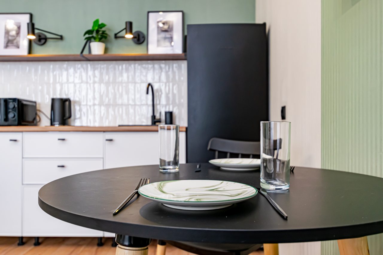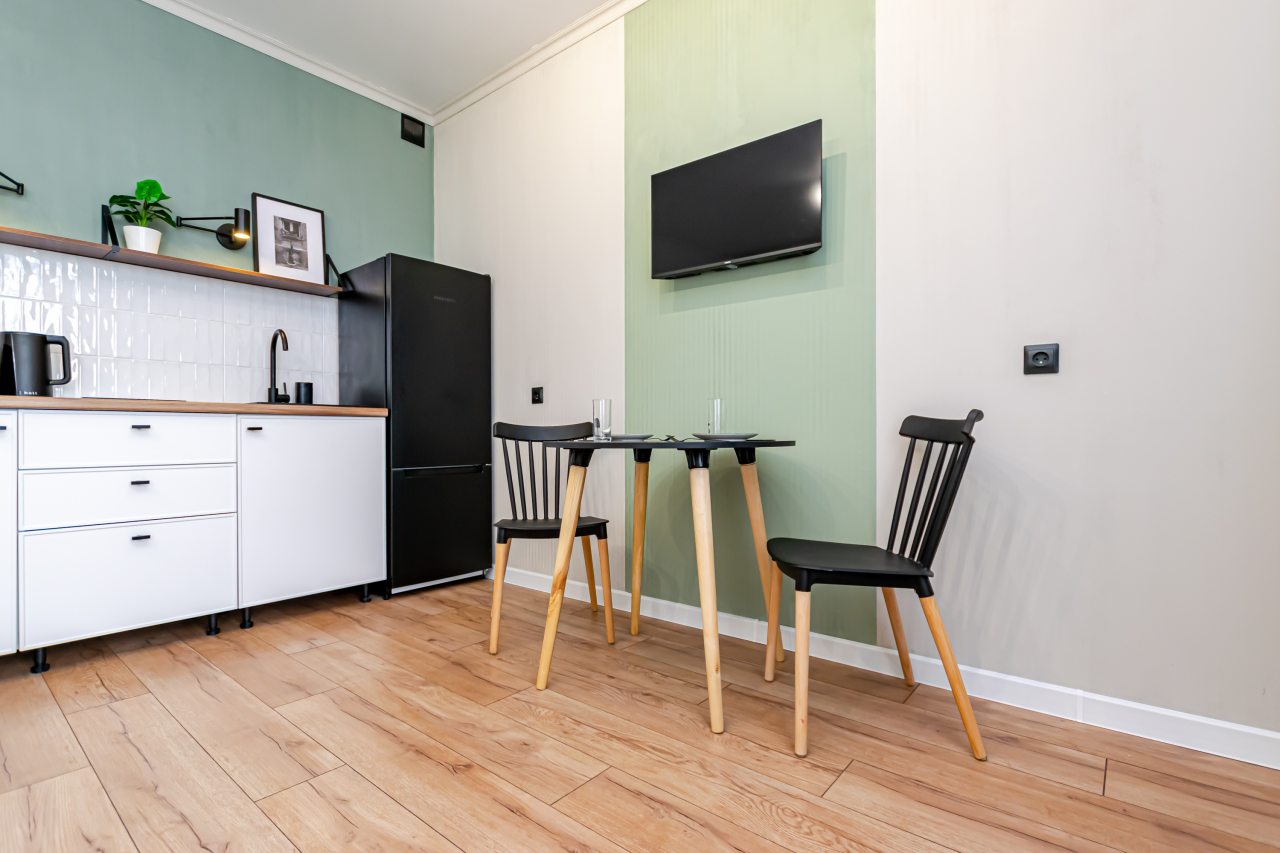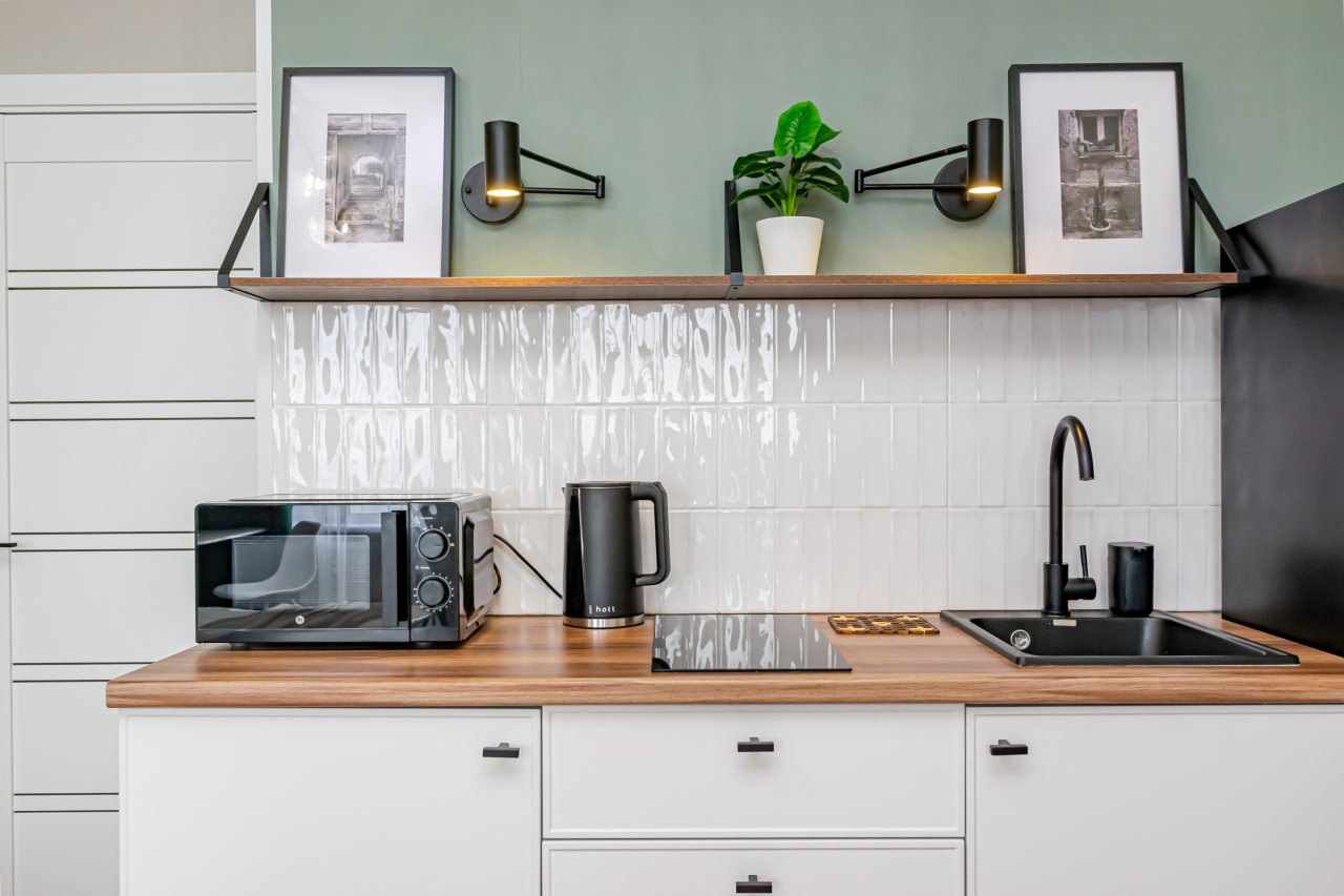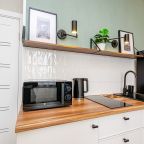 Кухонная зона включает в себя холодильник, чайник, варочную панель, СВЧ, чтобы вы могли в любое время организовать вкусный домашний завтрак, обед или ужин.