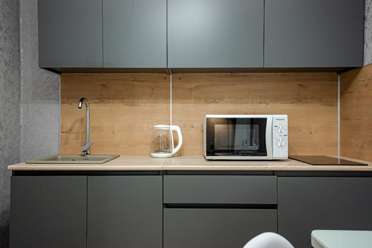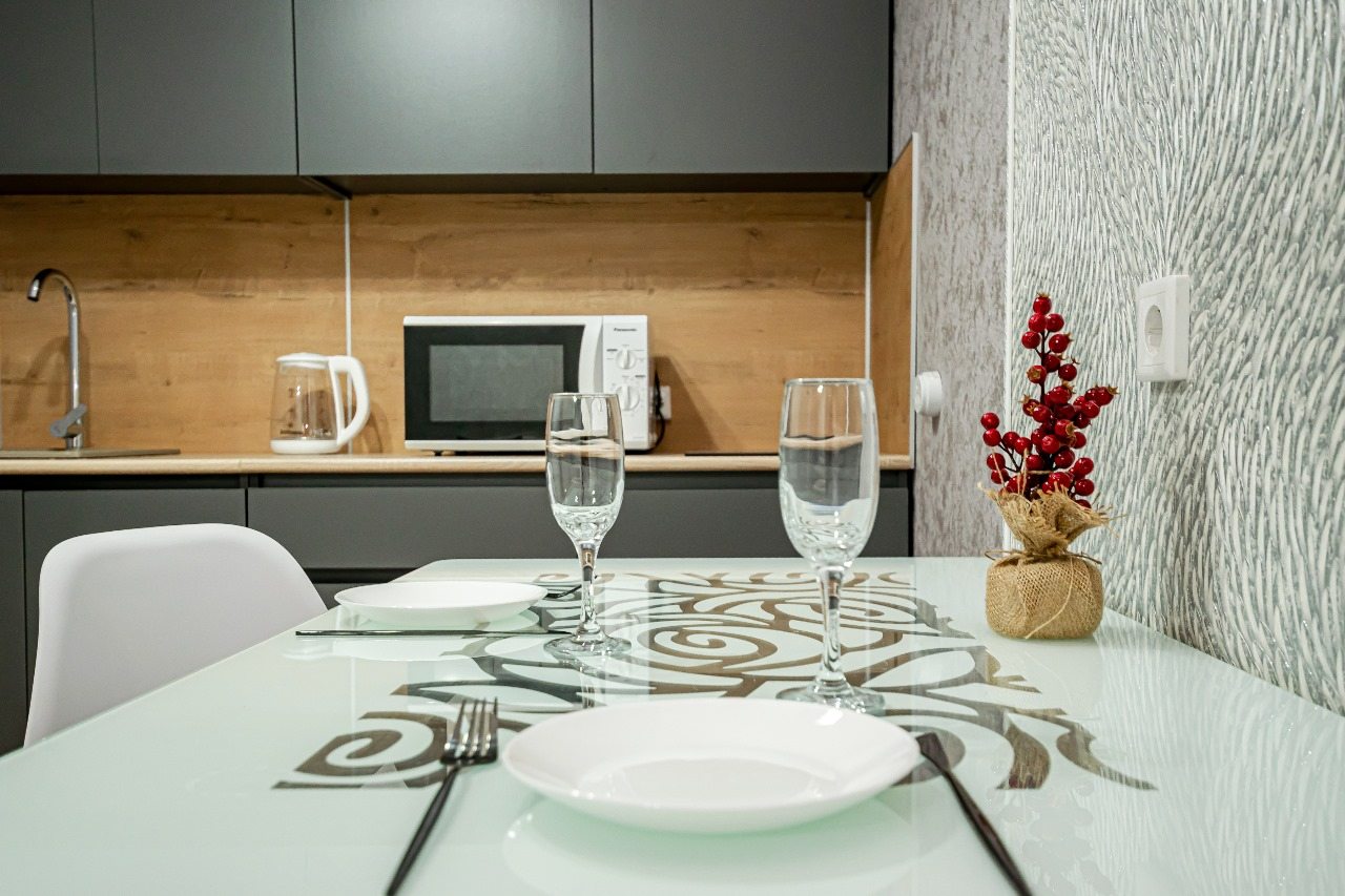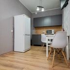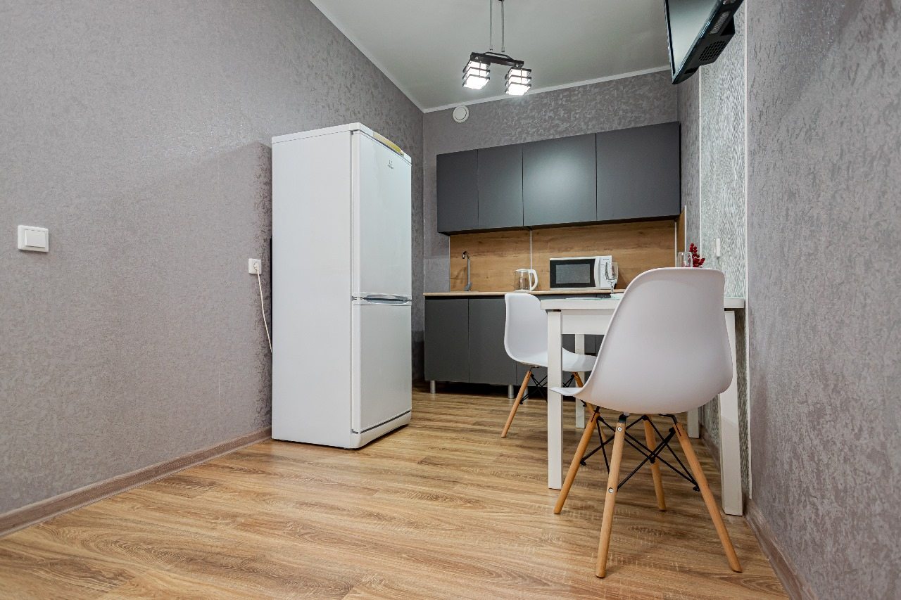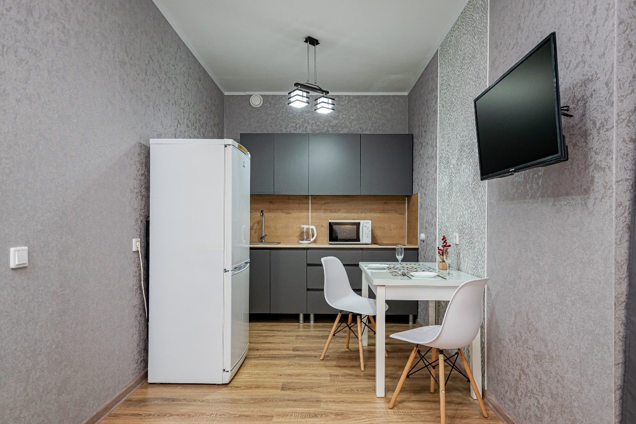 Кухонная зона укомплектована гарнитуром, обеденным столом и необходимой бытовой техникой. Пообедать можно в ближайшем кафе.
