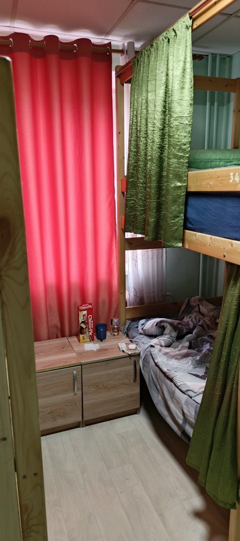 Шторка, прикрепленная к кровати, с помощью которой можно укрыться от внешнего мира. На кухне есть всё, чтобы приготовить простой завтрак, продукты у каждого свои. Можно пользоваться телевизором, есть бесплатный Wi-Fi. В хостеле мне было удобно.