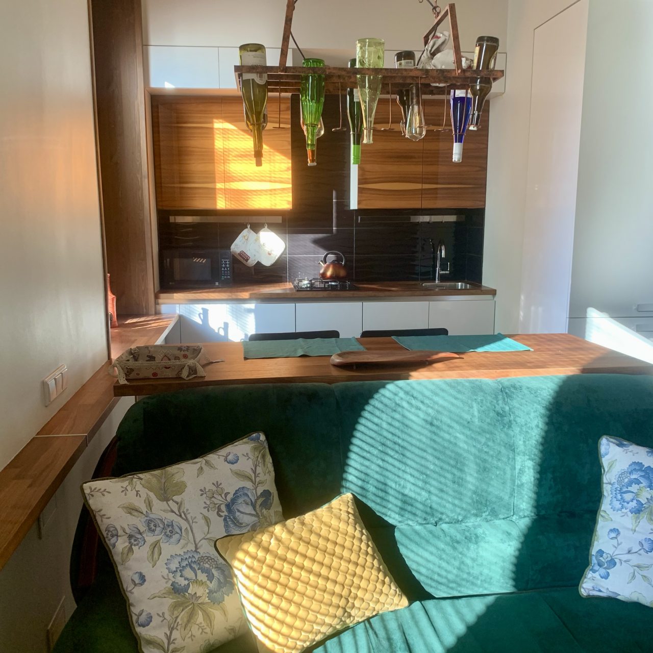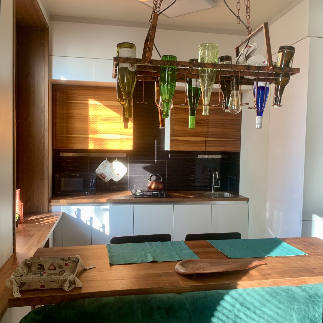 Кухонная зона оснащена плитой, чайником, СВЧ-печью, холодильником, а также обеденным столом со стульями, чтобы вы могли в любой момент порадовать себя любимой едой и напитками.