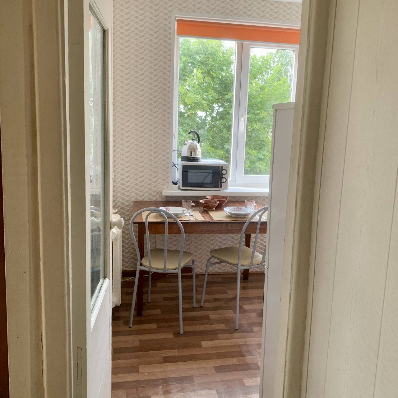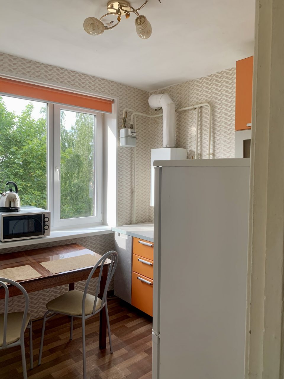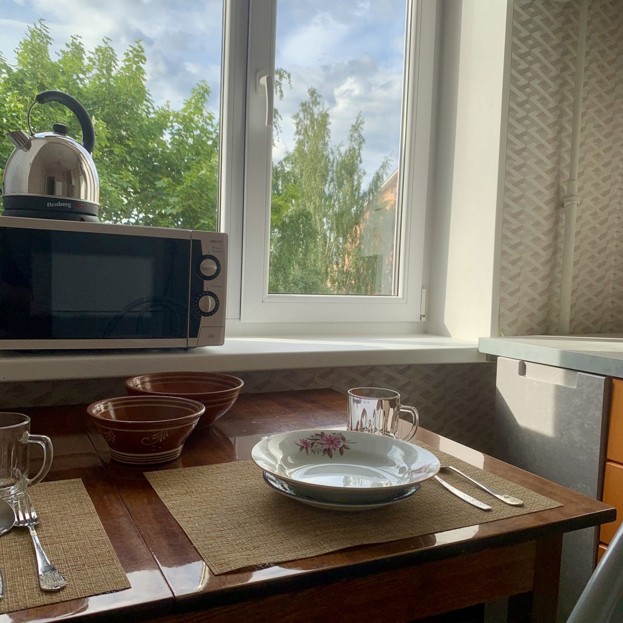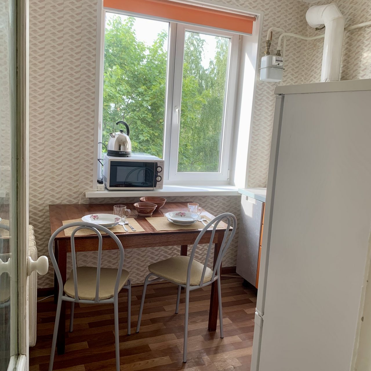 На кухне будет удобно и приятно готовить, так как в наличии плита, посуда, СВЧ-печь, духовой шкаф, чайник, обеденная зона и холодильник.
