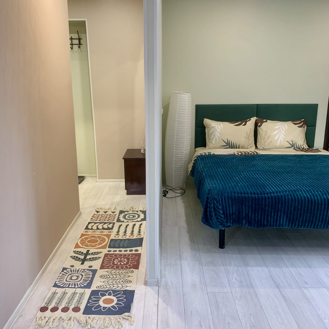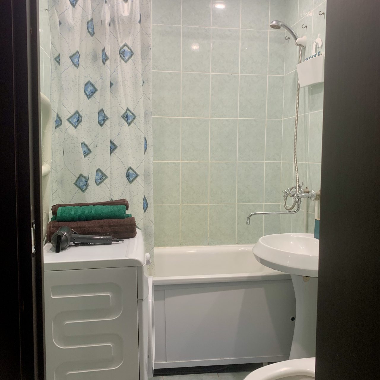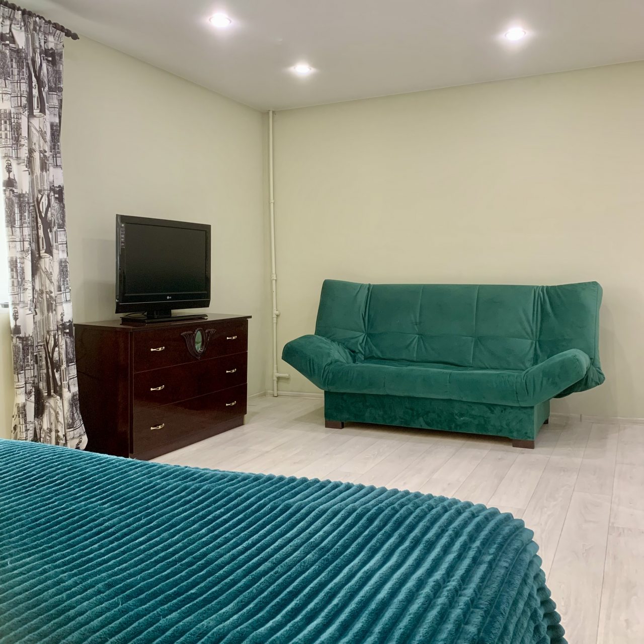 Для комфортного проживания предусмотрено всё необходимое, в том числе: удобная двуспальная кровать, мягкий диван с телевизором, комод, а также ванная комната со стиральной машиной, феном, полотенцами и средствами для гигиены.