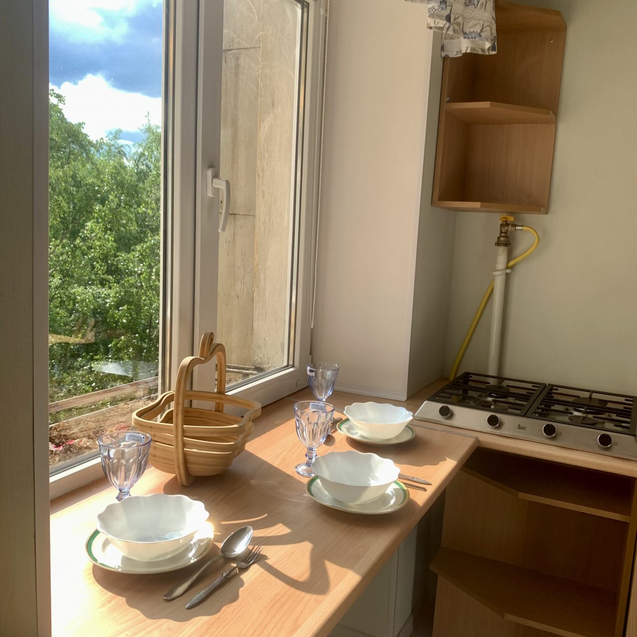 Кухонная зона включает в себя плиту, чайник, холодильник и посуду, таким образом вы сможете наслаждаться приготовлением домашних блюд и напитков.
