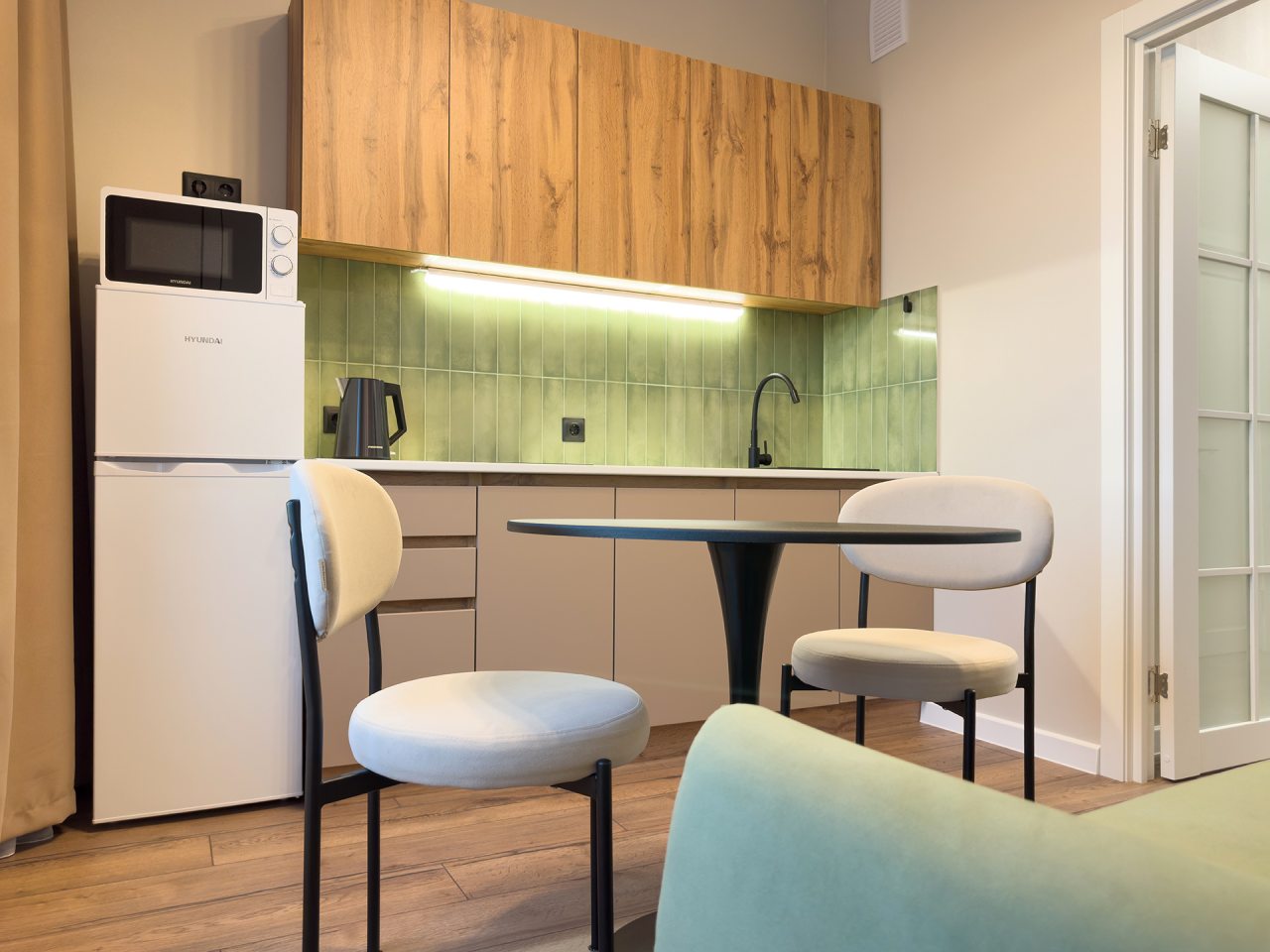 На уютной кухне будет приятно готовить и трапезничать. В наличии: плита, чайник, холодильник, СВЧ, обеденный стол и стулья.