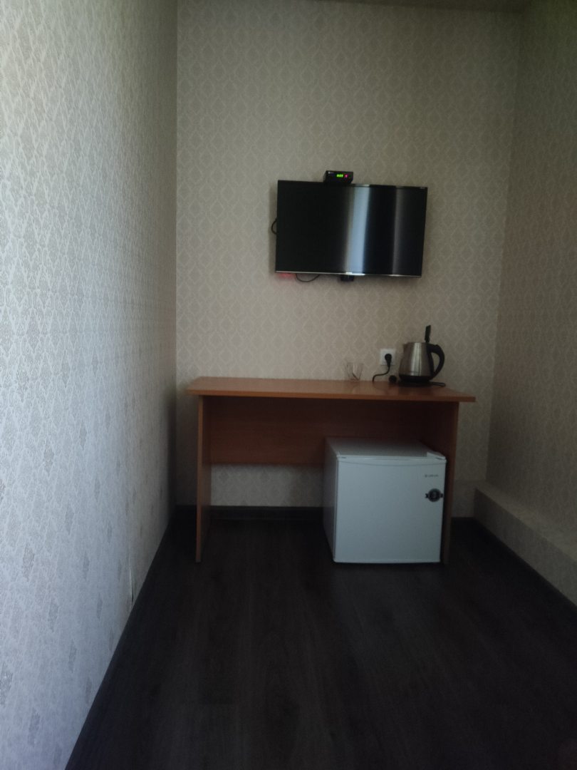 В номере имеется кровать, шкаф, тумбочка, мини холодильник, чайник, стол, собственная ванная