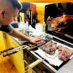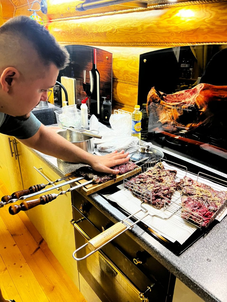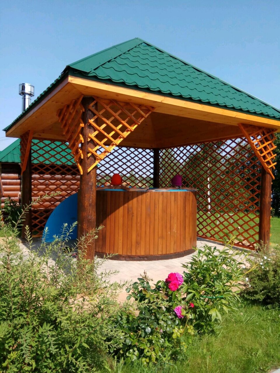 На оборудованной кухне имеется комплект гарнитура, холодильник, посудомоечная машина, электрическая плита, духовой шкаф, чайник и набор посуды. Во дворе есть зона барбекю для самостоятельного приготовления мяса и овощей, а также беседка для отдыха.
