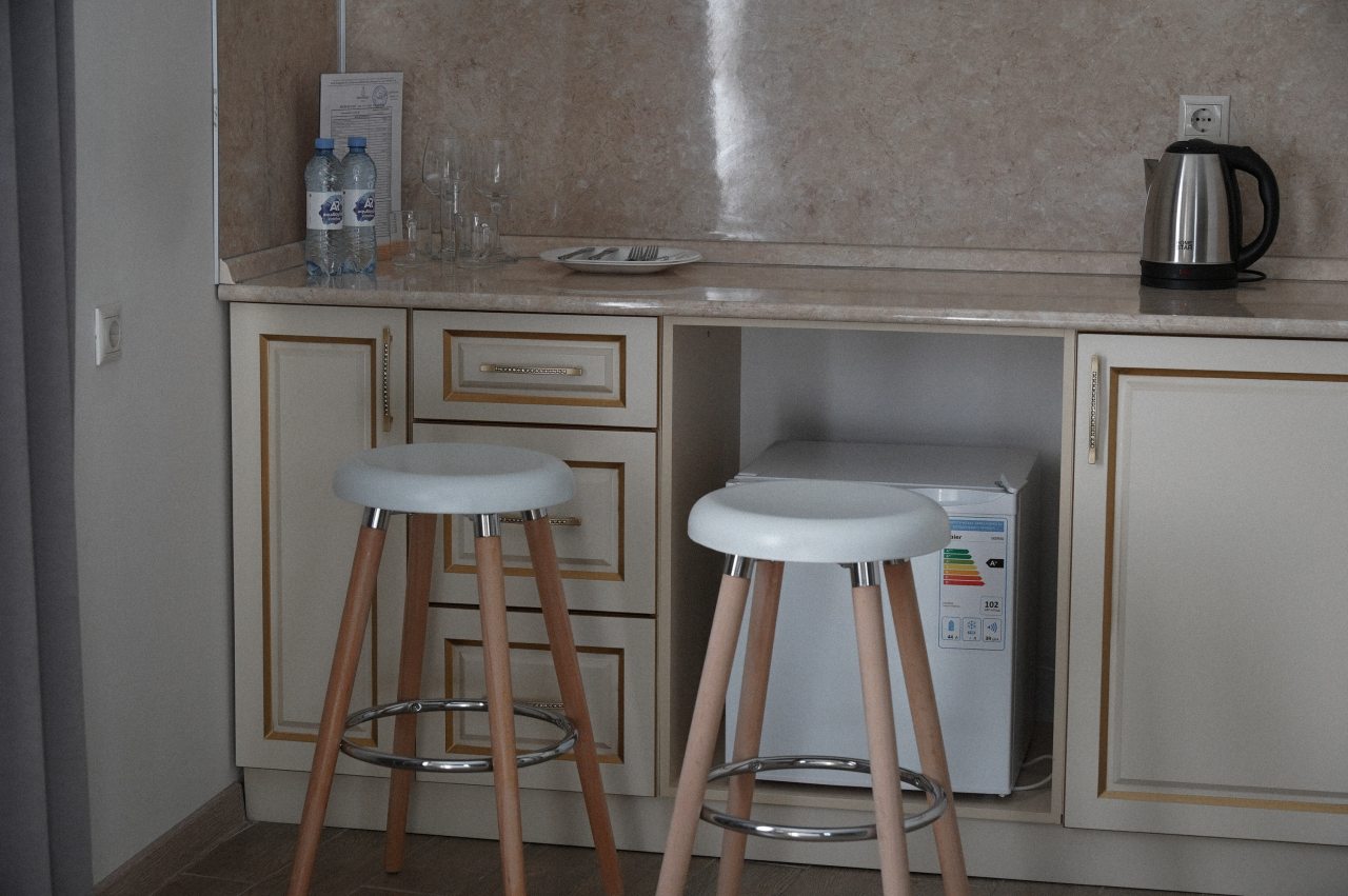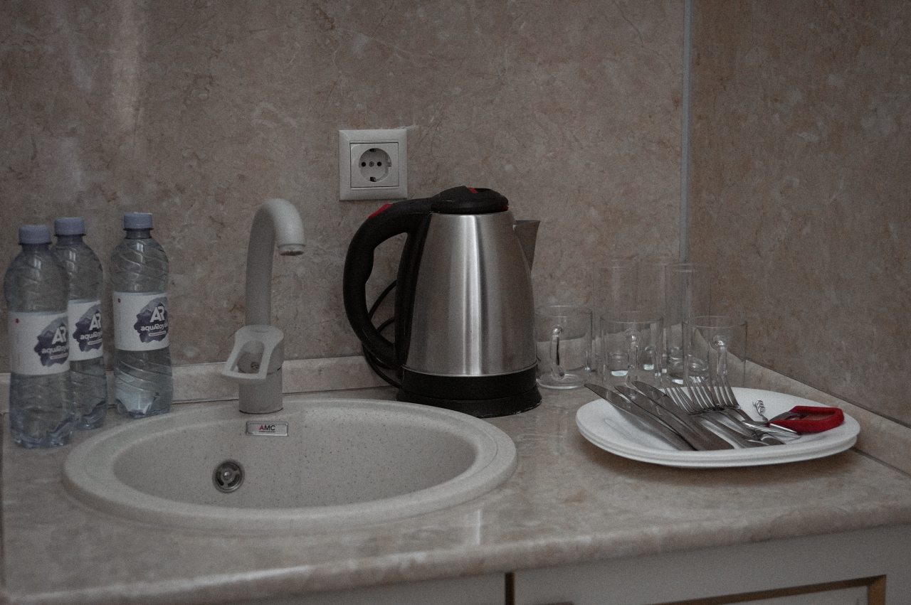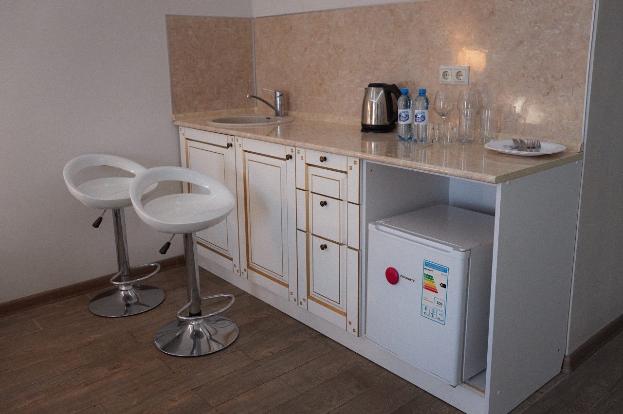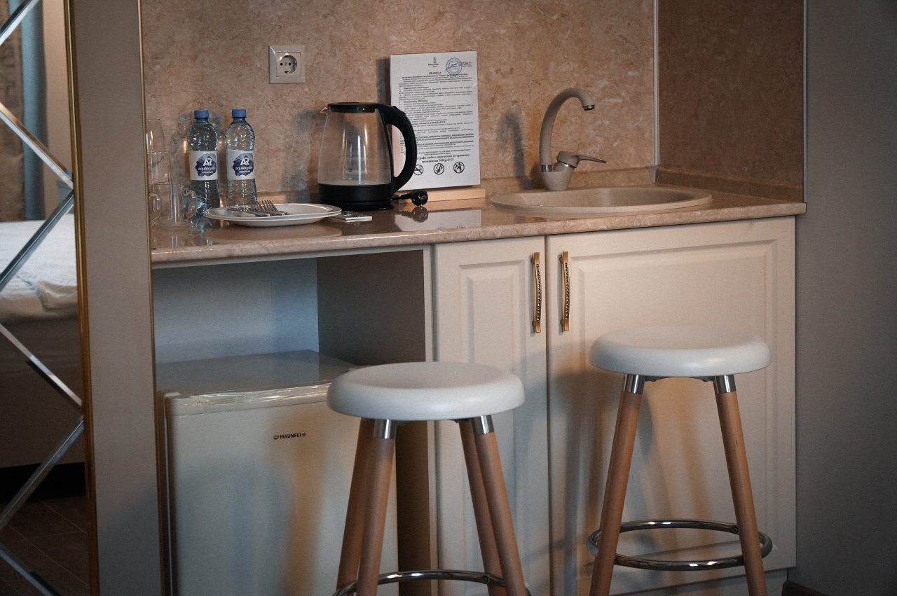 Особая прелесть номеров это кухонная зона с наличием тарелок, вилок, ножей и даже открывашек для пивных и винных бутылок