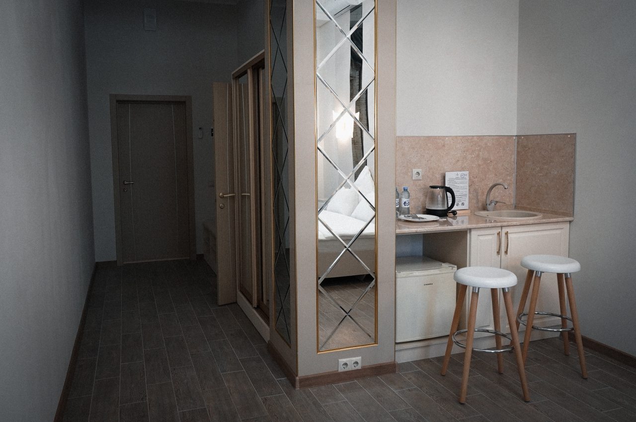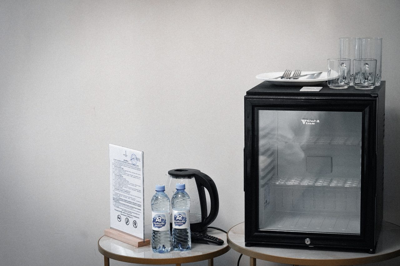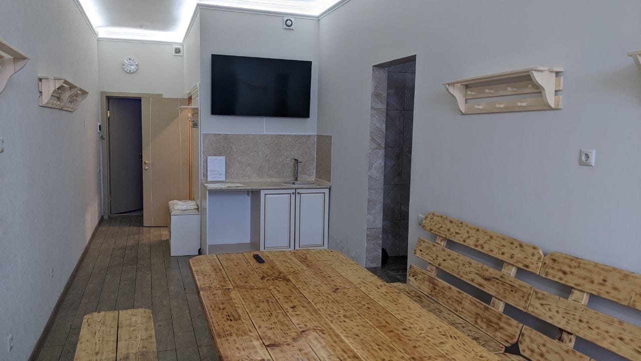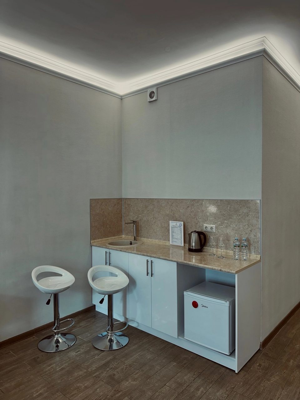 Особая прелесть номеров это кухонная зона с наличием тарелок, вилок, ножей и даже открывашек для пивных и винных бутылок