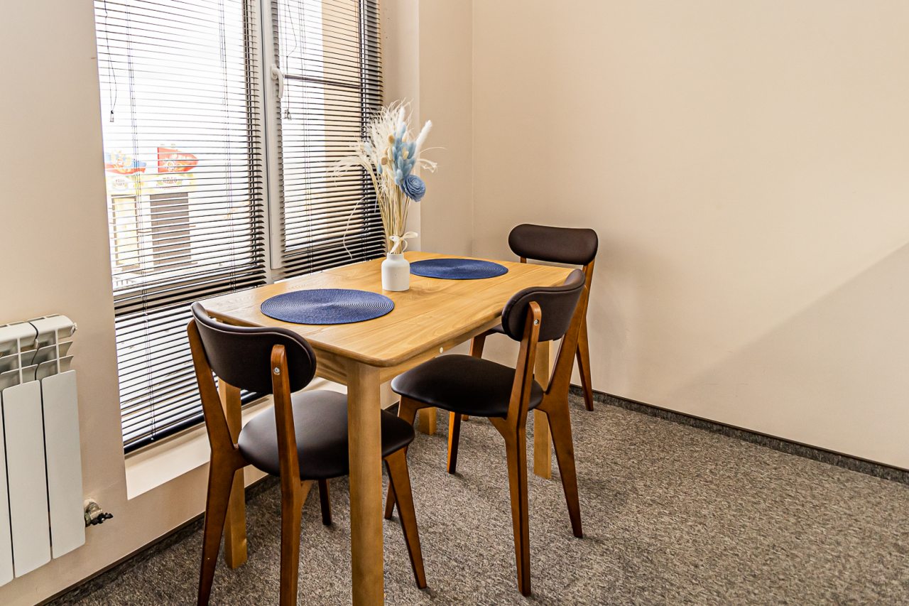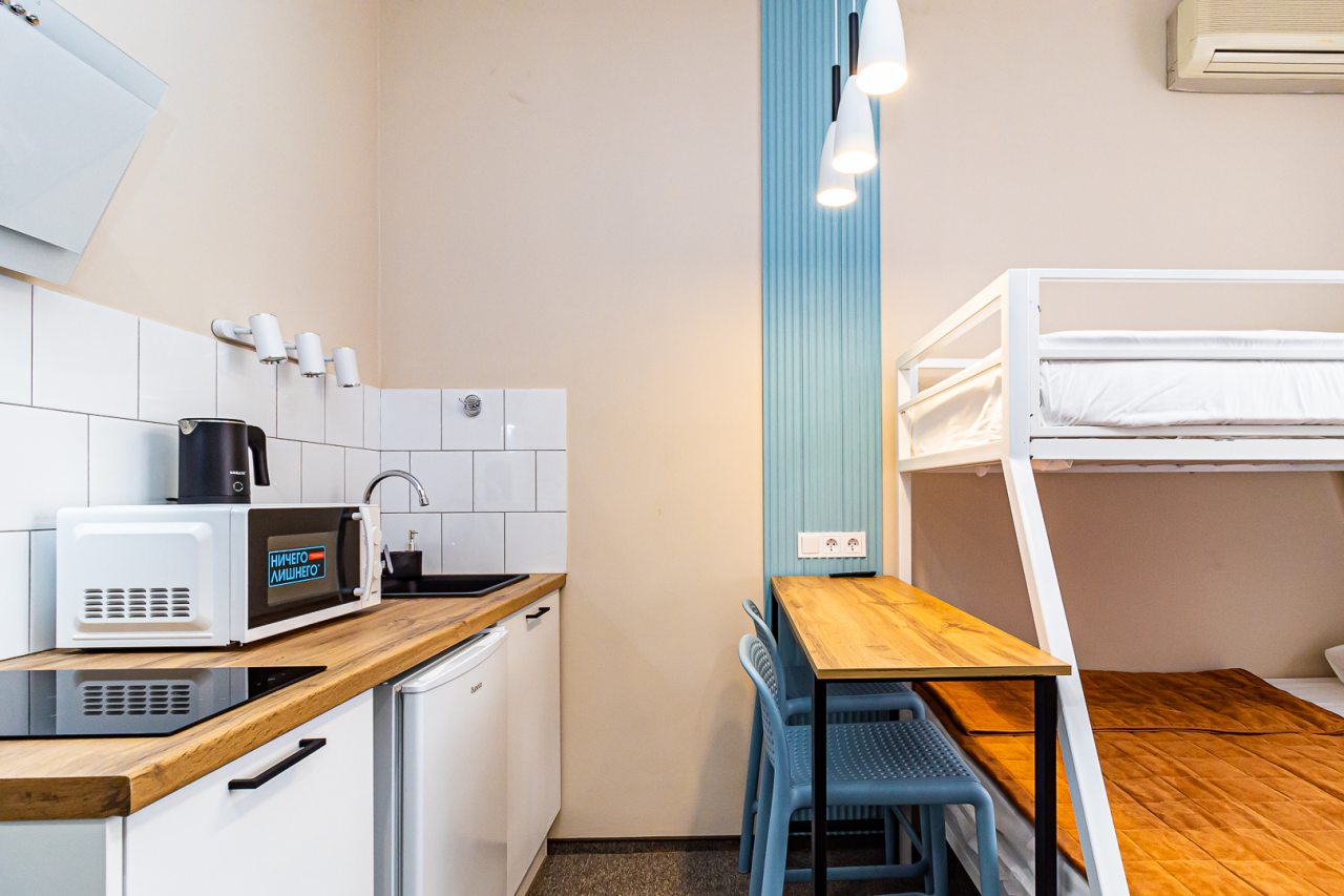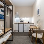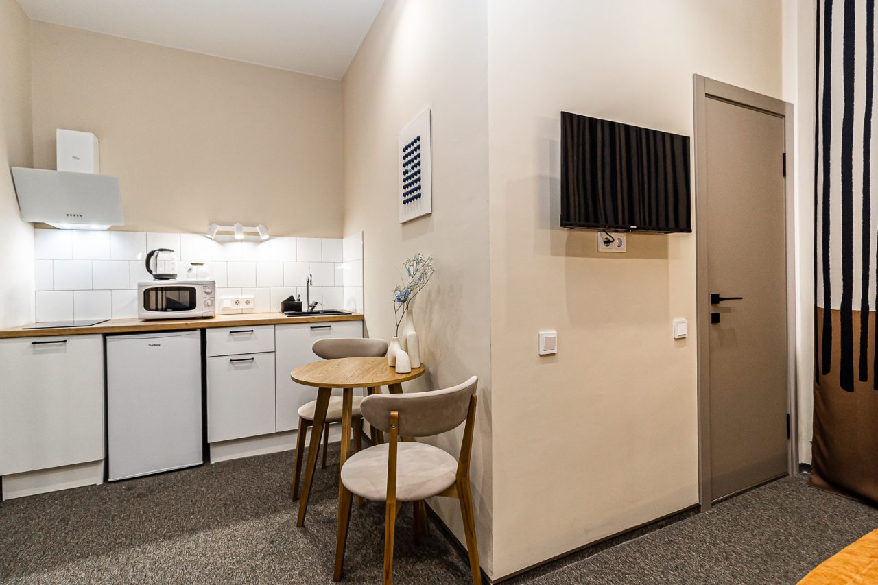В номере есть кухня, оснащённая электрическим чайником, варочной панелью, всеми нужными приборами. Если же хочется поесть вне отеля, это можно сделать в ресторане «Baklajan».