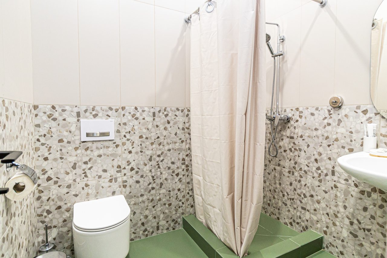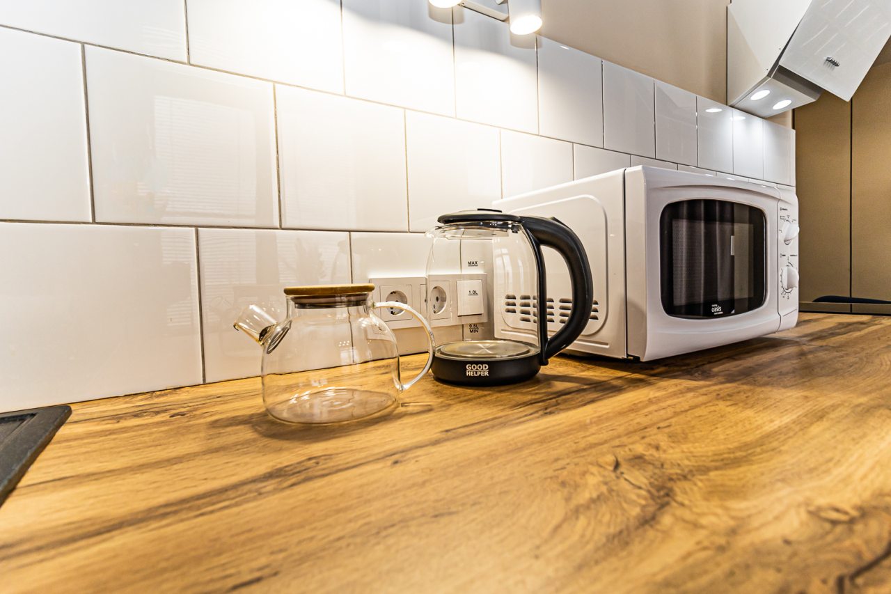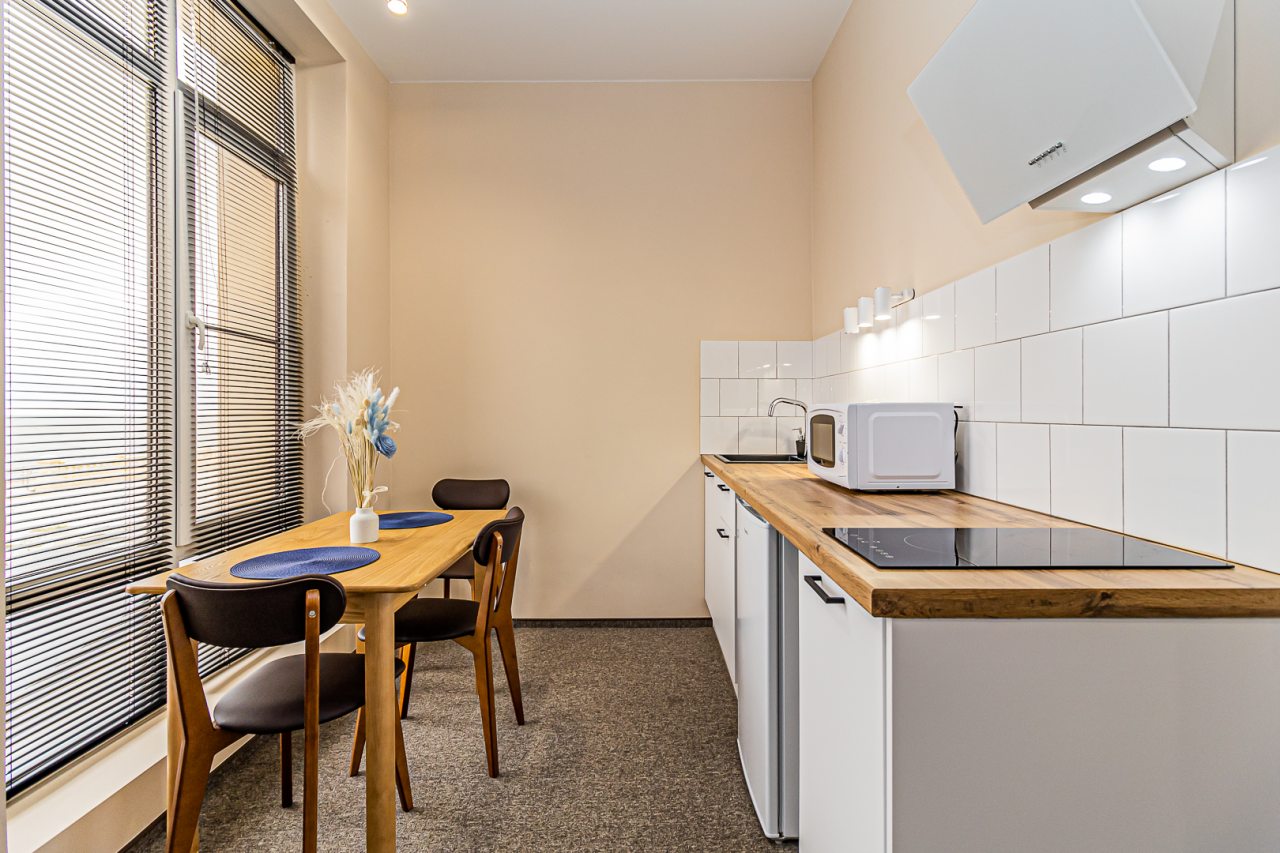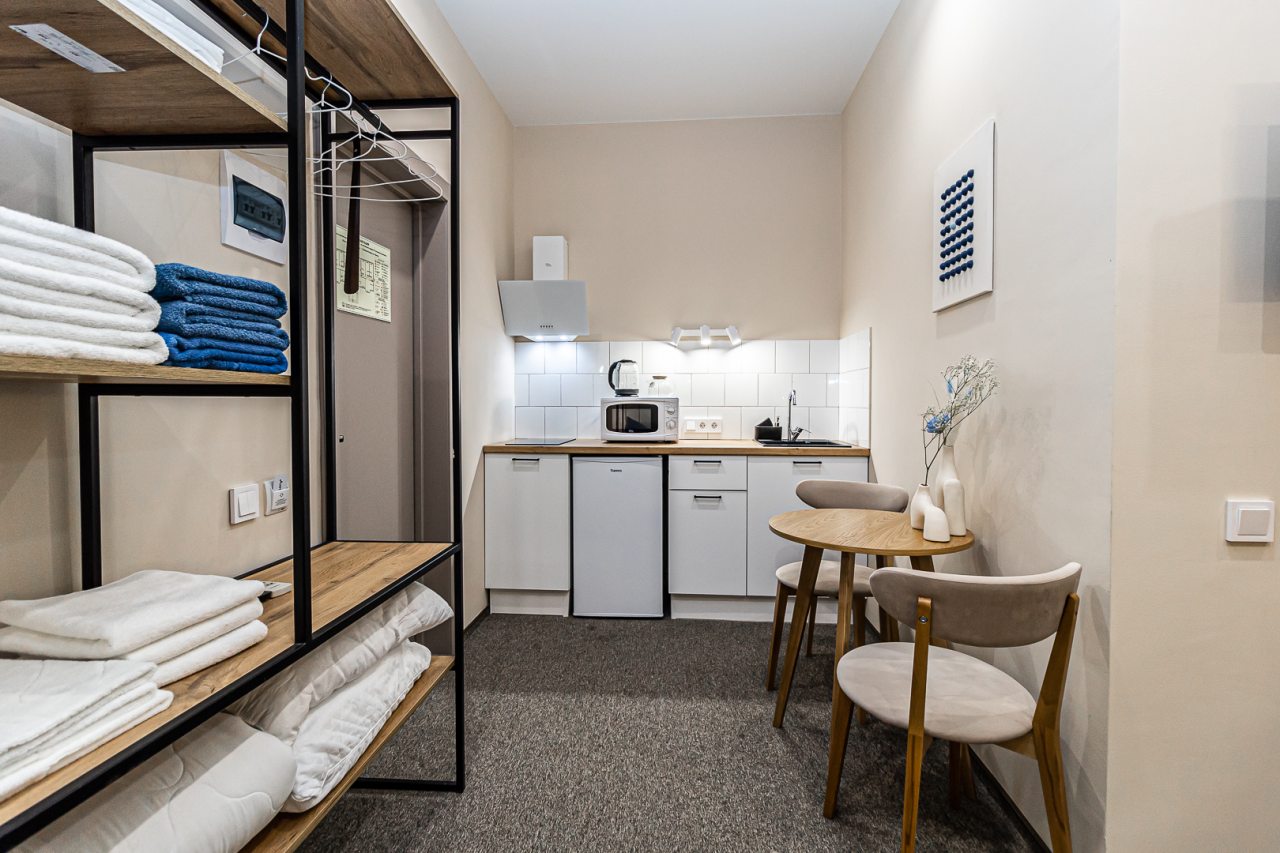 В номере есть кухня, оснащённая электрическим чайником, варочной панелью, всеми нужными приборами. Если же хочется поесть вне отеля, это можно сделать в ресторане «Baklajan».